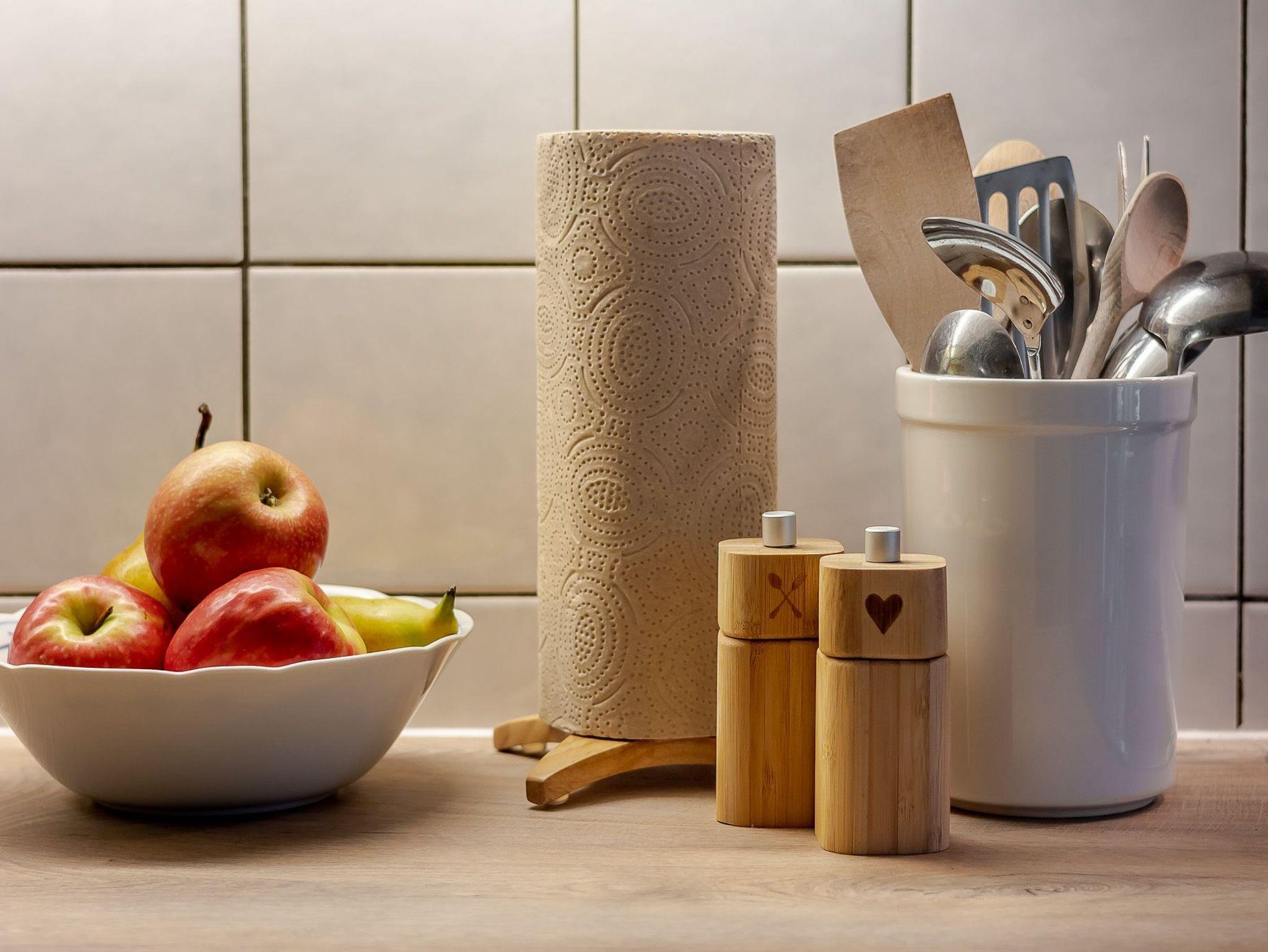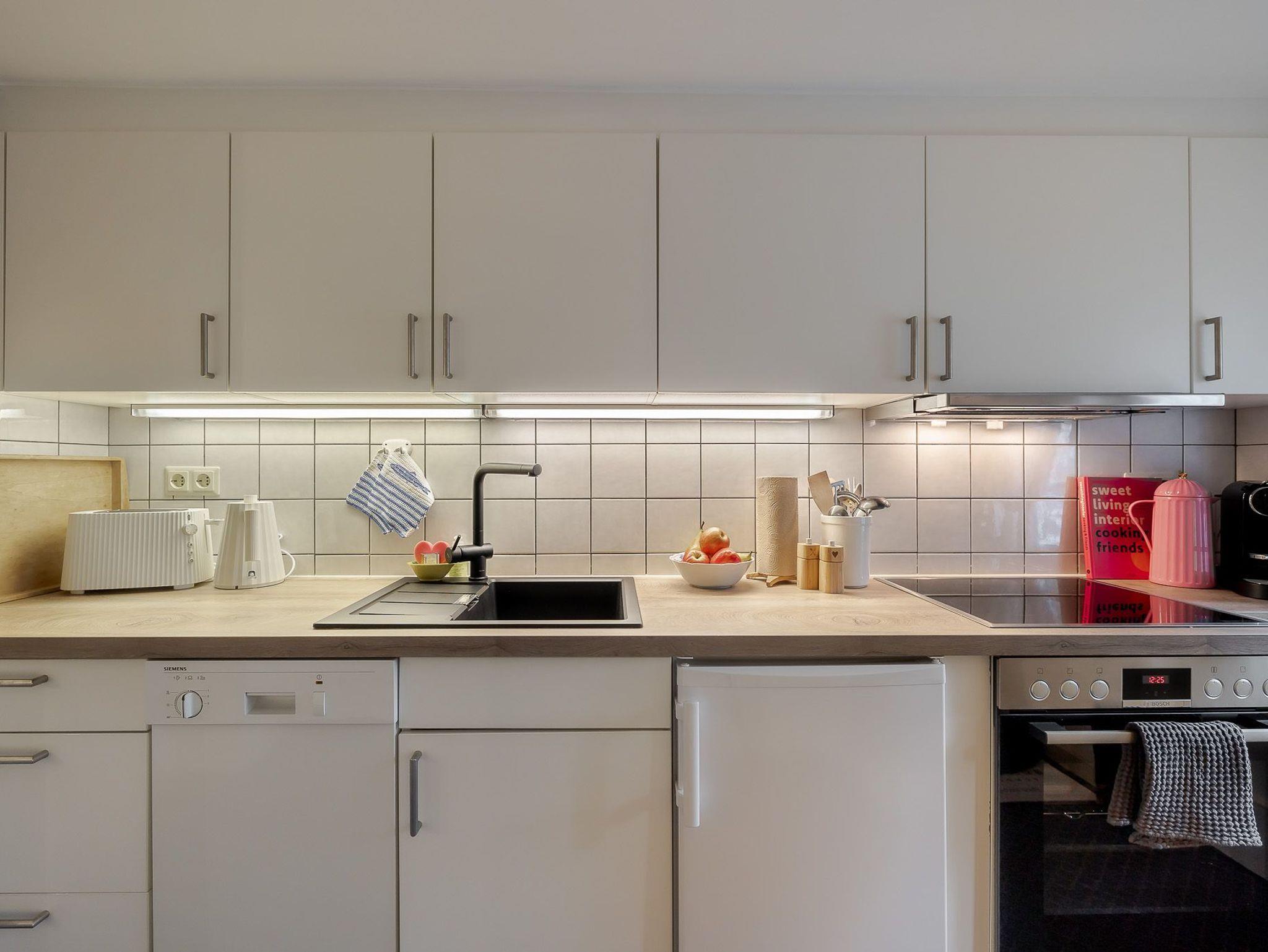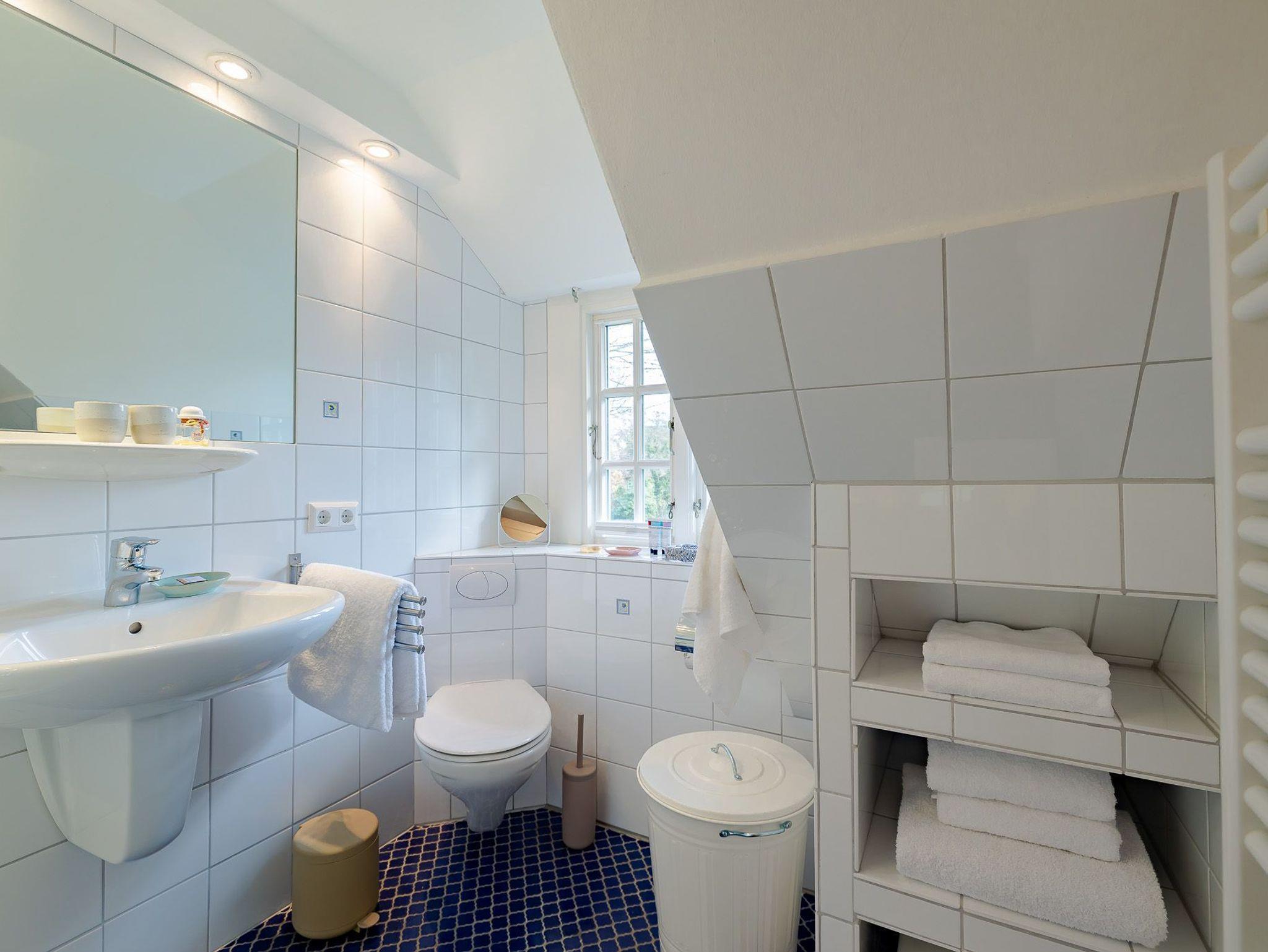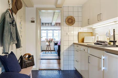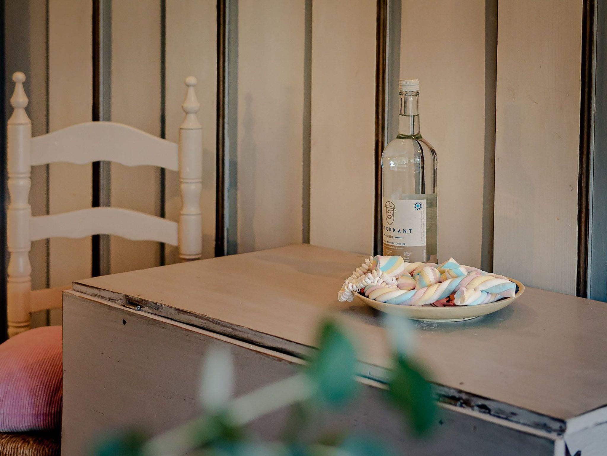 Auf zwei Stockwerken kommt die Mischung des alten Charmes und der modernen Einrichtung gut zur Geltung. Wenn Sie hereinkommen, stehen Sie direkt im Flur, wo sich auch die Küchenzeile befindet. Weiter durch können sie es sich im Wohnzimmer auf dem hellblauen Samtsofa gemütlich machen. Die wunderschöne, alte Junghans Uhr verleiht dem Raum einen ganz besonderen Charme und ist ein echter Hingucker. Auf der oberen Etage finden Sie das Schlafzimmer mit zwei gemütlichen Einzelbetten, direkt gegenüber befindet sich das Badezimmer mit Fenster und einer Dusche.
