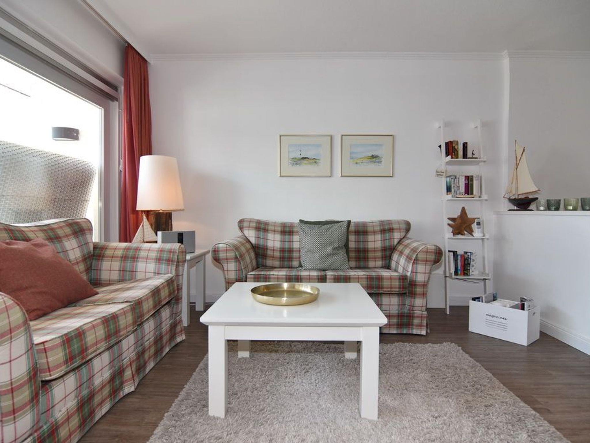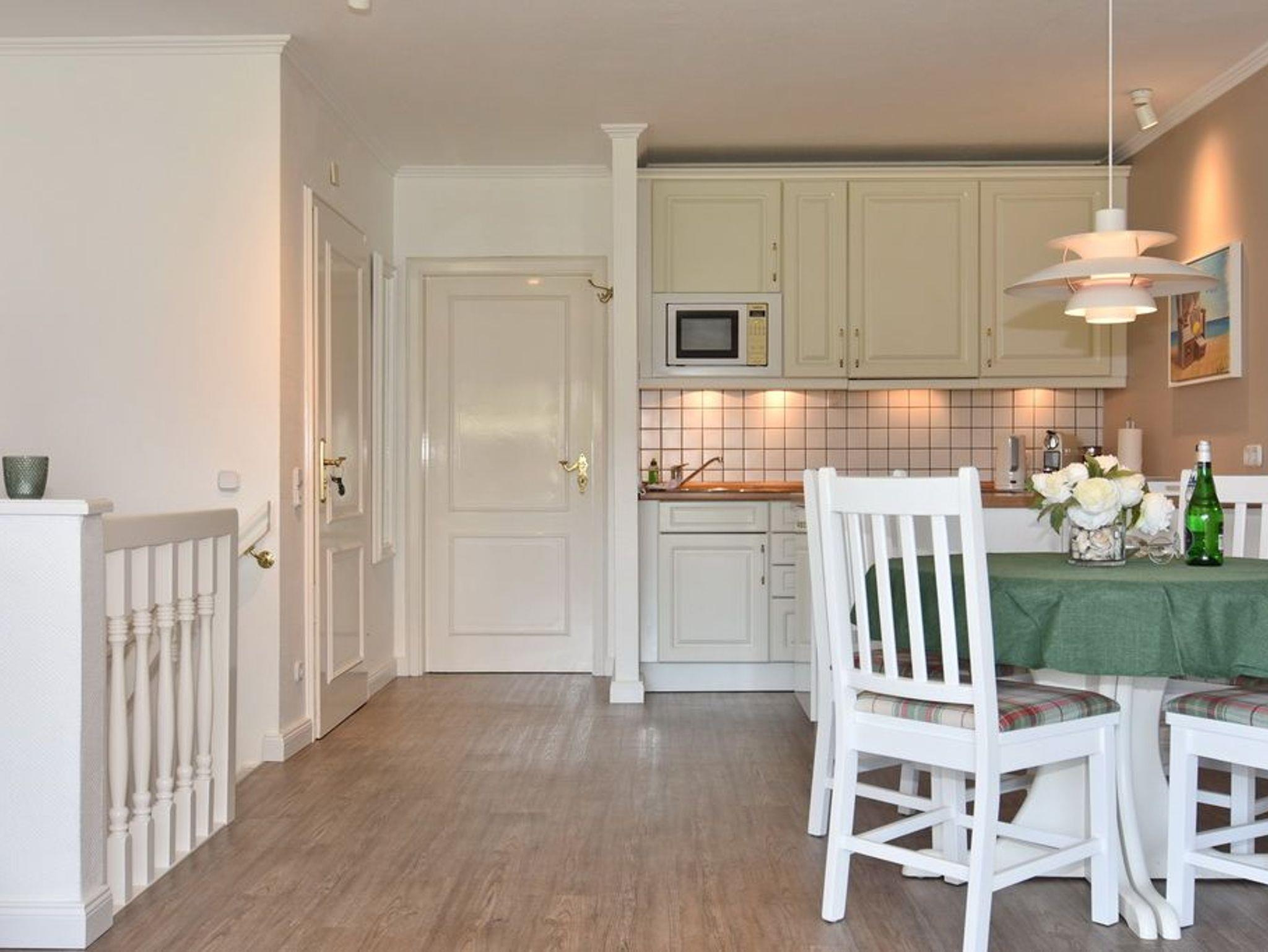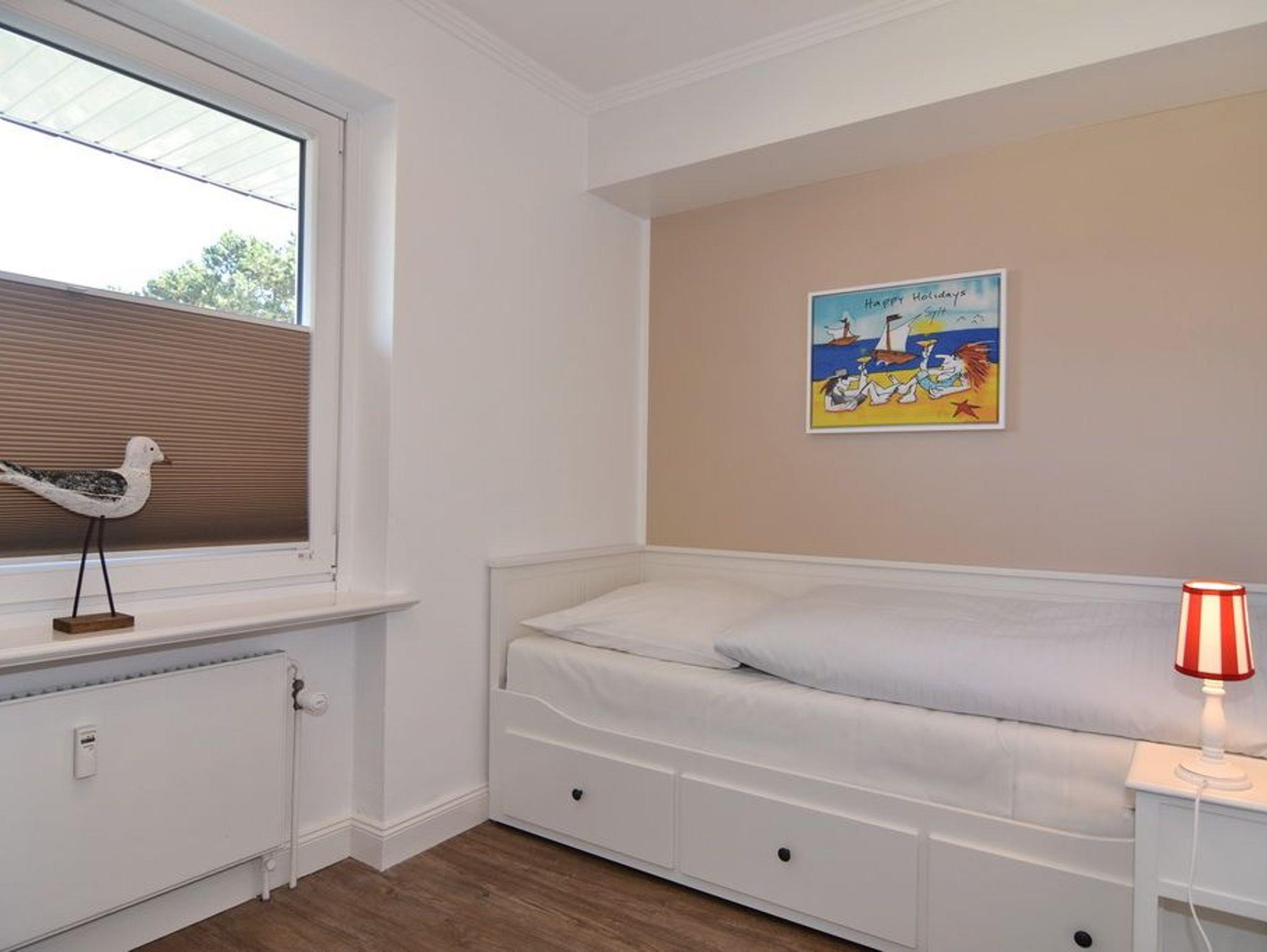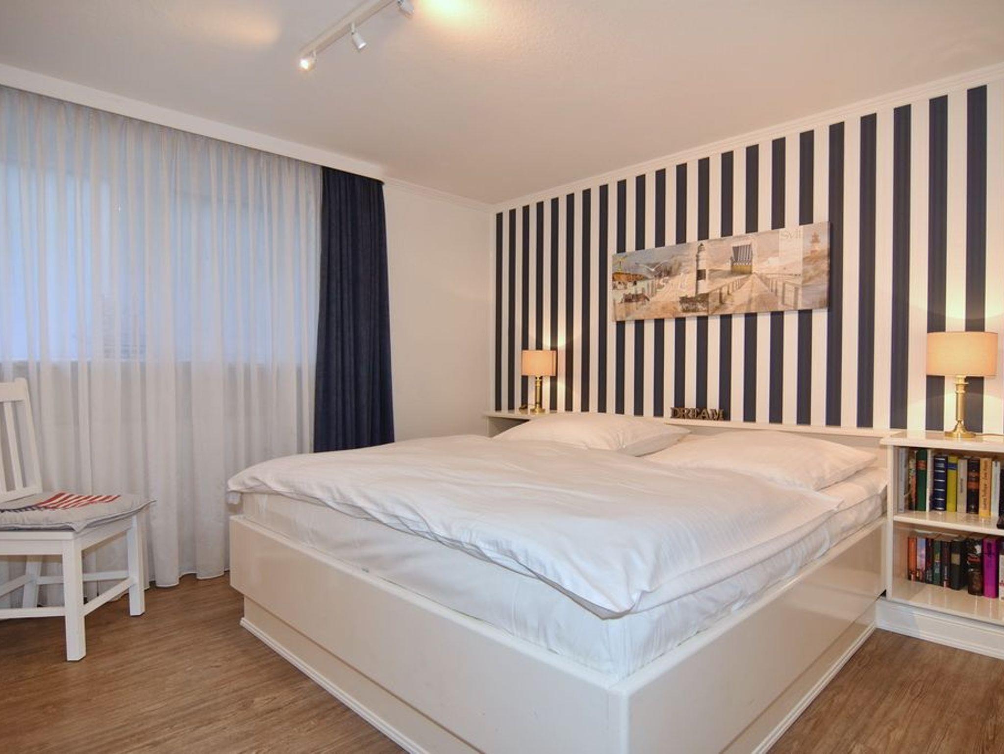 Im Erdgeschoss befindet sich das ca. 30?m² große Wohnzimmer mit zwei Sofas, Esstisch für vier Personen und offener Küche. Die Küche ist zusätzlich mit Mikrowelle, Geschirrspüler, Heißluftfritteuse und Nespresso-Maschine ausgestattet. Ein Smart-TV mit Bose Soundbar, DVD-Player, Stereoanlage mit Bluetooth sowie WLAN mit 175?Mbit/s stehen zur Verfügung. Die nach Süden ausgerichtete Terrasse ist vollständig möbliert und bietet einen Esstisch mit vier Stühlen, einen Strandkorb für zwei Personen sowie einen Sonnenschirm. Im Außenbereich stehen mehrere Fahrradständer zur Verfügung. Auf derselben Etage liegt ein kleines Schlafzimmer mit ausziehbarem Doppelbett und Kleiderschrank. Alle Räume verfügen über Verdunkelungsmöglichkeiten. Über eine Treppe gelangt man ins Untergeschoss mit einem großen Schlafzimmer (Doppelbett, Einbauschrank, TV), einem Duschbad und separatem WC. Im gesamten Untergeschoss sorgt eine Fußbodenheizung für angenehmen Komfort. Ein kostenfreier Pkw-Stellplatz (Nr.?5) befindet sich direkt am Haus. Haustiere sind nicht erlaubt. Eine gemeinschaftliche Waschküche mit Waschmaschine und Trockner steht gegen Gebühr zur Verfügung.