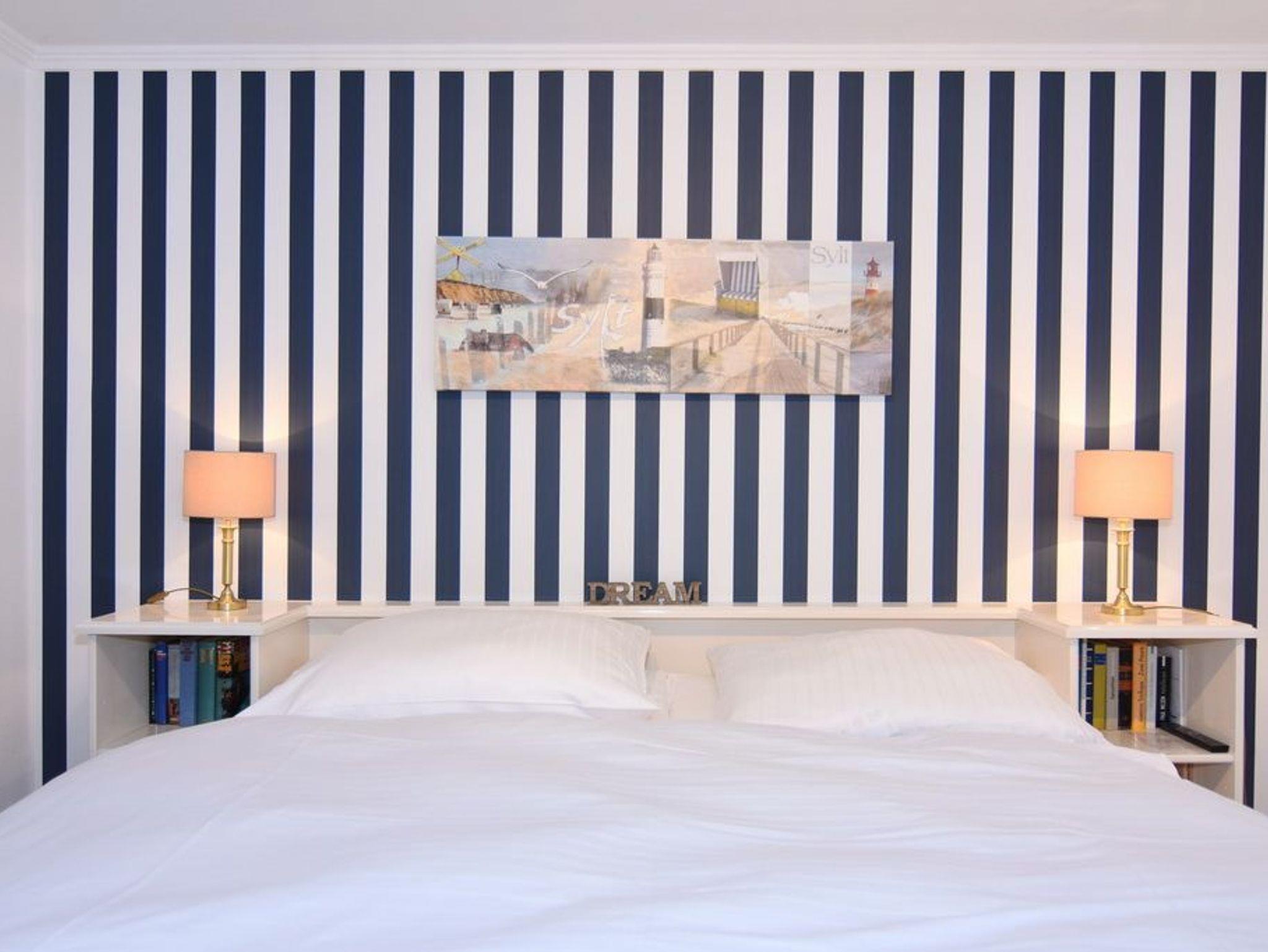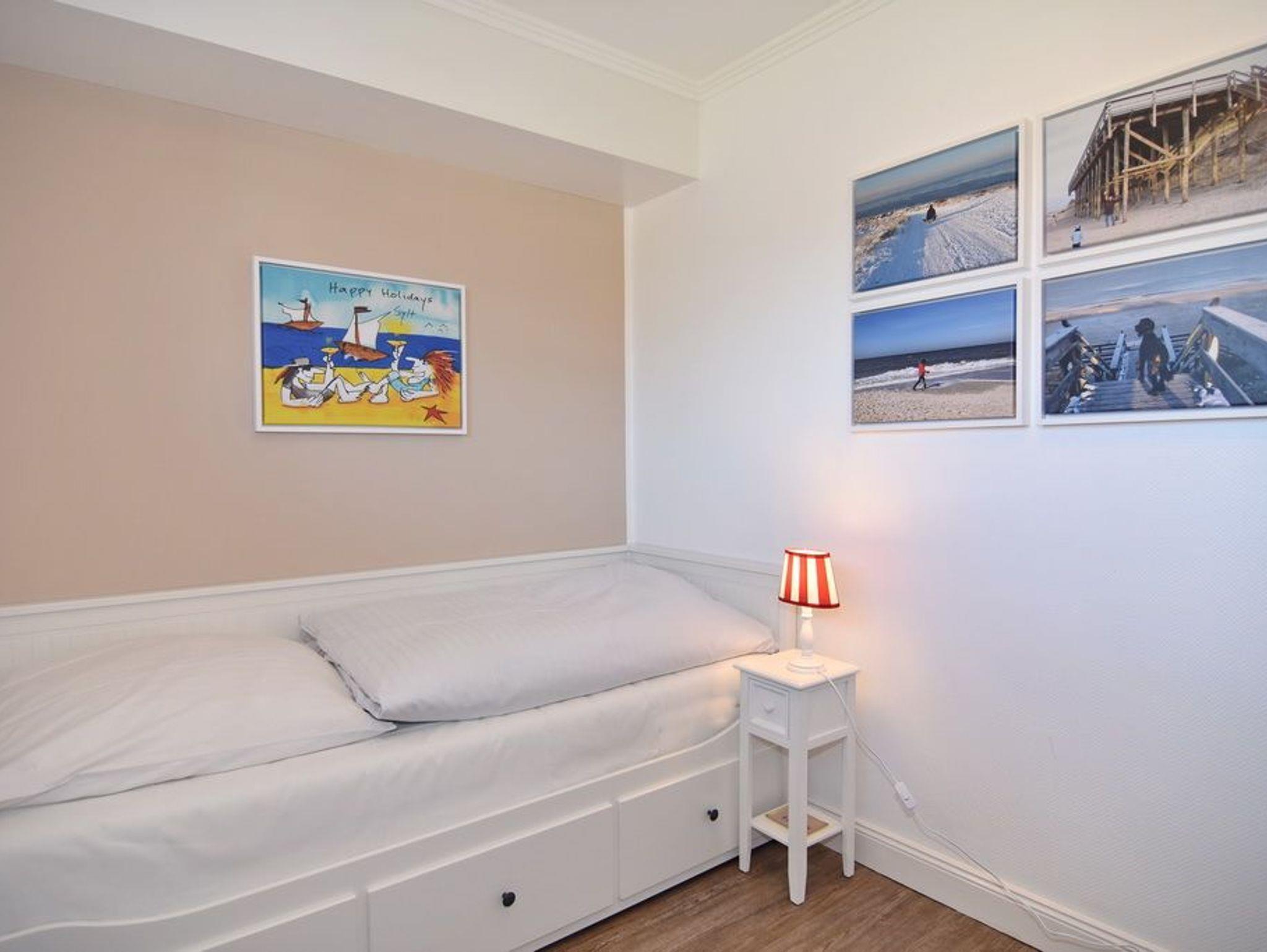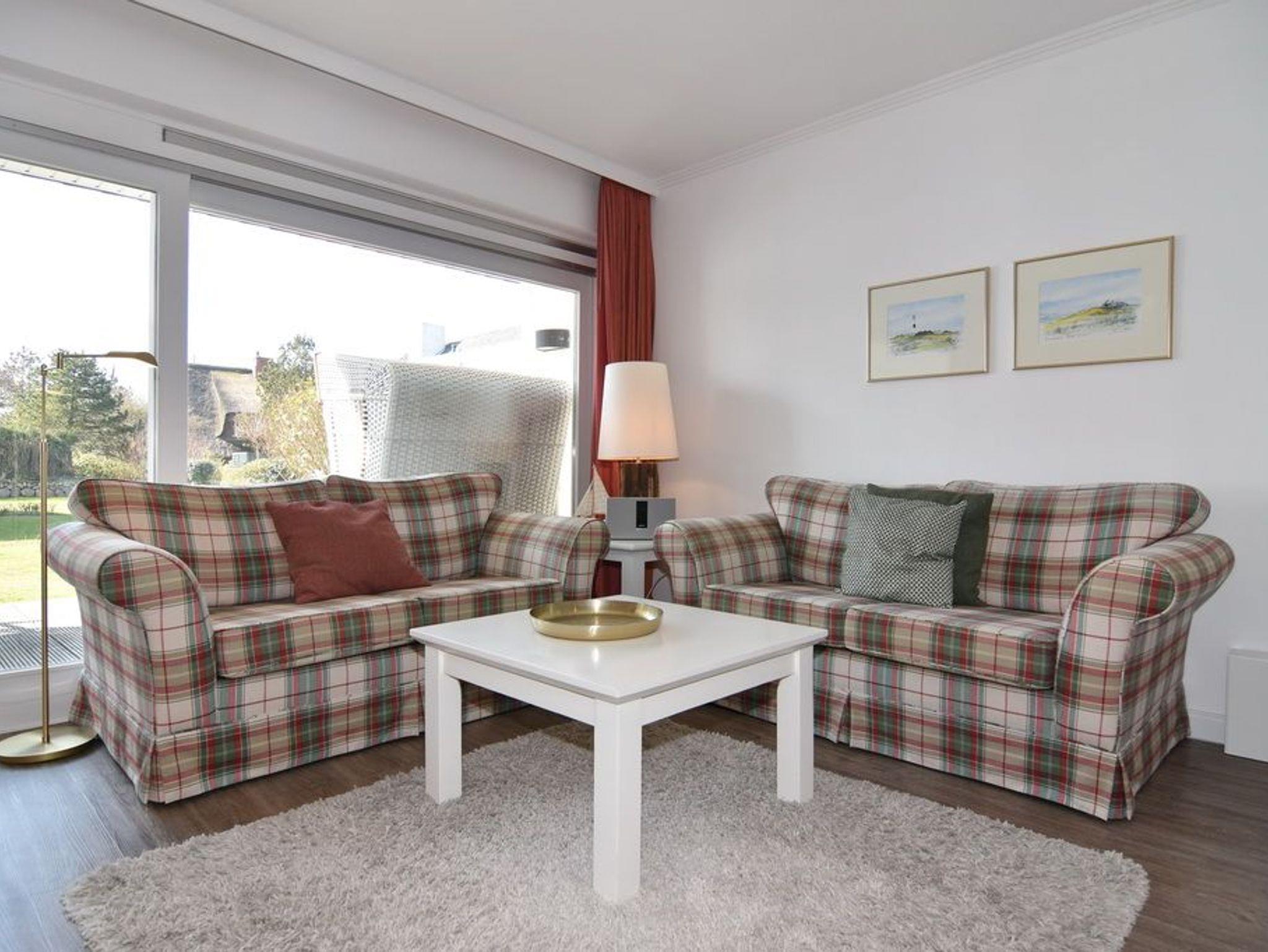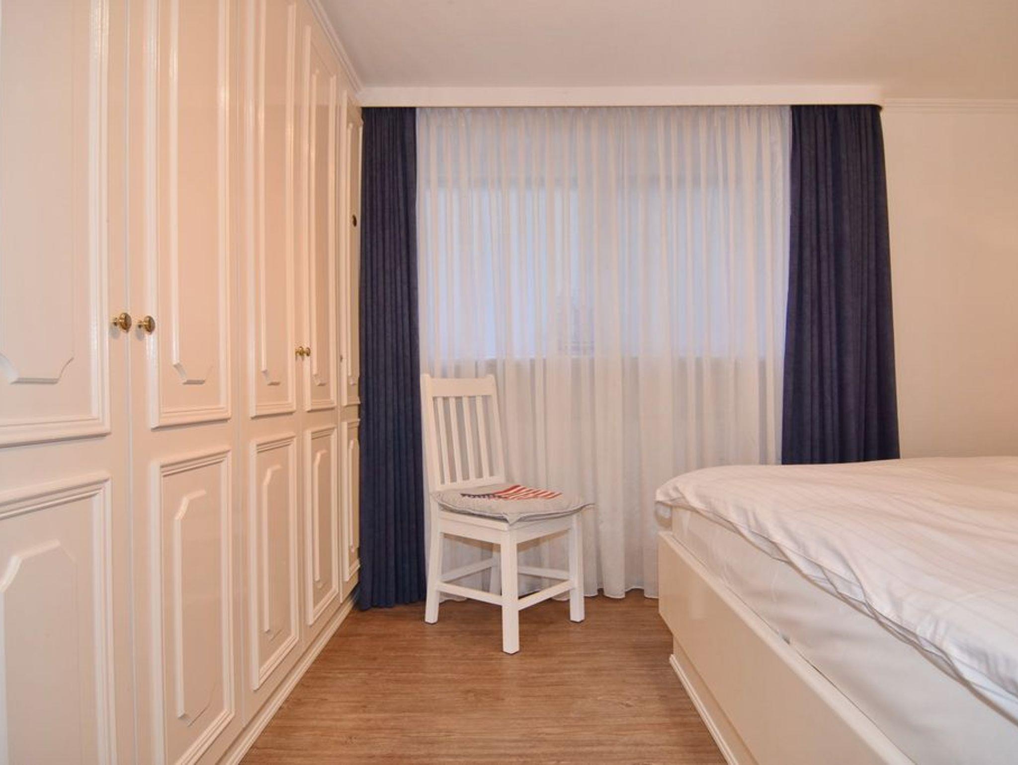 Im Erdgeschoss befindet sich das ca. 30?m² große Wohnzimmer mit zwei Sofas, Esstisch für vier Personen und offener Küche. Die Küche ist zusätzlich mit Mikrowelle, Geschirrspüler, Heißluftfritteuse und Nespresso-Maschine ausgestattet. Ein Smart-TV mit Bose Soundbar, DVD-Player, Stereoanlage mit Bluetooth sowie WLAN mit 175?Mbit/s stehen zur Verfügung. Die nach Süden ausgerichtete Terrasse ist vollständig möbliert und bietet einen Esstisch mit vier Stühlen, einen Strandkorb für zwei Personen sowie einen Sonnenschirm. Im Außenbereich stehen mehrere Fahrradständer zur Verfügung. Auf derselben Etage liegt ein kleines Schlafzimmer mit ausziehbarem Doppelbett und Kleiderschrank. Alle Räume verfügen über Verdunkelungsmöglichkeiten. Über eine Treppe gelangt man ins Untergeschoss mit einem großen Schlafzimmer (Doppelbett, Einbauschrank, TV), einem Duschbad und separatem WC. Im gesamten Untergeschoss sorgt eine Fußbodenheizung für angenehmen Komfort. Ein kostenfreier Pkw-Stellplatz (Nr.?5) befindet sich direkt am Haus. Haustiere sind nicht erlaubt. Eine gemeinschaftliche Waschküche mit Waschmaschine und Trockner steht gegen Gebühr zur Verfügung.