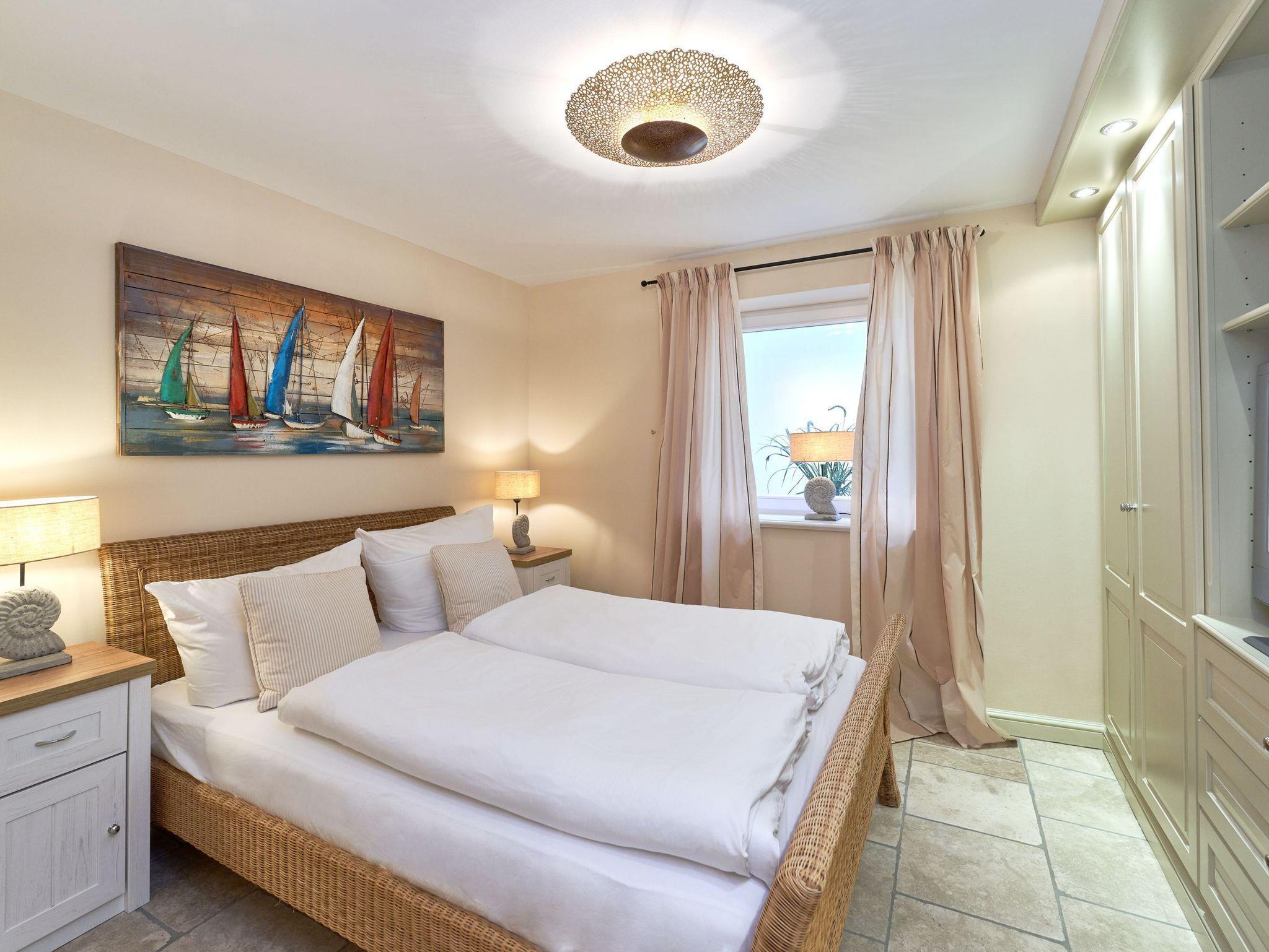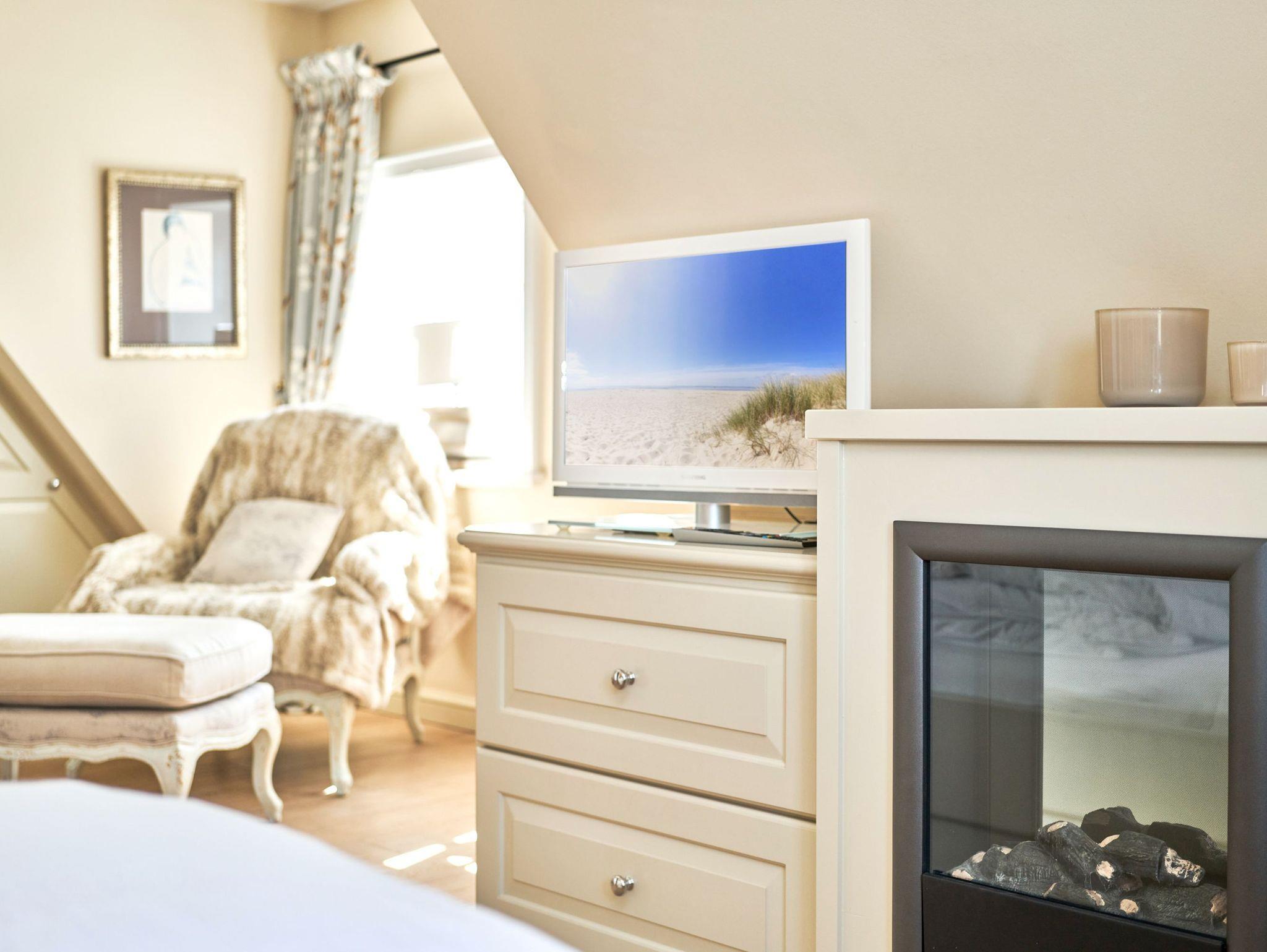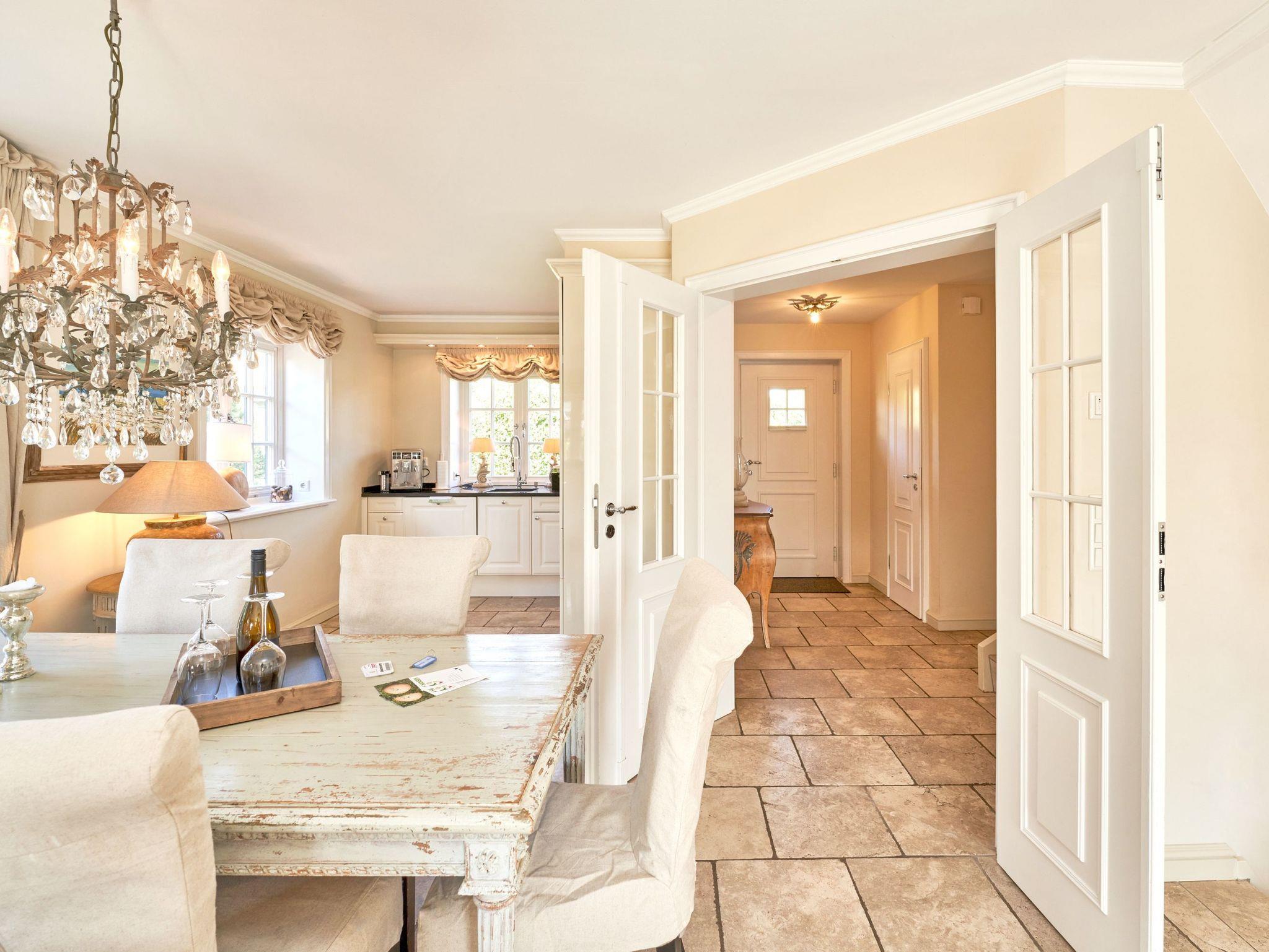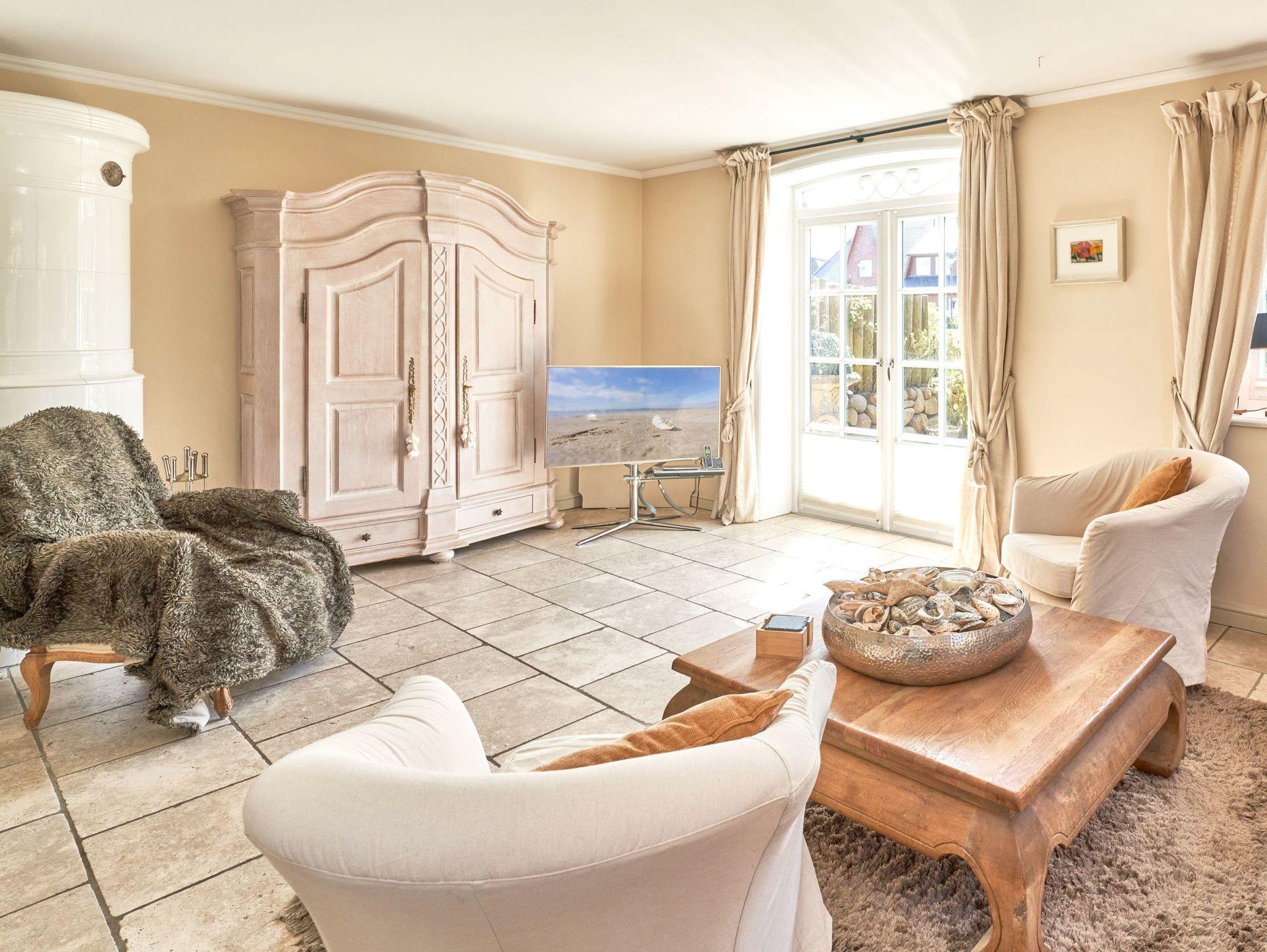 Das Ambiente auf den drei Ebenen des Hauses erfreut durch liebevoll ausgesuchte Ausstattung und im modernen Landhaus Stil. Der lichtdurchflutete Wohnraum, die herrliche Süd-West Terrasse tragen zu ihrem Wohlbefinden bei. Das Sunny Hüs wurde mit sehr viel Liebe zum Detail eingerichtet. Im Erdgeschoss befindet sich die Diele mit seinen großzügigen Garderobenschrank und das angrenzende Gäste - WC. Durch eine Doppeltür betreten Sie ein helles und großzügiges Wohnzimmer mit einem antiken, nordischen Kachelofen, eine offene Küche mit angrenzender Essecke für 6 Personen ist ebenfalls vorhanden. Im Obergeschoss erwartet Sie ein geräumiges Schlafzimmer mit Doppelbett und Schrankeinbauten und der Fußboden ist mit gekelchten Echthausdielen ausgestattet. Außerdem hat das Schlafzimmer noch einen Elektrokamin und verfügt über einen Fernseher. Das angrenzende große Badezimmer mit Dusche und Wanne verfügt noch über ein Waschtisch mit zwei aufgesetzten Waschbecken. Die Diele im Obergeschoss verfügt über einen kleinen separaten Arbeitsplatz und ein Bucherregal. Im Untergeschoss befinden jeweils zwei Schlafzimmer mit einen Doppelbett und Einbauschränken. sowie ein Badzimmer mit Dusche und WC. Für Ihr Wohlbefinden gibt es hier noch eine Sauna mit Glasfront mit Blick in das Badezimmer. Ein kleiner separater Hauswirtschaftraum mit Waschmaschine und Trockner ist ebenfalls vorhanden.