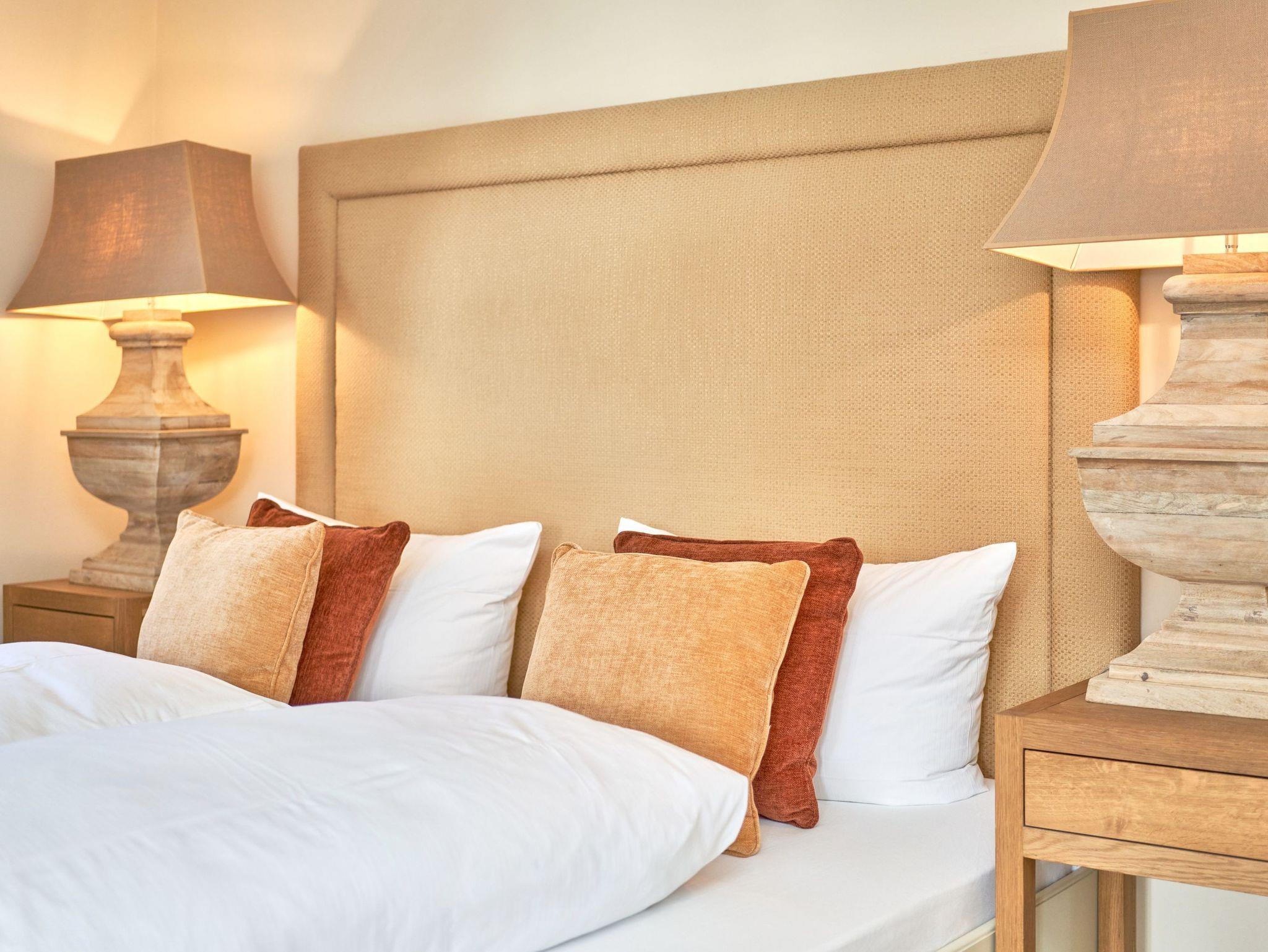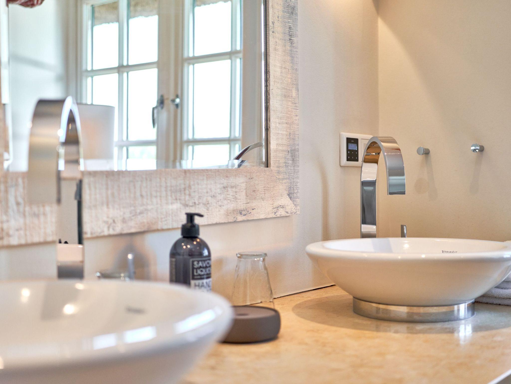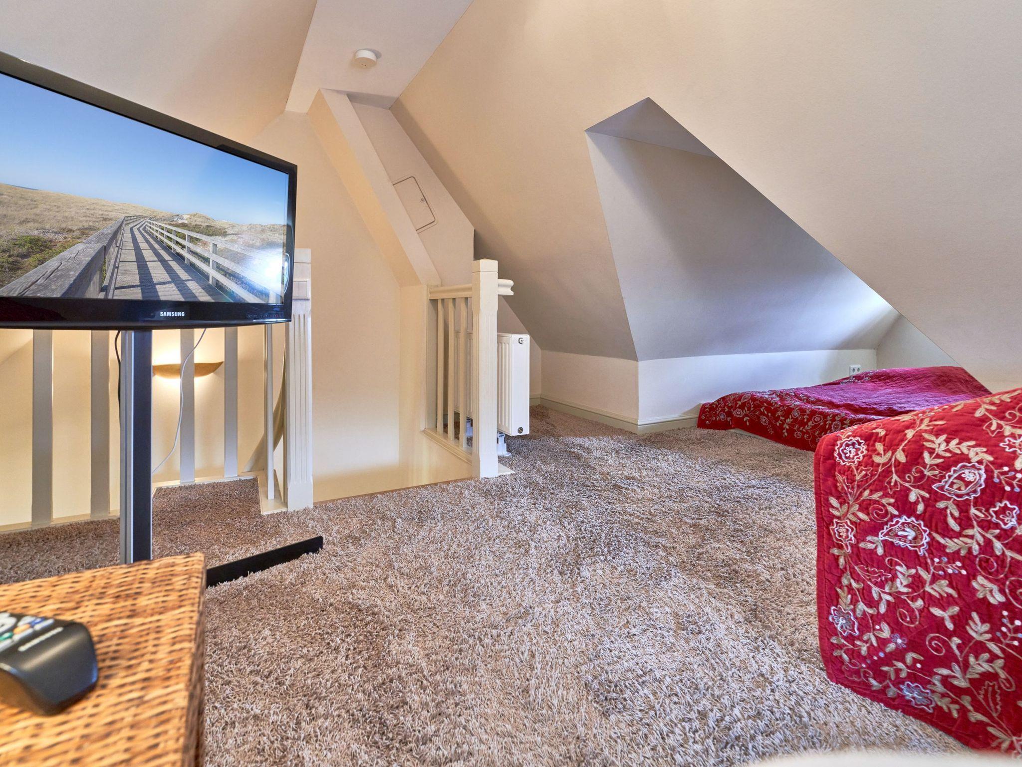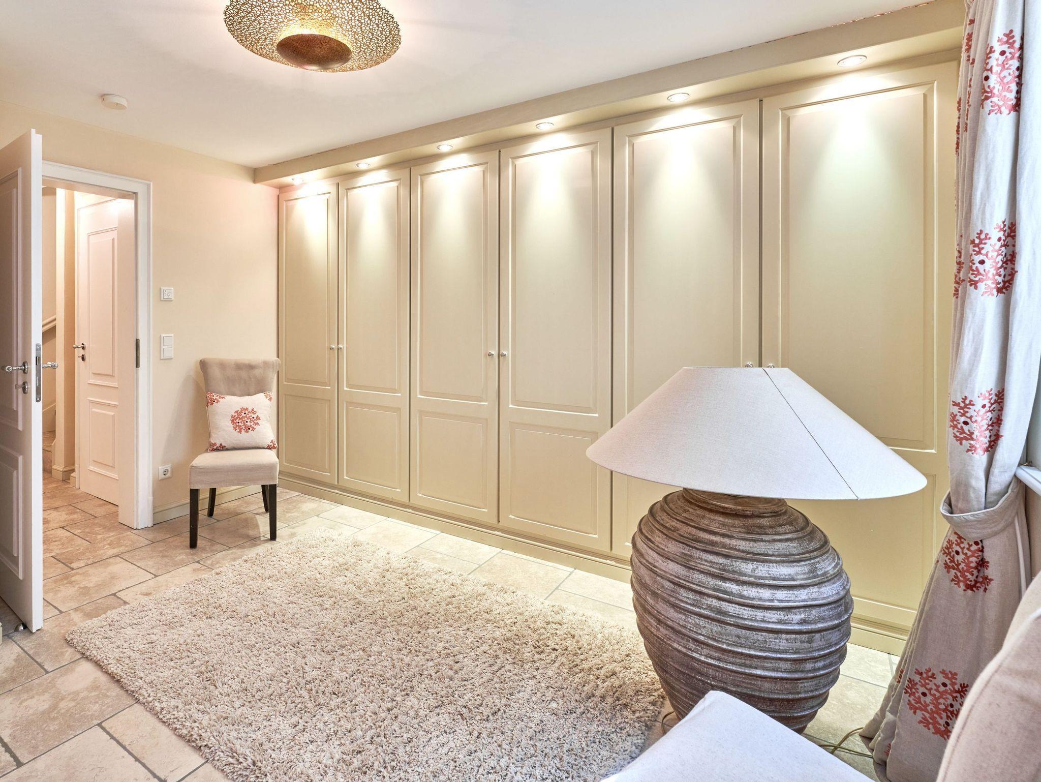 Das Ambiente auf den drei Ebenen des Hauses erfreut durch liebevoll ausgesuchte Ausstattung und im modernen Landhaus Stil. Der lichtdurchflutete Wohnraum, die herrliche Süd-West Terrasse tragen zu ihrem Wohlbefinden bei. Das Sunny Hüs wurde mit sehr viel Liebe zum Detail eingerichtet. Im Erdgeschoss befindet sich die Diele mit seinen großzügigen Garderobenschrank und das angrenzende Gäste - WC. Durch eine Doppeltür betreten Sie ein helles und großzügiges Wohnzimmer mit einem antiken, nordischen Kachelofen, eine offene Küche mit angrenzender Essecke für 6 Personen ist ebenfalls vorhanden. Im Obergeschoss erwartet Sie ein geräumiges Schlafzimmer mit Doppelbett und Schrankeinbauten und der Fußboden ist mit gekelchten Echthausdielen ausgestattet. Außerdem hat das Schlafzimmer noch einen Elektrokamin und verfügt über einen Fernseher. Das angrenzende große Badezimmer mit Dusche und Wanne verfügt noch über ein Waschtisch mit zwei aufgesetzten Waschbecken. Die Diele im Obergeschoss verfügt über einen kleinen separaten Arbeitsplatz und ein Bucherregal. Im Untergeschoss befinden jeweils zwei Schlafzimmer mit einen Doppelbett und Einbauschränken. sowie ein Badzimmer mit Dusche und WC. Für Ihr Wohlbefinden gibt es hier noch eine Sauna mit Glasfront mit Blick in das Badezimmer. Ein kleiner separater Hauswirtschaftraum mit Waschmaschine und Trockner ist ebenfalls vorhanden.