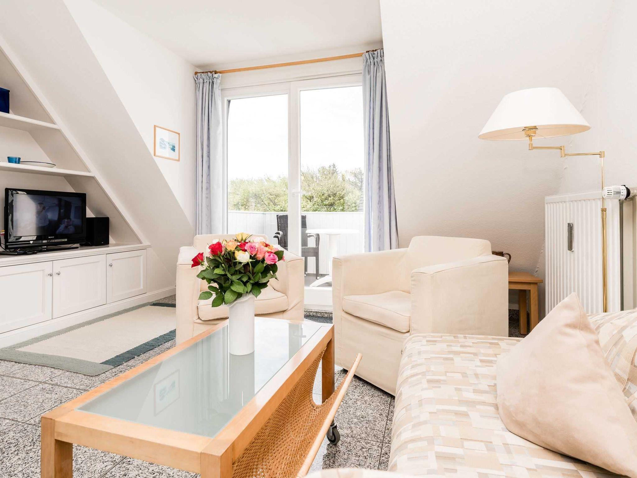 Das Wohnzimmer mit Küchenzeile ist ebenfalls mit Natursteinboden und sonstigen Natursteinbelegen (Tisch und Küchenarbeitsplatte)) versehen. Die Einrichtung im Friesenstil bietet ein behagliches Ambiente, eine kleine Bibliothek sorgt für Abwechslung an Regentagen. Der Balkon mit Sichtschutz zur Nachbarwohnung ist nach Süden ausgerichtet.