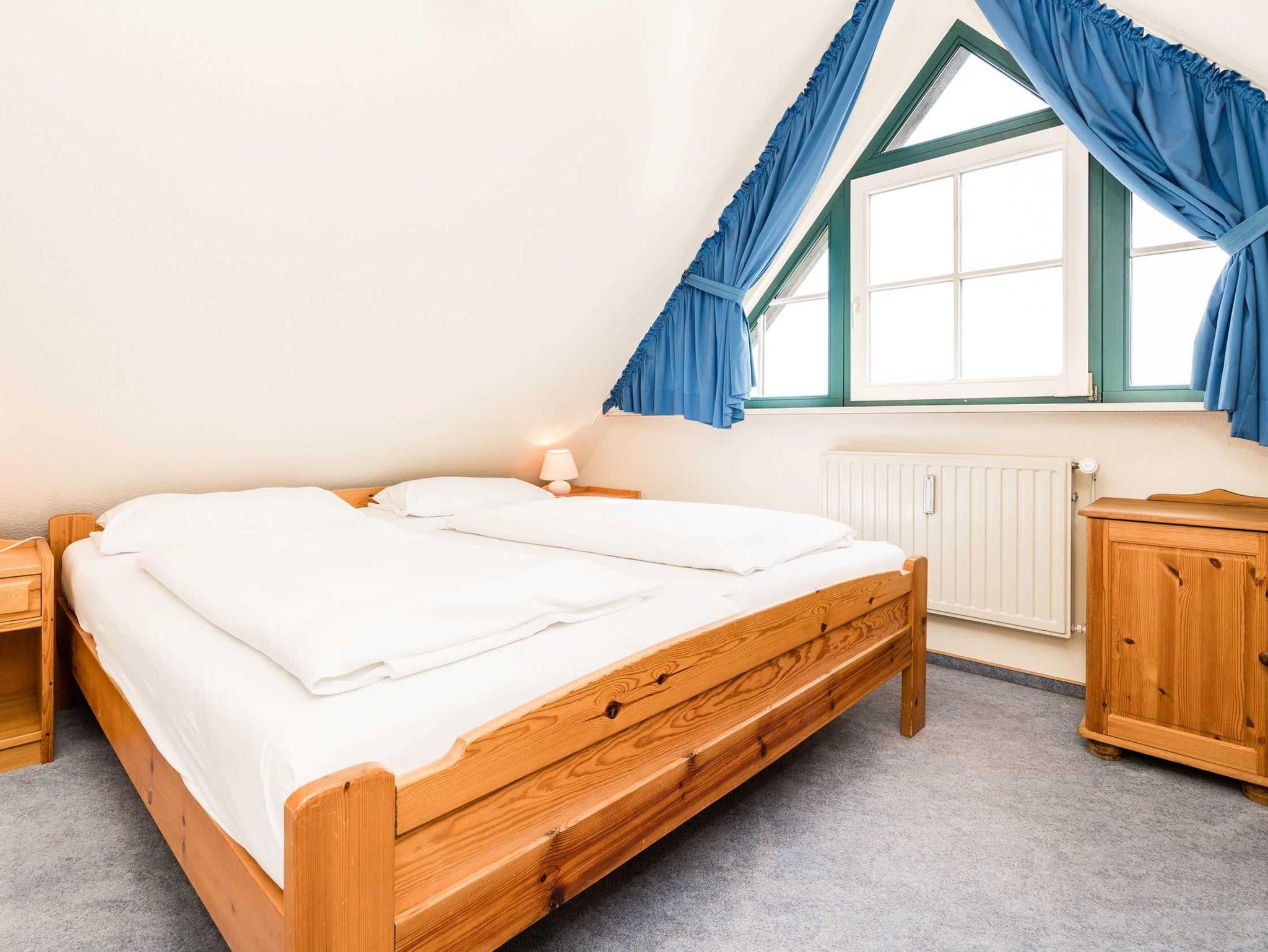 Die Unterkunft verteilt sich über 1. OG und DG. Im 1. OG. finden Sie das lichtdurchflutete Badezimmer, einen Schlafraum mit eingebautem großen Bett und einem Einbauschrank. Der Blick aus diesem Zimmer zeigt am Horizont den Kampener Leuchtturm.
