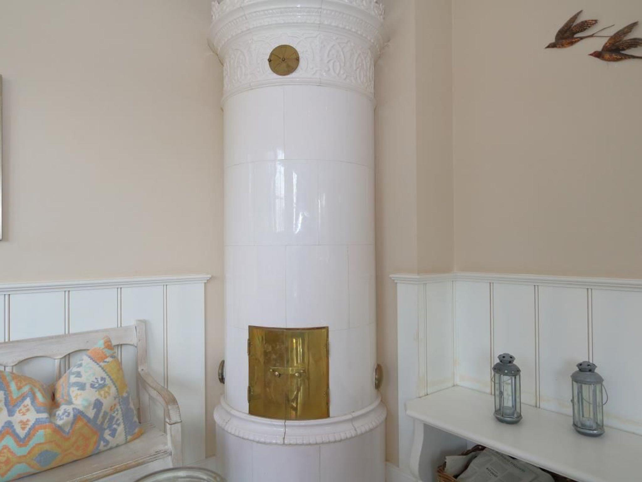 Ein helles Wohnzimmer mit großer Fensterfront zur möblierten Terrasse, Kaminofen. TV SAT/Kabel, Stereoanlage, Sofa.großer Eßtisch mit Bank und gemütlichen Stühlen, Ofen, CD-Player, Bücher, Blu-ray-Player