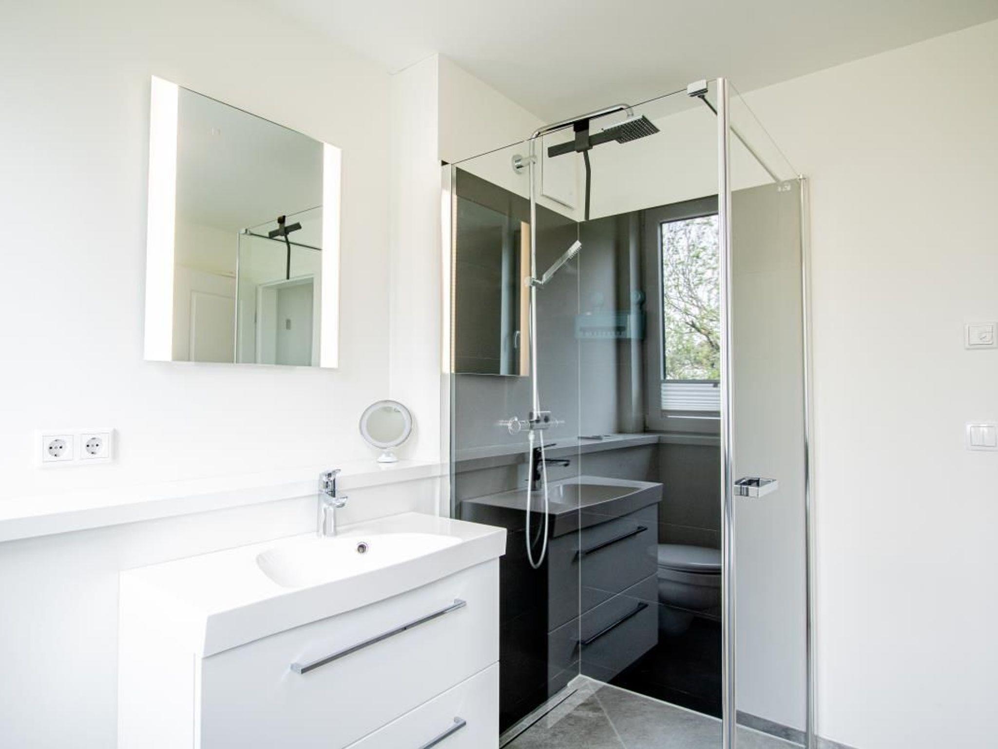 WC, Waschbecken, Fußbodenheizung, Spiegel, Dusche (bodengleich), Ausreichend Handtücher und Vorleger.