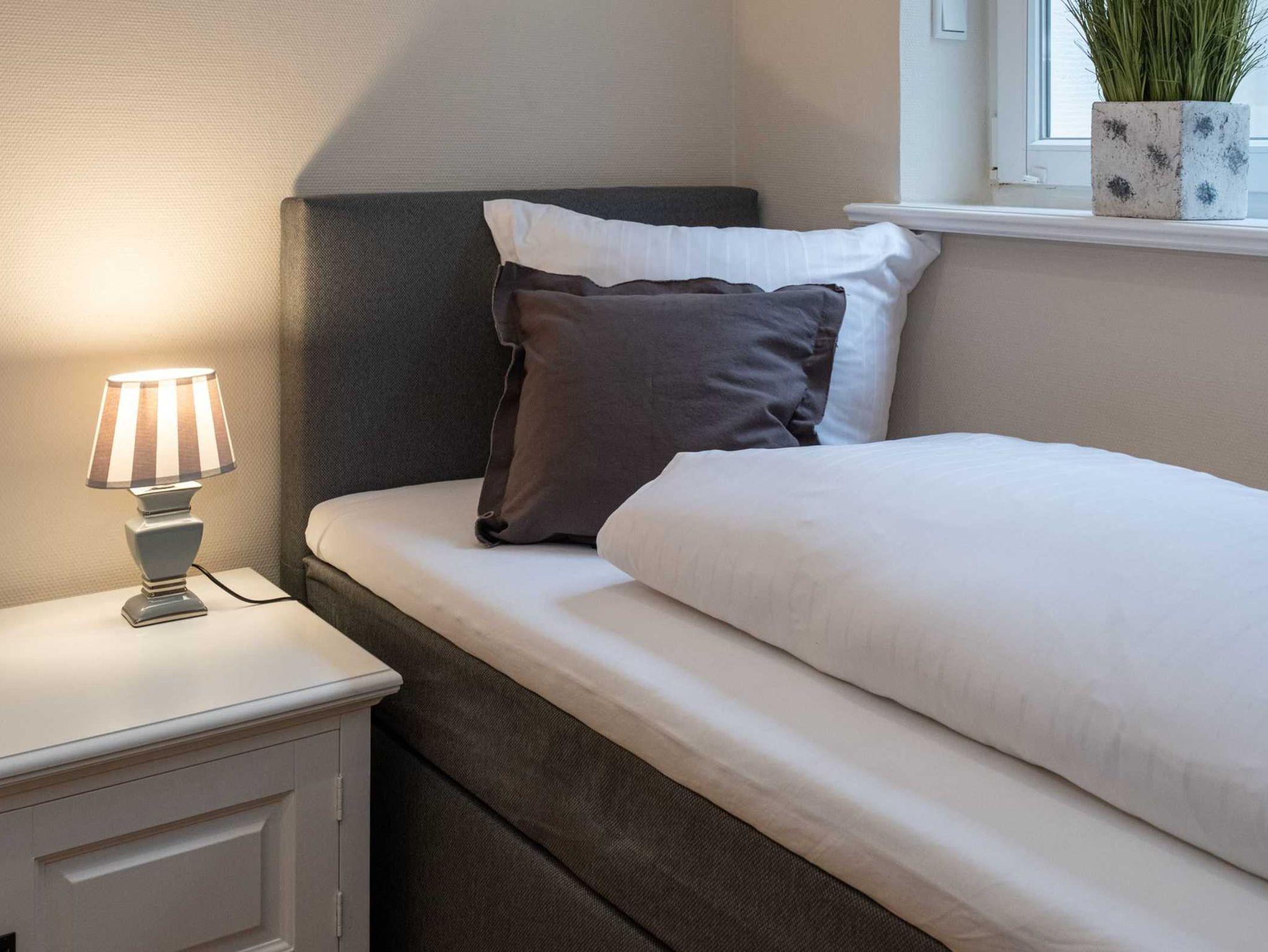 Sie finden zwei Schlafzimmer im Untergeschoss vor, eines mit einem Doppelbett ( 180 x 200 ) und eines mit zwei getrennten Boxspringbetten, die aber bei Bedarf auch zusammen gestellt werden könnten.