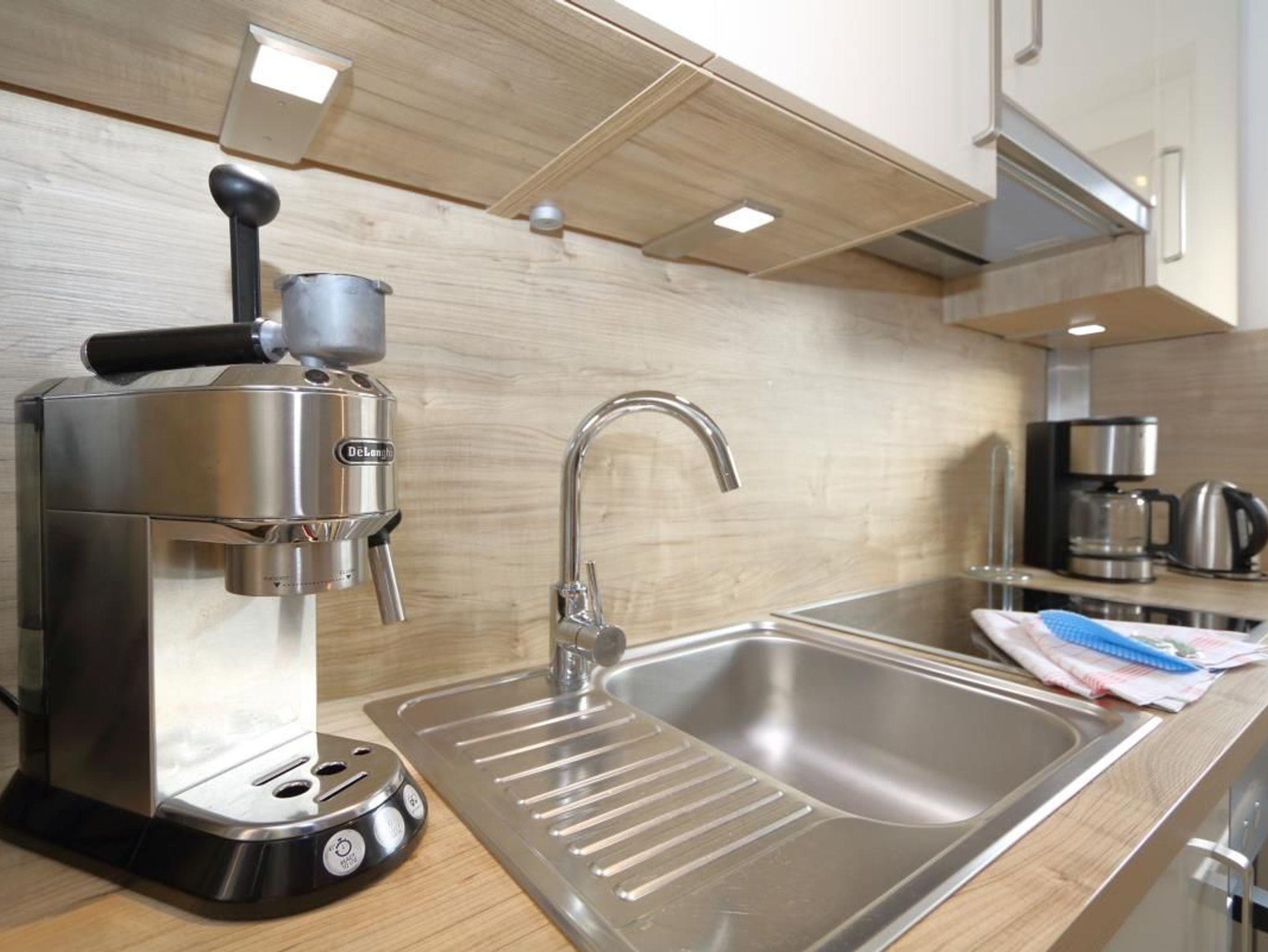 moderne separate Küche, es steht eine Filterkaffeemaschine zur Verfügung.
