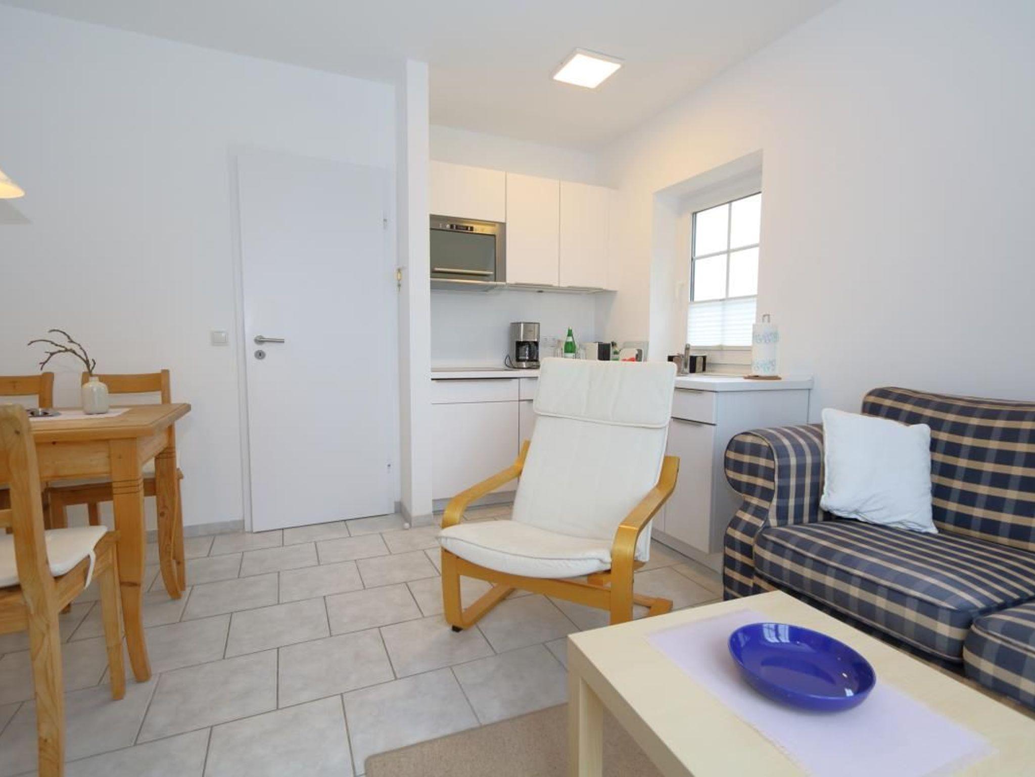 Ein gemütlicher Einrichtungsstiel in hellenm Farben erwartet Sie. Wohnzimmer mit bequemer Sitzgarnitur und Esstisch. Flachbildschirm sowie kostenloses W'Lan