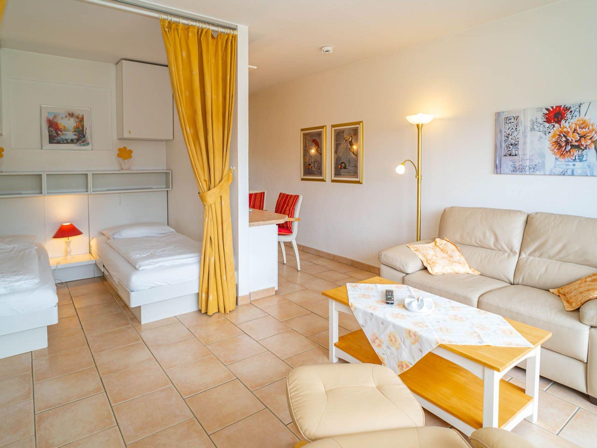 Vom Vorflur gelangt man in das Wohn-/Schlafzimmer (mit Küchenzeile, Schlafnische und Austritt zur Terrasse) und in das Duschbad/WC.