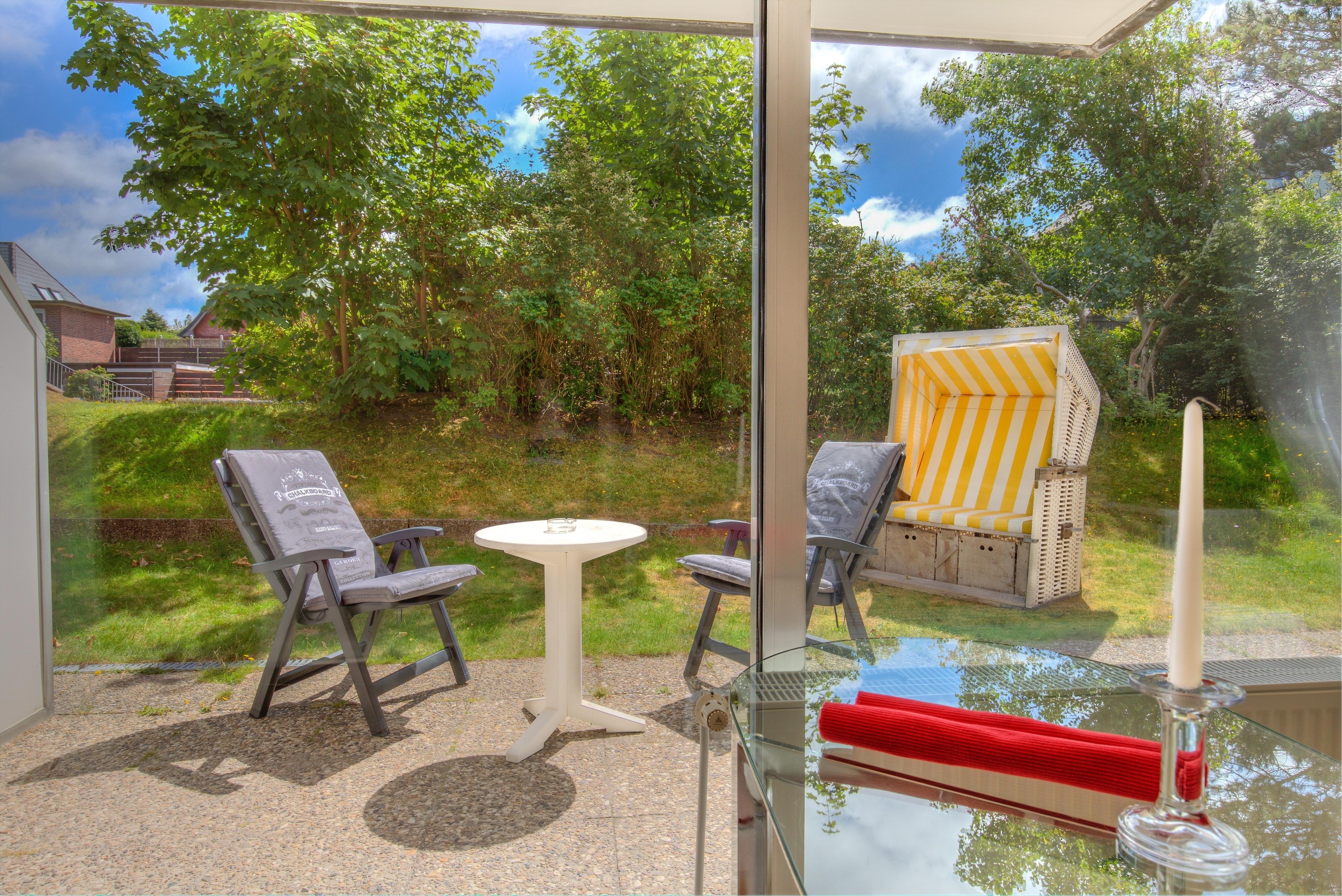 Vom Essplatz erreichen die Terrasse mit Strandkorb und Gartenmöbeln.