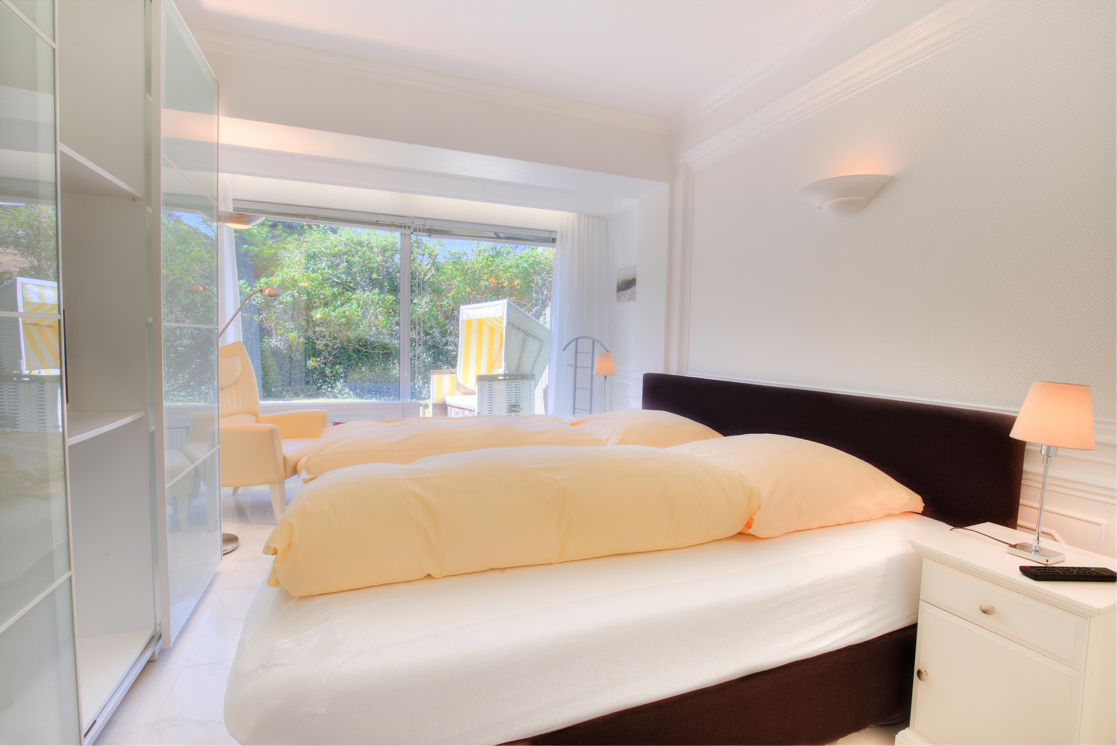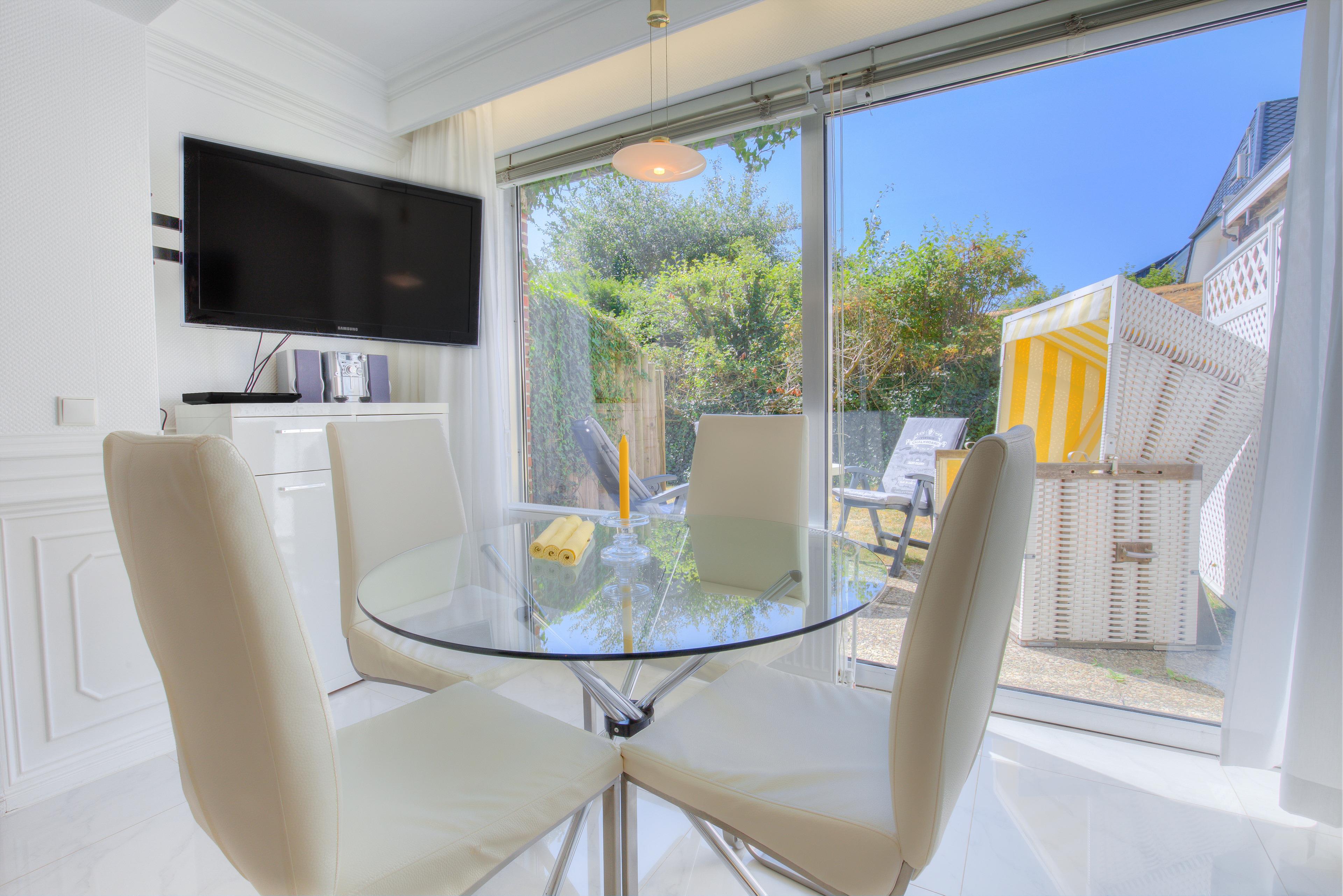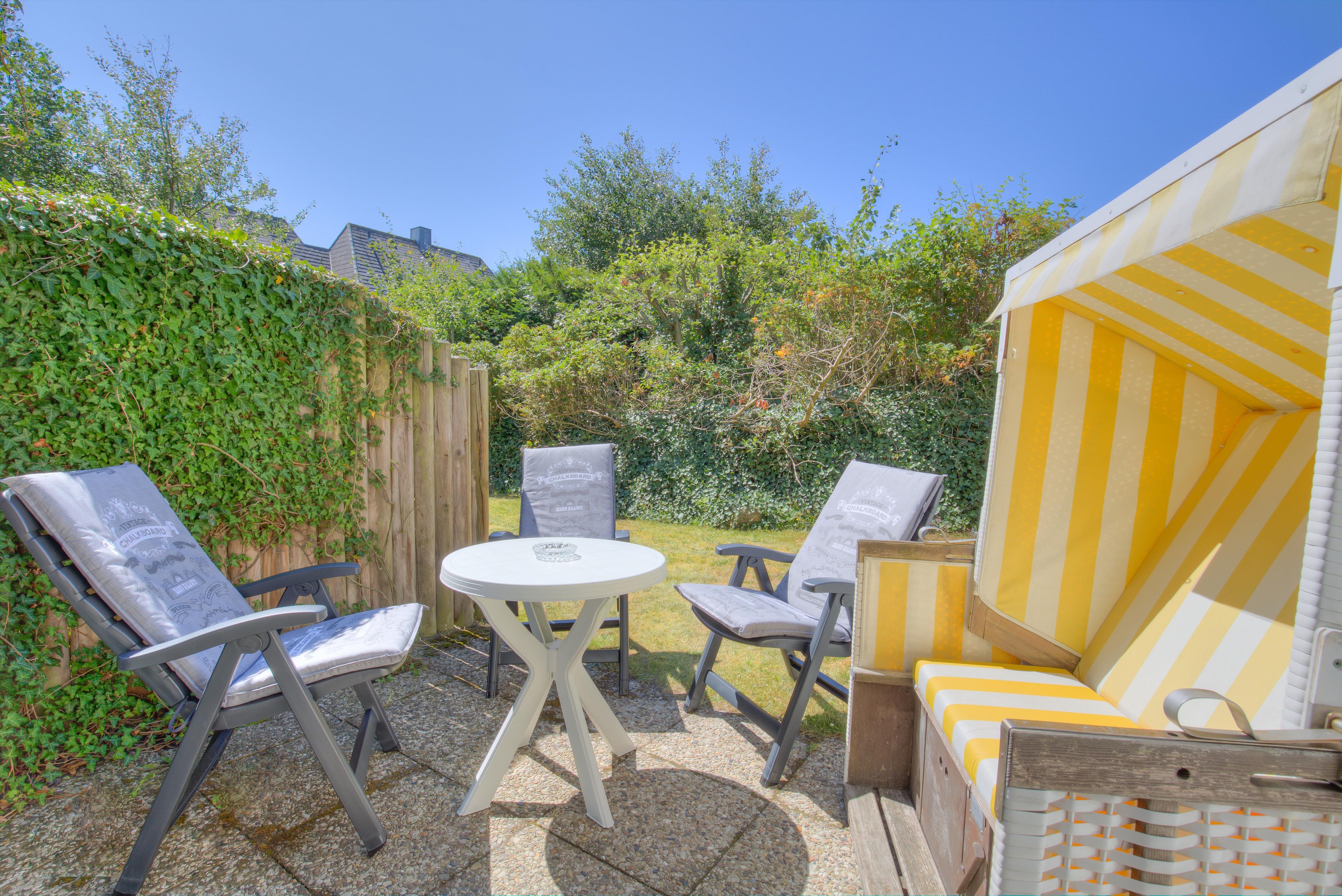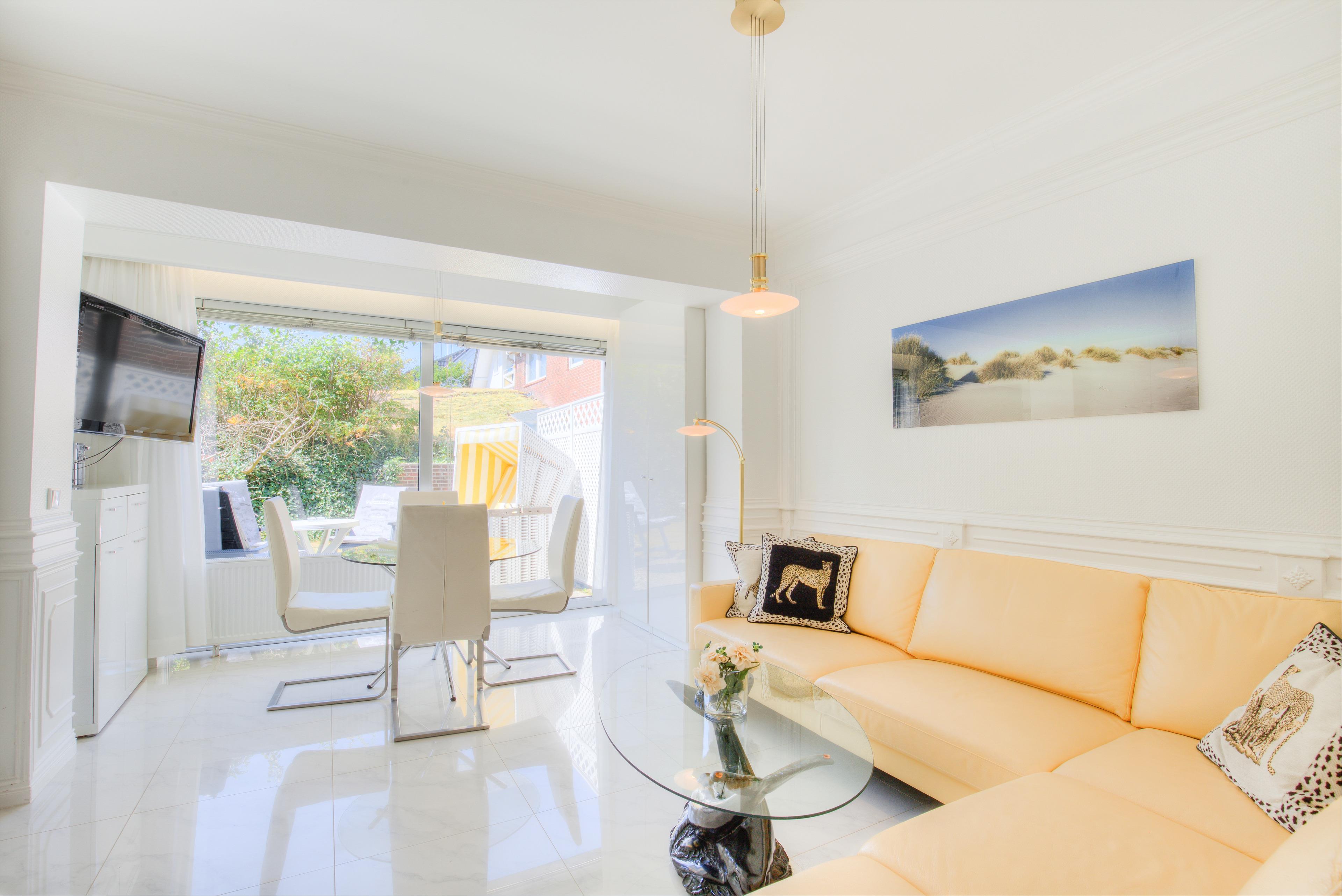 Erleben Sie einen komfortablen Sylt-Urlaub in dieser hellen, ca. 50 m² großen Ferienwohnung für 2 bis 3 Personen. Das lichtdurchflutete, schöne Wohnzimmer mit 2 Schrankbetten lädt mit hochwertigen Polstern und einem Essplatz mit Blick auf die Terrasse zum gemütlichen Verweilen ein. Die integrierte, komplett ausgestattete Küche mit Backofen wird Hobbyköchen sehr gefallen. Im schicken Doppelschlafzimmer mit Boxspringbett und TV können Sie behagliche Fernsehabende verbringen und eingekuschelt den nächsten schönen Urlaubstag planen. Die beiden edlen Bäder sind einmal mit einer großen Dusche und einmal mit einem Whirlpool ausgestattet - Wellness pur. Auf der großen Süd-Westterrasse mit Strandkorb und Gartenmöbeln können Sie die Sylter Sonnenstunden ausgiebig genießen.