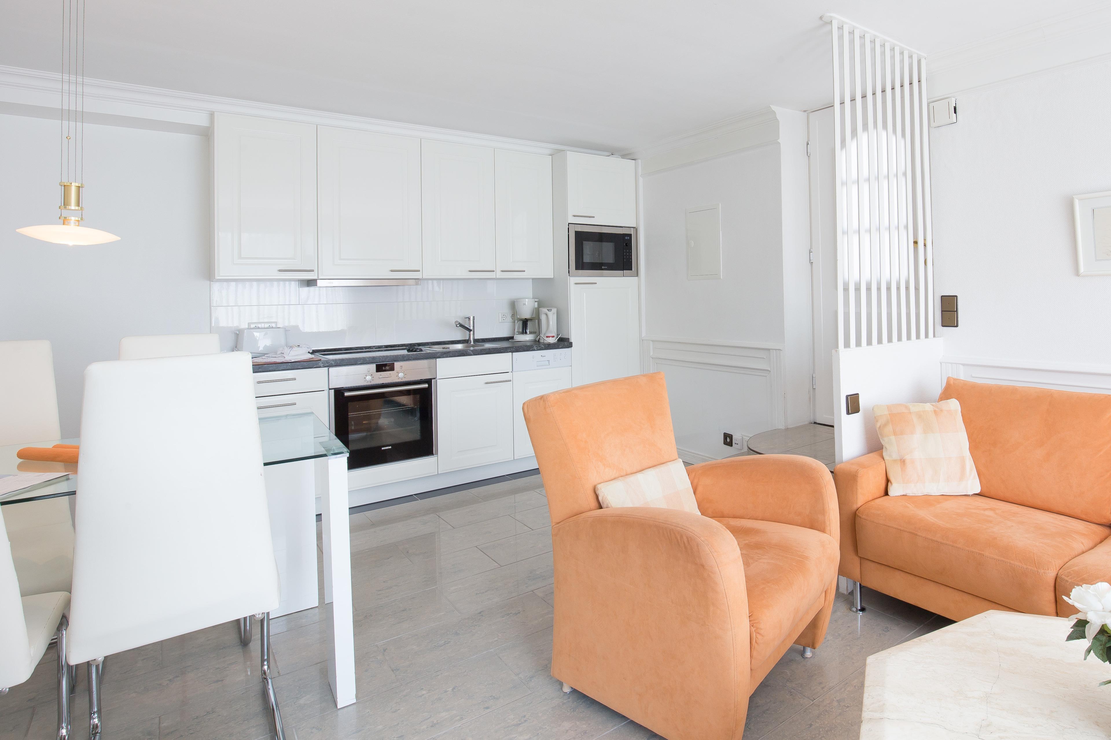 In der voll ausgestatteten Wohnküche mit Geschirrspüler und Backofen können Sie leckere Mahlzeiten zubereiten.