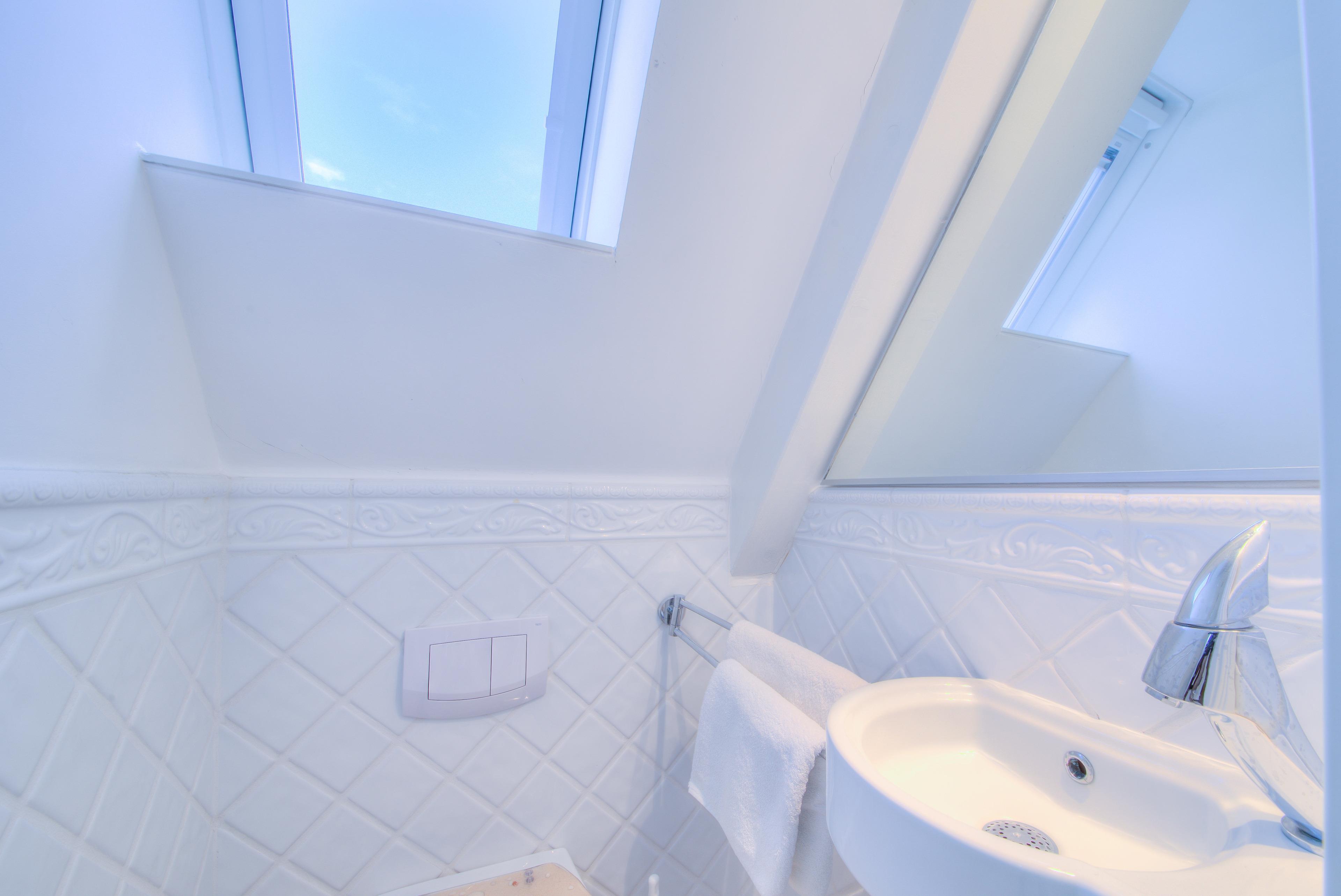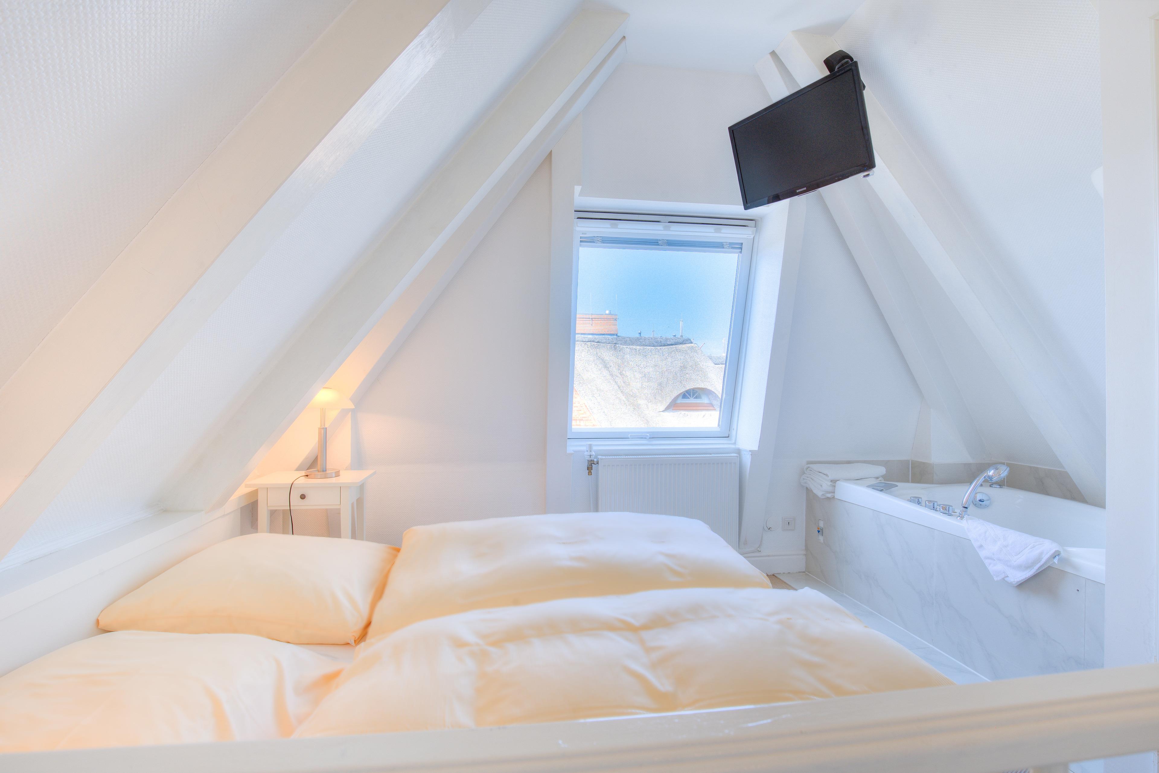 Die gut begehbare, offene Treppe führt in das gemütliche Schlafzimmer mit Doppelbett und Whirlpool. Eine Dusche sowie WC finden Sie ebenfalls separat. Genießen Sie Sylter Luft auf dem schönen Süd-Westbalkon.