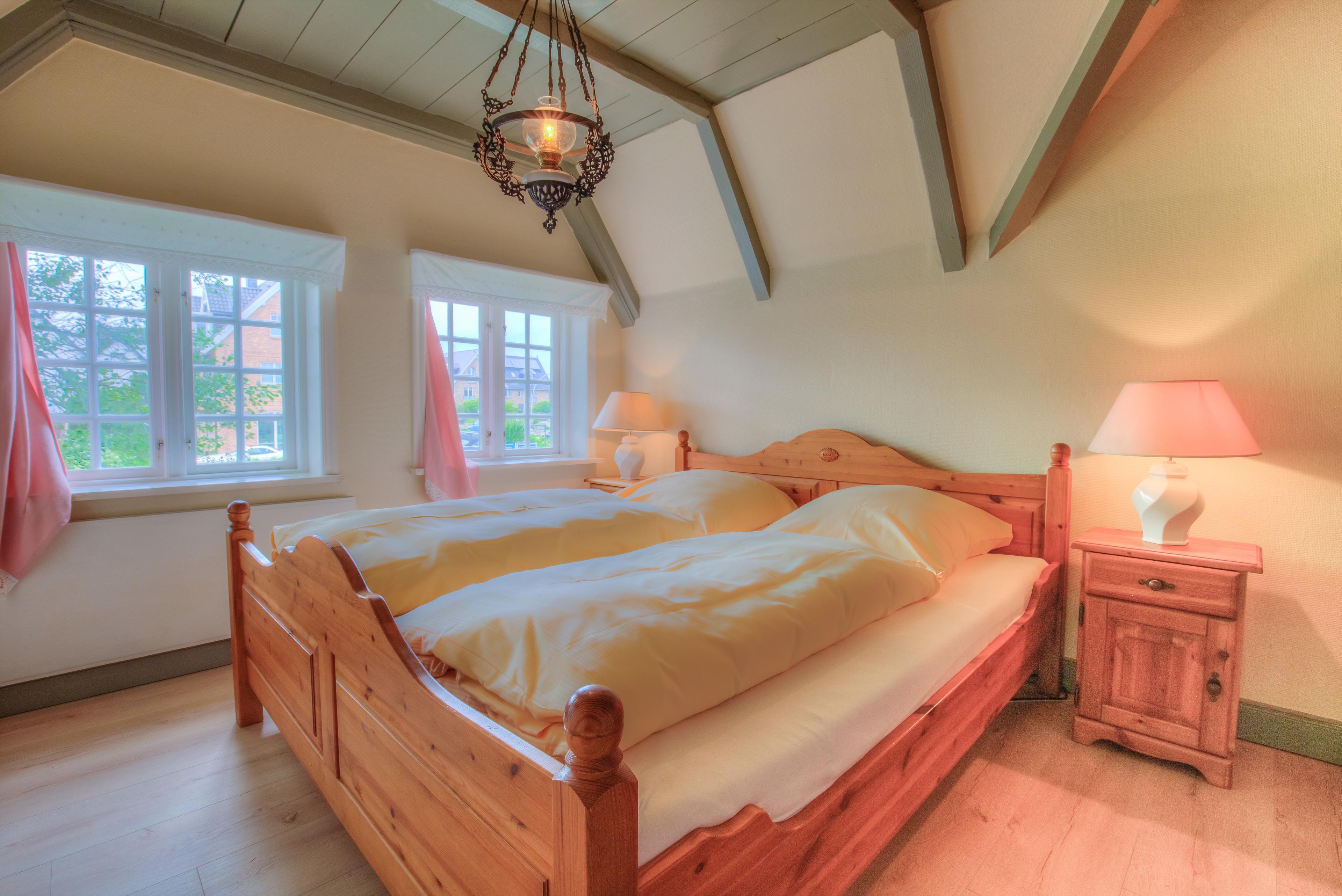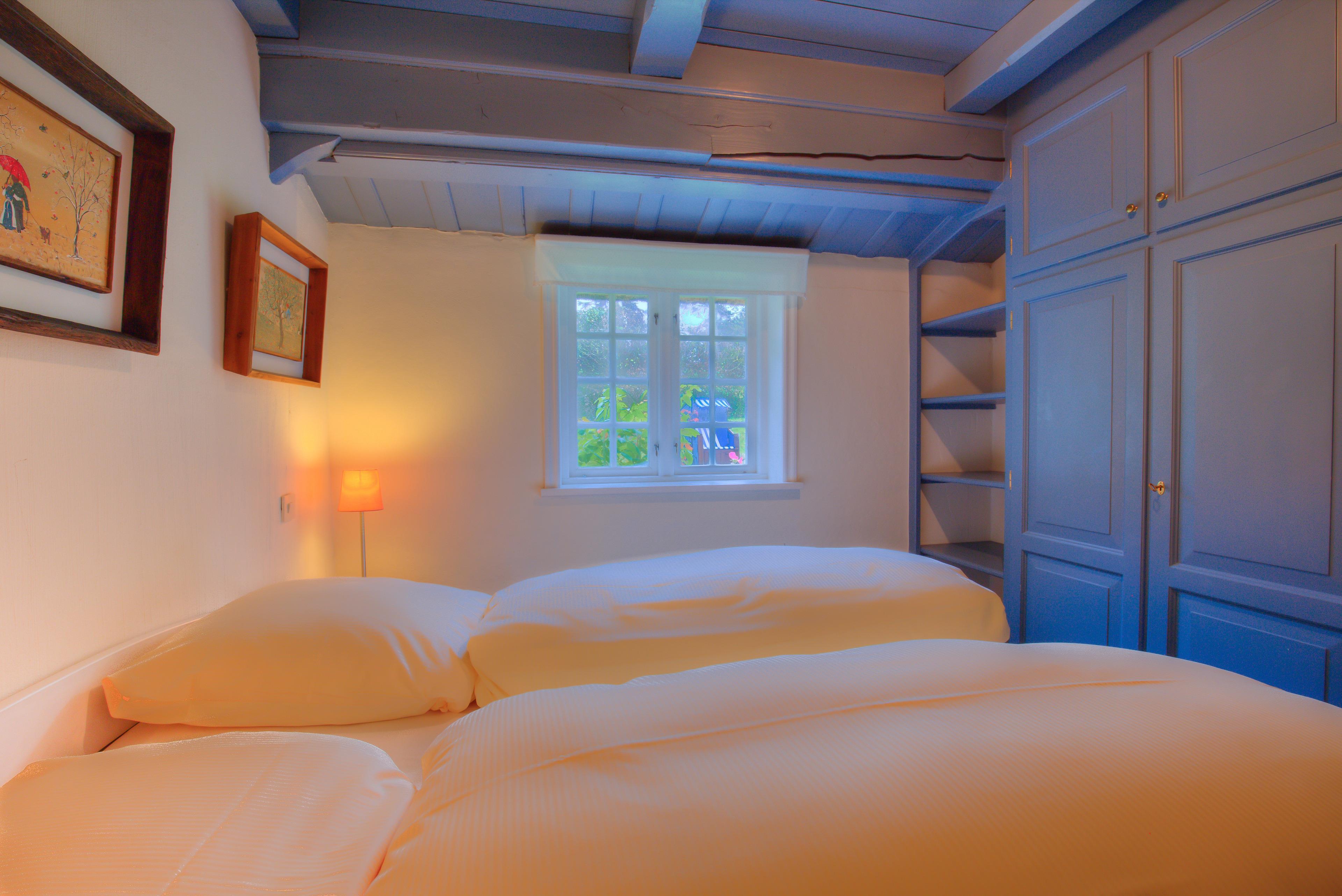 Aus dem Wohnzimmer heraus gelangen sie durch die „Brauttür“ direkt zu Ihrem eigenen nach Süden gerichteten Terrassenbereich mit Strandkorb, Sonnenschirm und Gartenmöbeln – beste Möglichkeiten, um besondere Momente mit der Familie zu verbringen. Die beiden anheimelnden Schlafräume mit Doppelbetten im Erdgeschoss versprechen erholsame Nächte und bieten genug Schrankraum.
