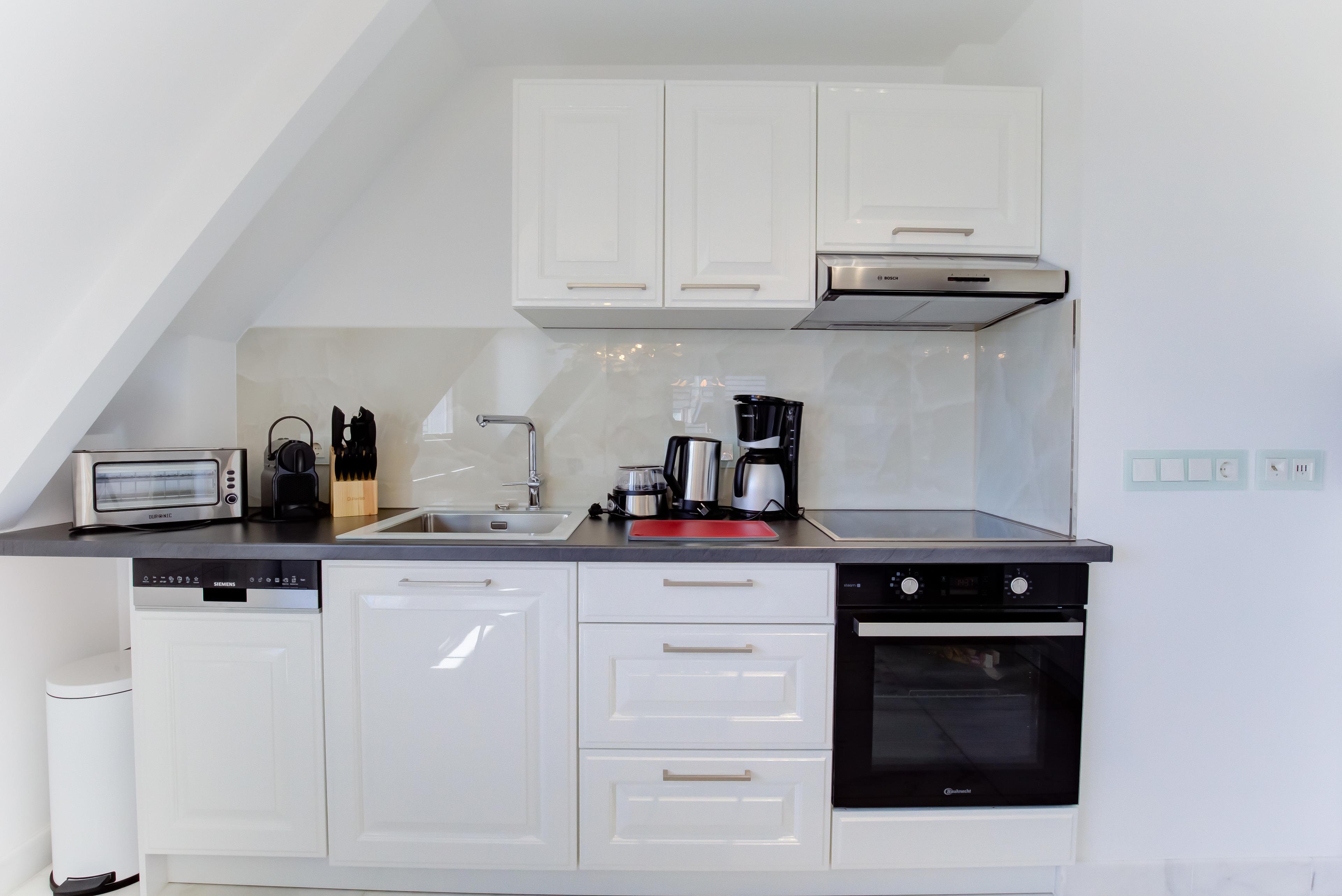 Komfortausstattung Kochen (Töpfe, Bratpfanne, Salz, Pfeffer und Öl)