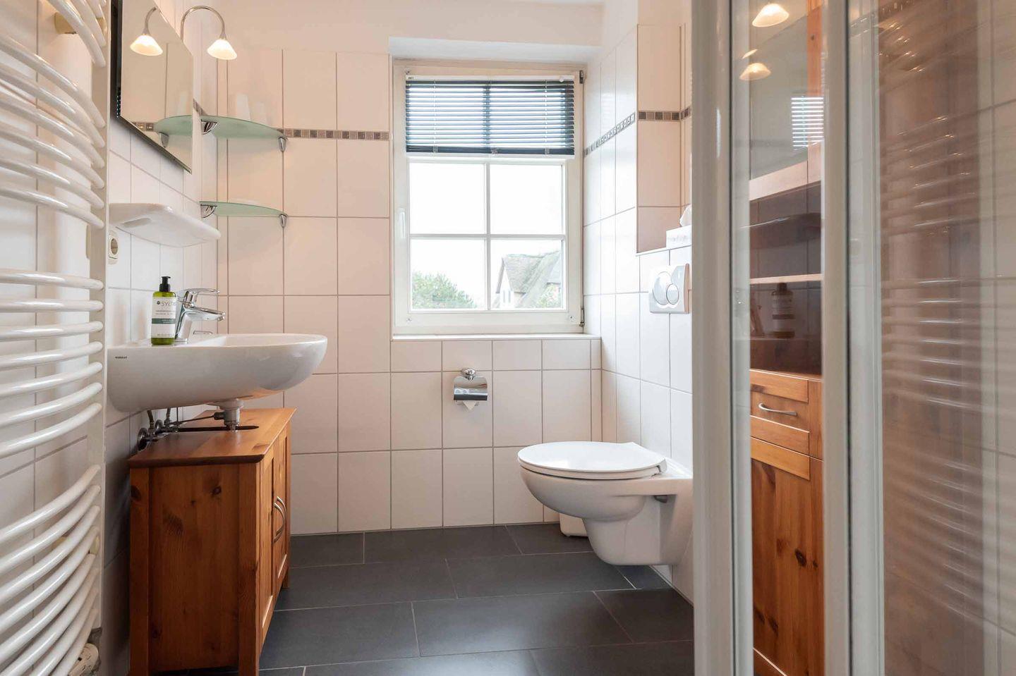 Badezimmer: Großes, helles Duschbad mit WC und Fenster.