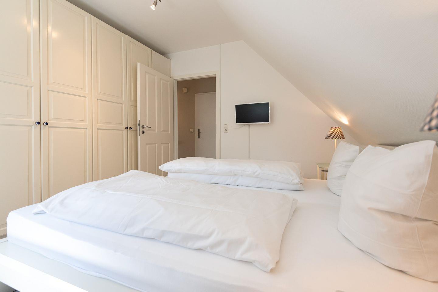Schlafzimmer 2: Großes Schlafzimmer mit Giebelfenster, zwei Einzelbetten und TV.
