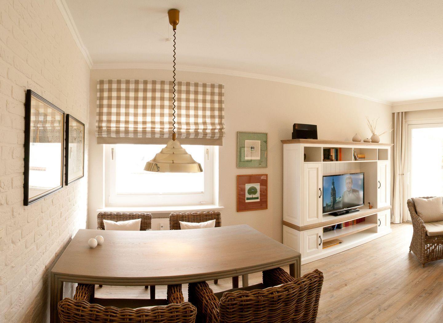 Wohn- und Essbereich: Moderne Ausstattung vereint mit gemütlicher Atmosphäre. Es erwarten Sie u.a. eine Essecke sowie der Wohnbereich mit großem TV. Von hier gelangen Sie auch auf die sonnige Süd-Terrasse, die mit schönem Mobiliar und einem Saison-Strandkorb einlädt.