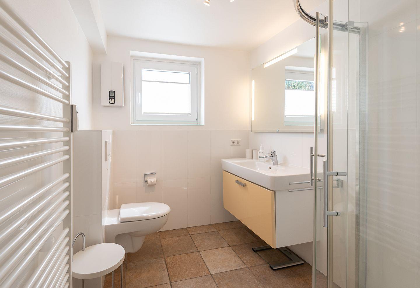 Badezimmer: Modernes Duschbad mit WC, Fußbodenheizung und Fenster.