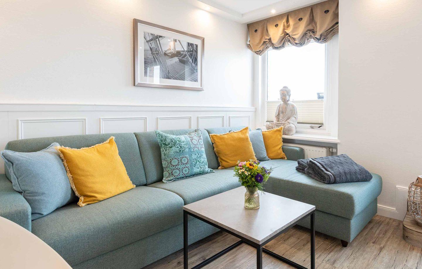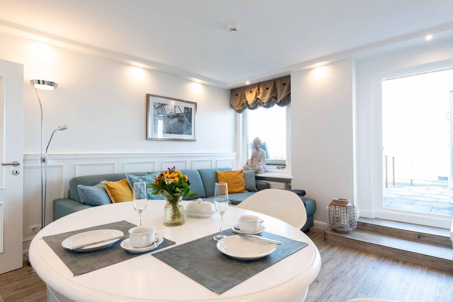 Wohn-/Essbereich: Wohn- und Essbereich mit traumhaftem Ausblick auf die Nordsee. Die moderne Einrichtung und der große TV sorgen für höchsten Wohnkomfort. Von Ihrer großzügigen Dachterrasse können Sie jeden Tag das Meeresrauschen genießen.