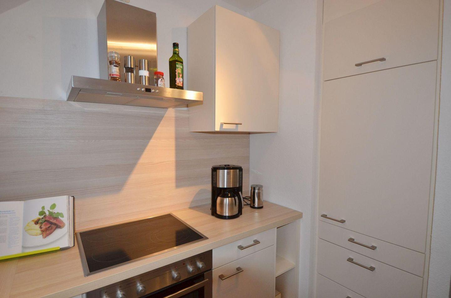 Küche: Die moderne Einbauküche ist ausgestattet mit Ceran-Kochfeld, Umluftbackofen, Spülmaschine und Waschmaschine.