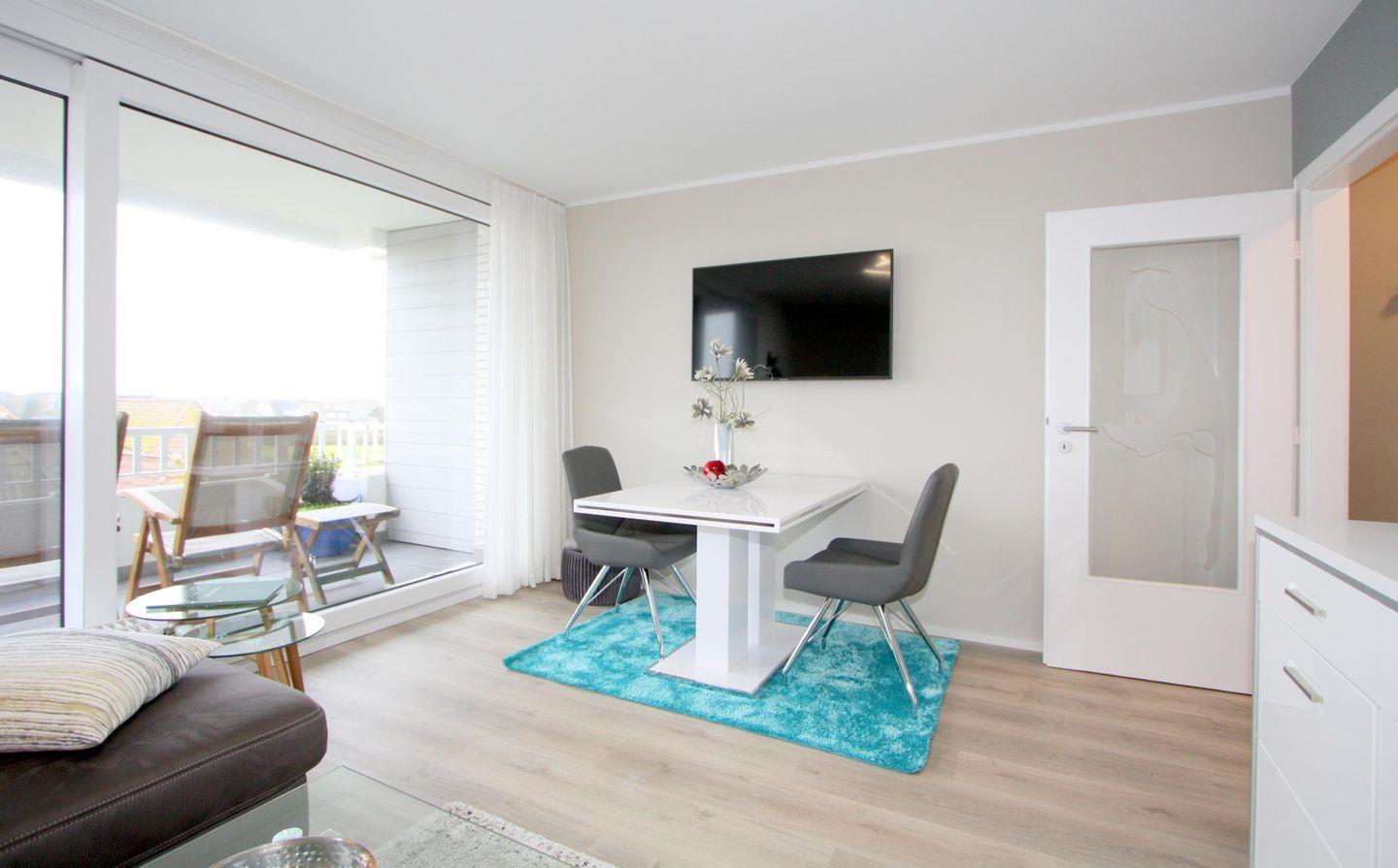 Koch-/Wohn-/Essbereich: Heller Wohnraum mit bequemer Wohnlandschaft und Smart-TV (Netflix und Amazon-Prime empfangbar) sowie Zugang auf den schönen Südbalkon. Auch vom Essbereich für 2 Personen können Sie den tollen Weitblick genießen. Angrenzend zum Wohnbereich befindet sich die gut ausgestattete Einbauküche.