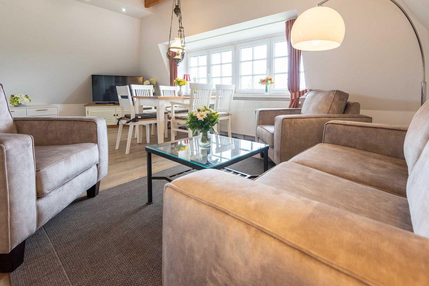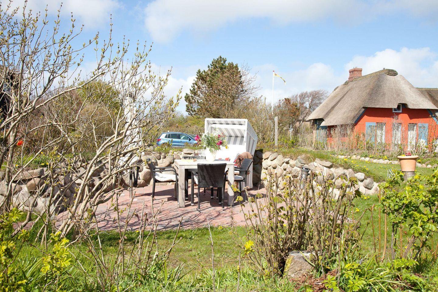 Gemütliche 3-Zimmerwohnung auf Sylt mit Reetdach, Garten und moderner Ausstattung für Familien und Hundebesitzer.