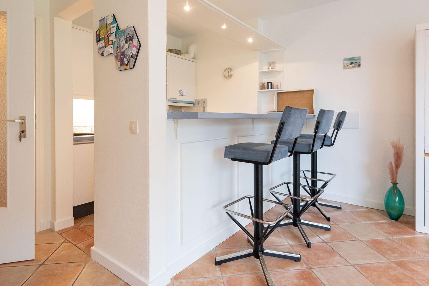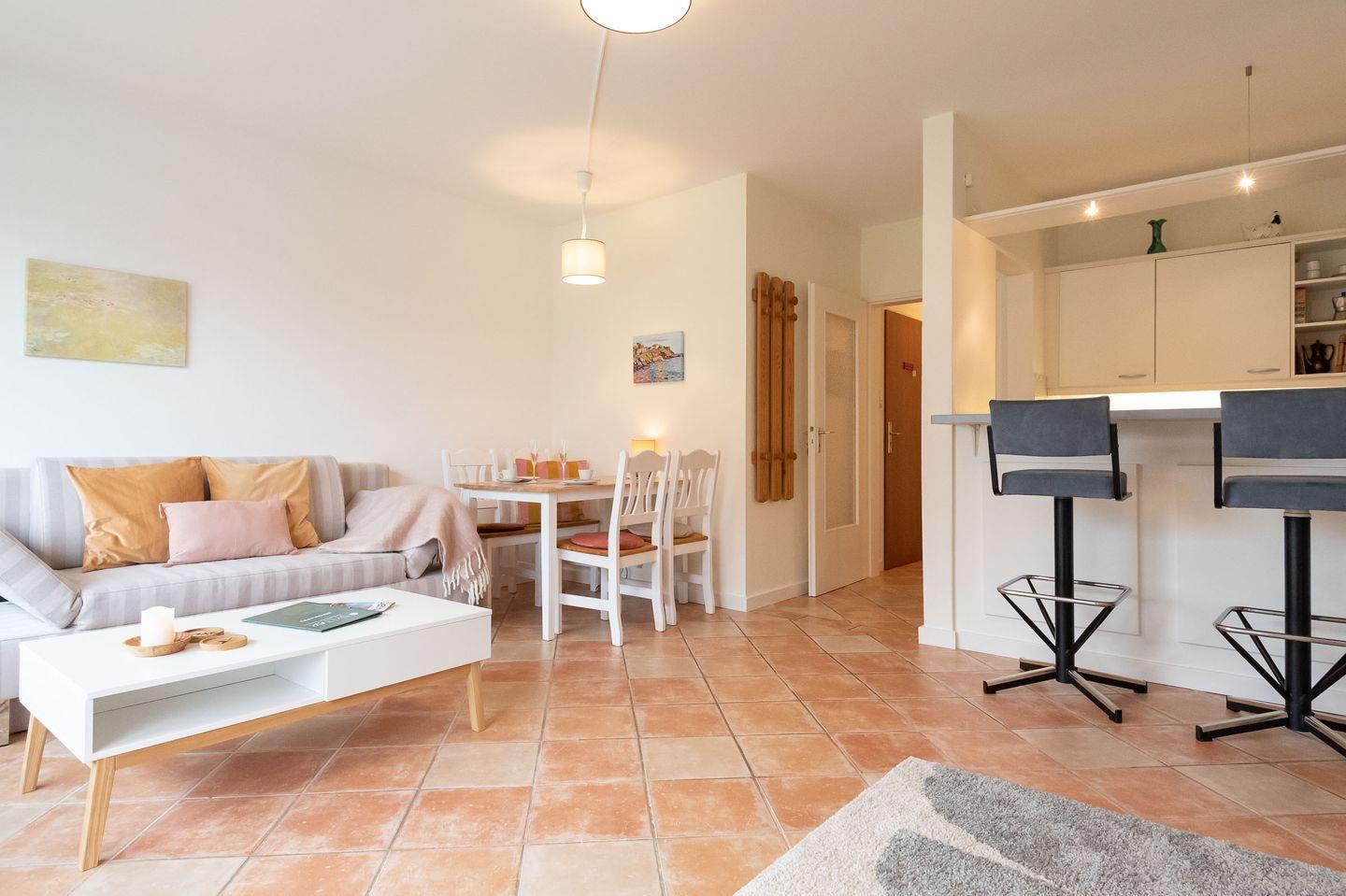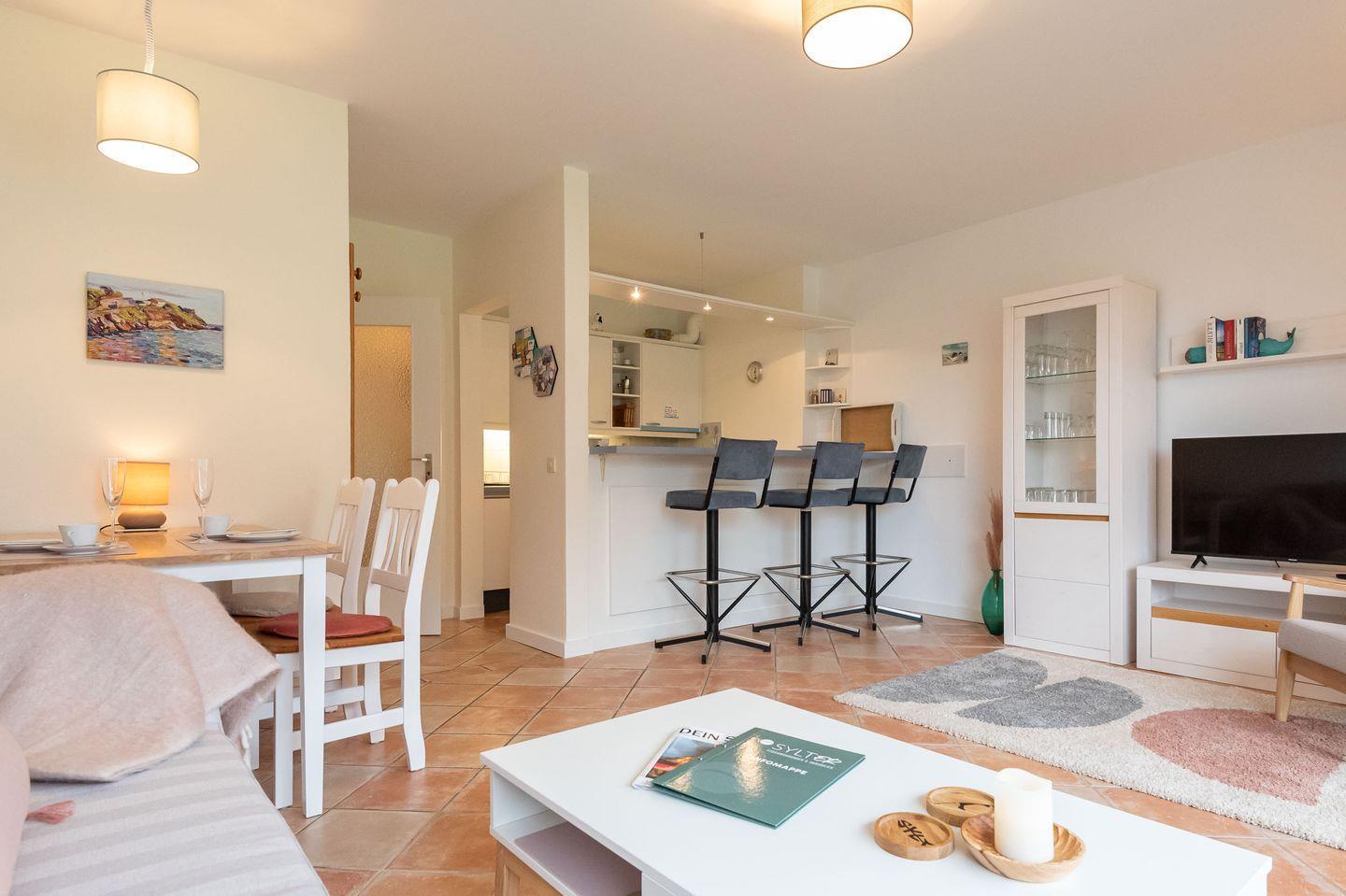 Koch-/Ess-/Wohnbereich: Neu renovierter Wohnbereich mit TV und separater Essecke. Die helle Pantryküche ist mit einer gemütlichen Bar ausgestattet. Das Schlafsofa bietet Platz für zwei Personen. Nach Süden ausgerichtete Sonnenterrasse mit einem Strandkorb und Gartenmöbeln.