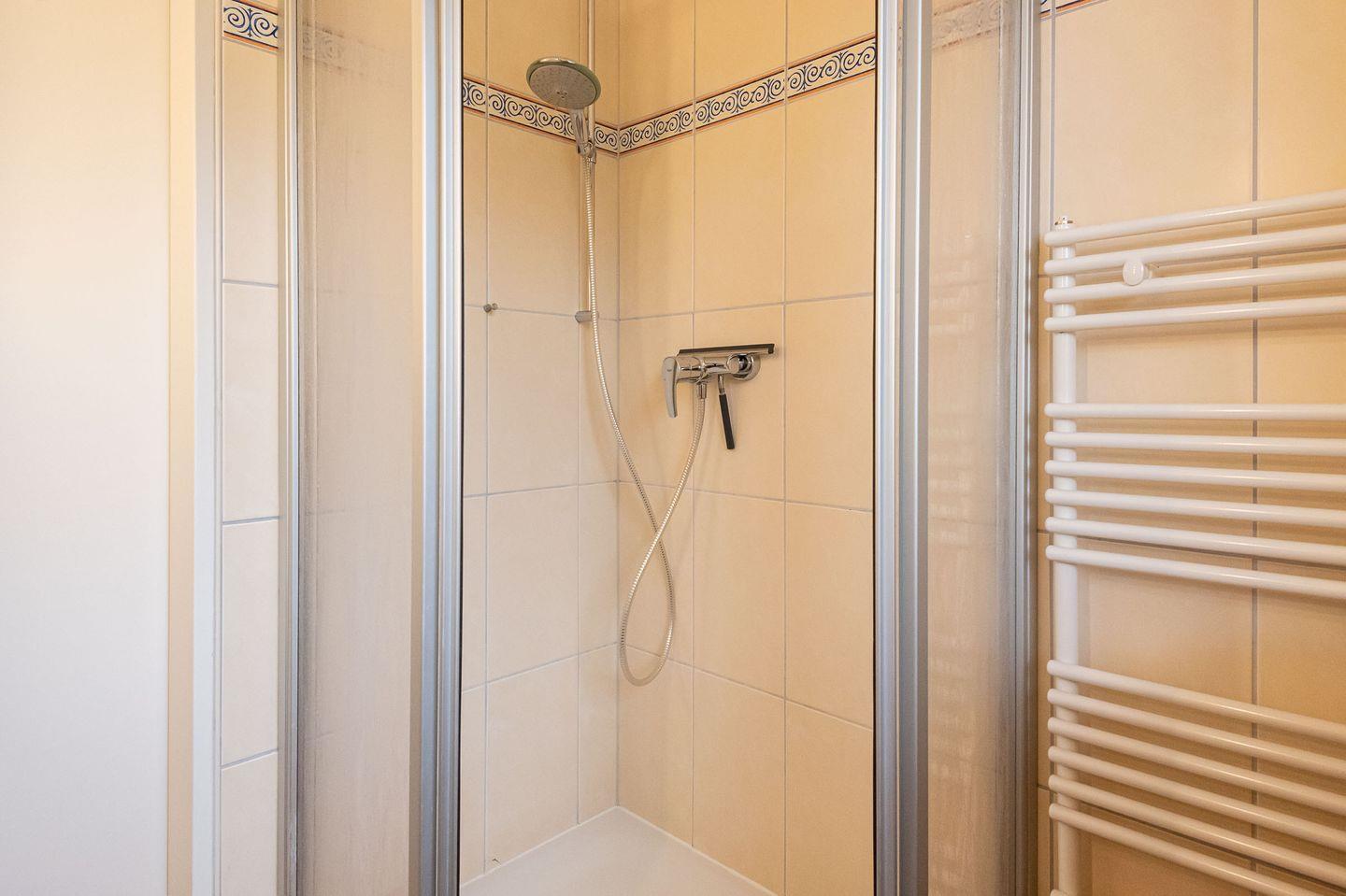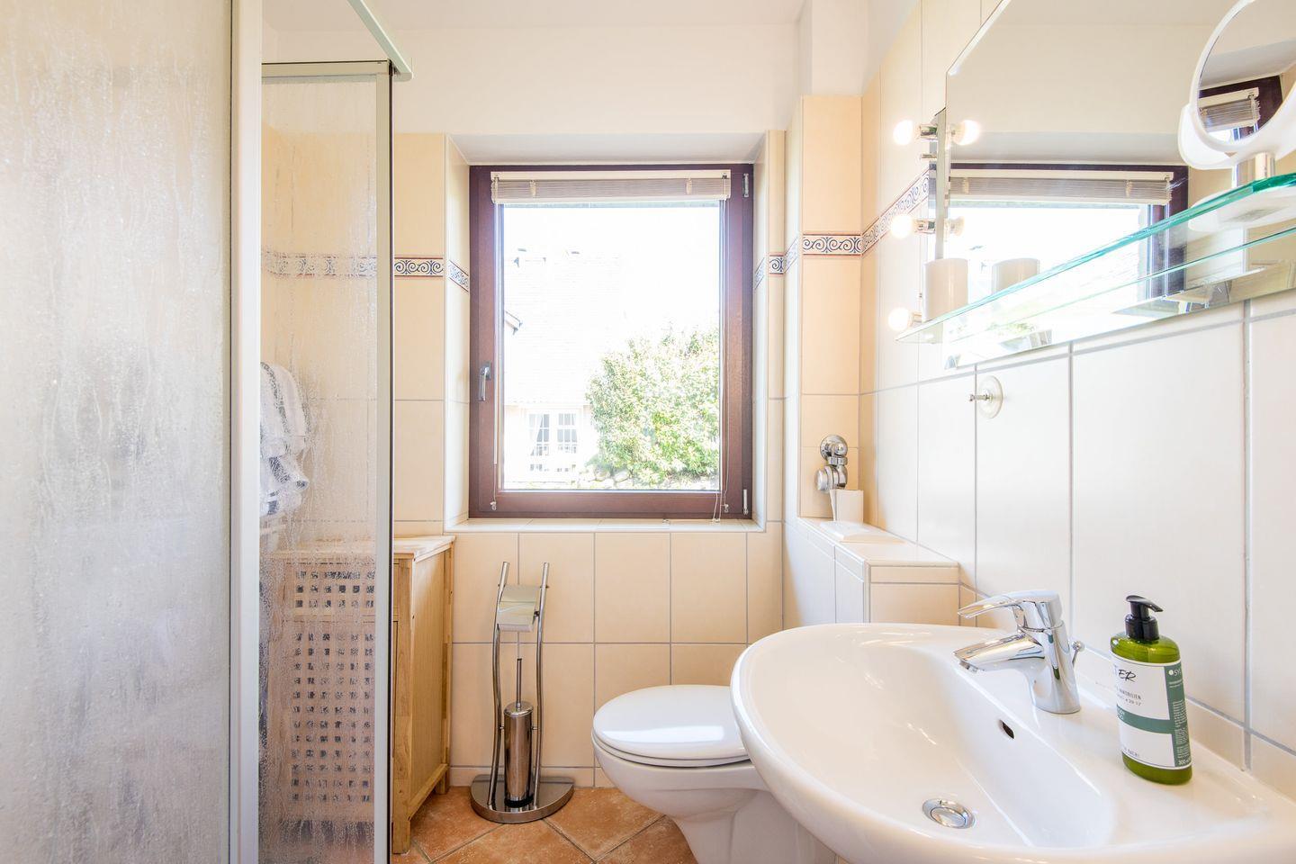 Badezimmer: helles Duschbad mit WC und Tageslicht.