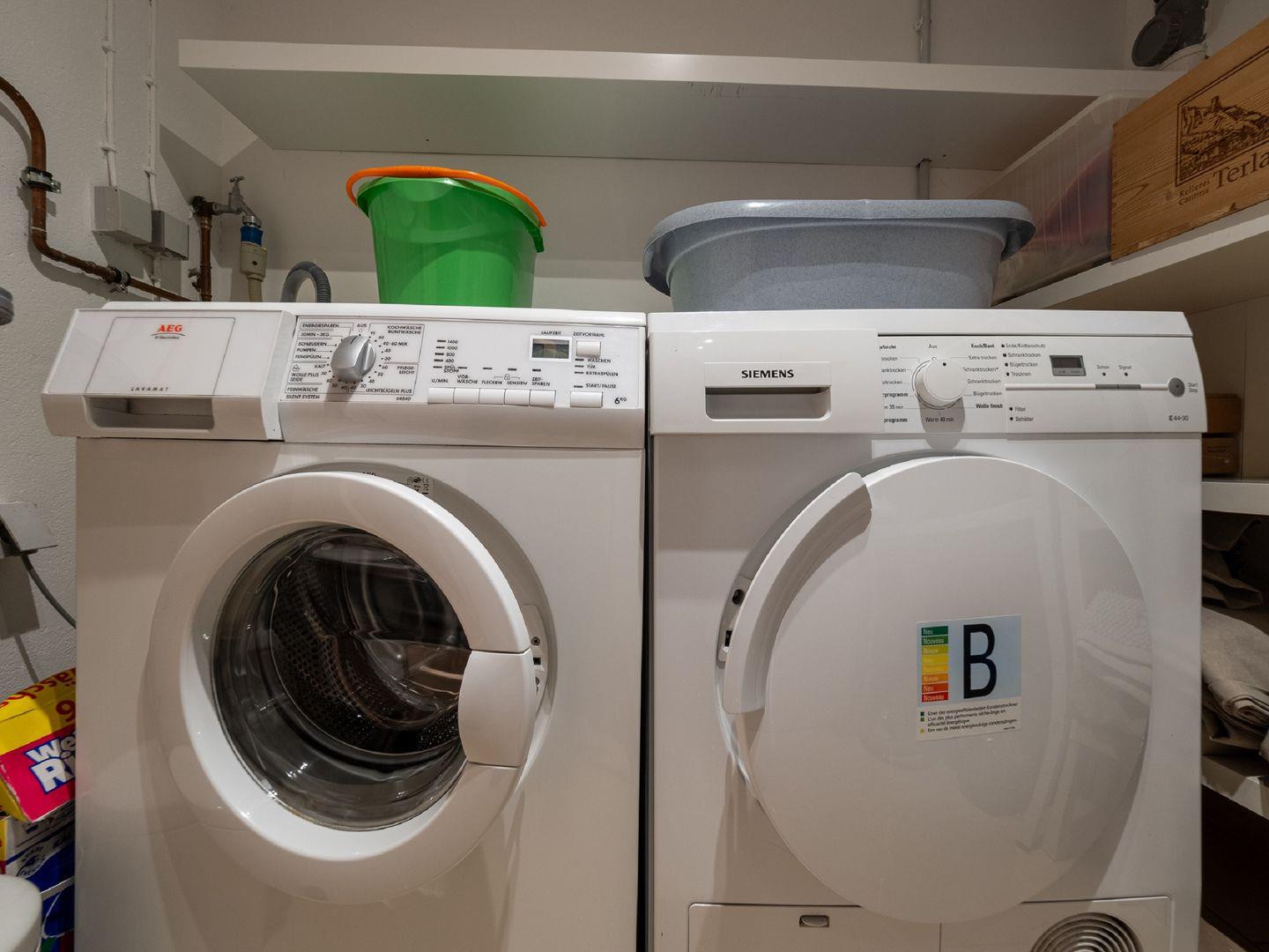 Hauswirtschaftsraum: Waschraum mit Waschmaschine/Trockner sowie Abstellmöglichkeiten für Koffer.