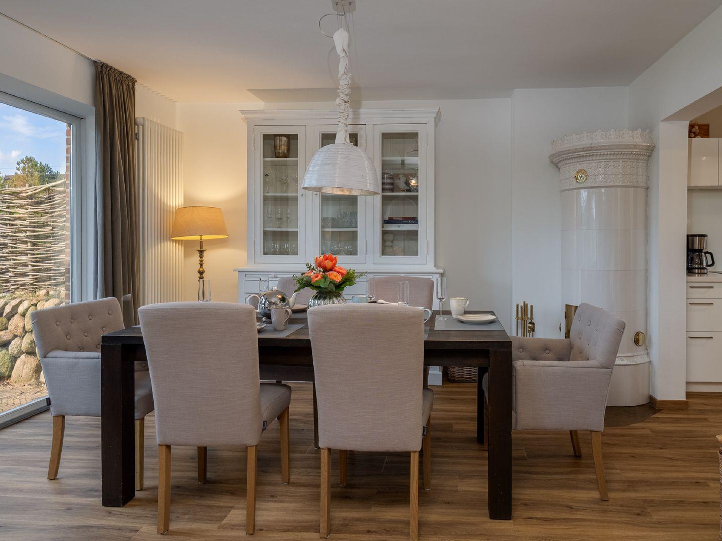 Wohn-/Esszimmer: Im EG liegt der offene Wohn- und Essbereich mit zwei bequemen Sofas, hochwertiger Sitzgruppe und einem großen Esstisch für die ganze Familie. Ebenfalls gelangen Sie von hier auf die Westterrasse mit Gartenmöbeln und Strandkorb.