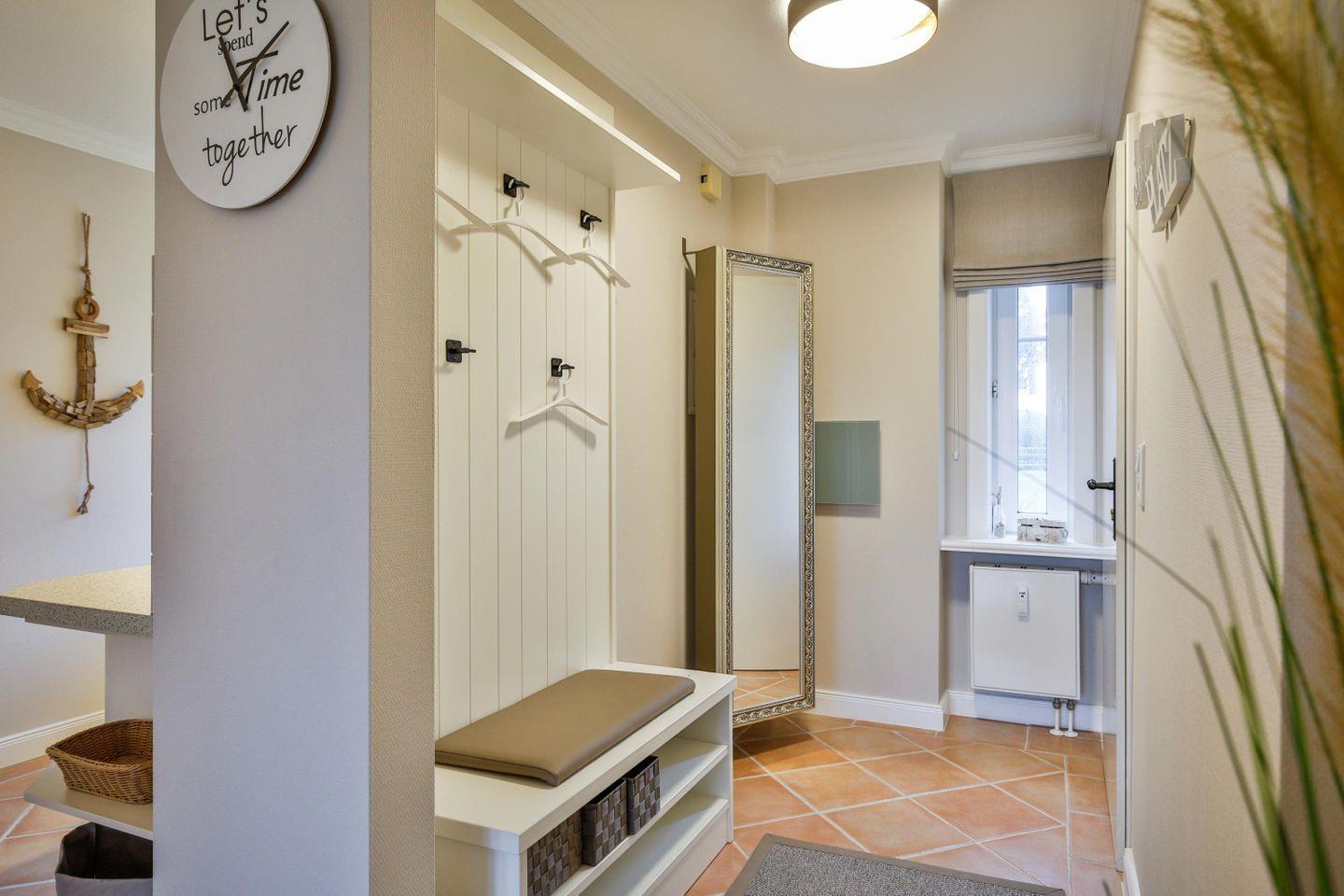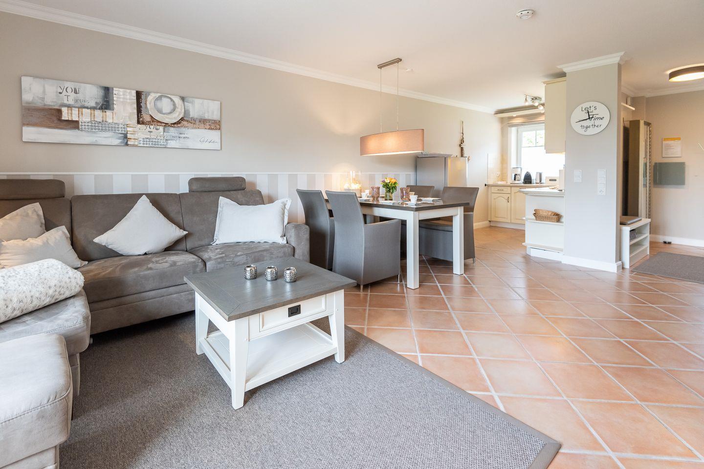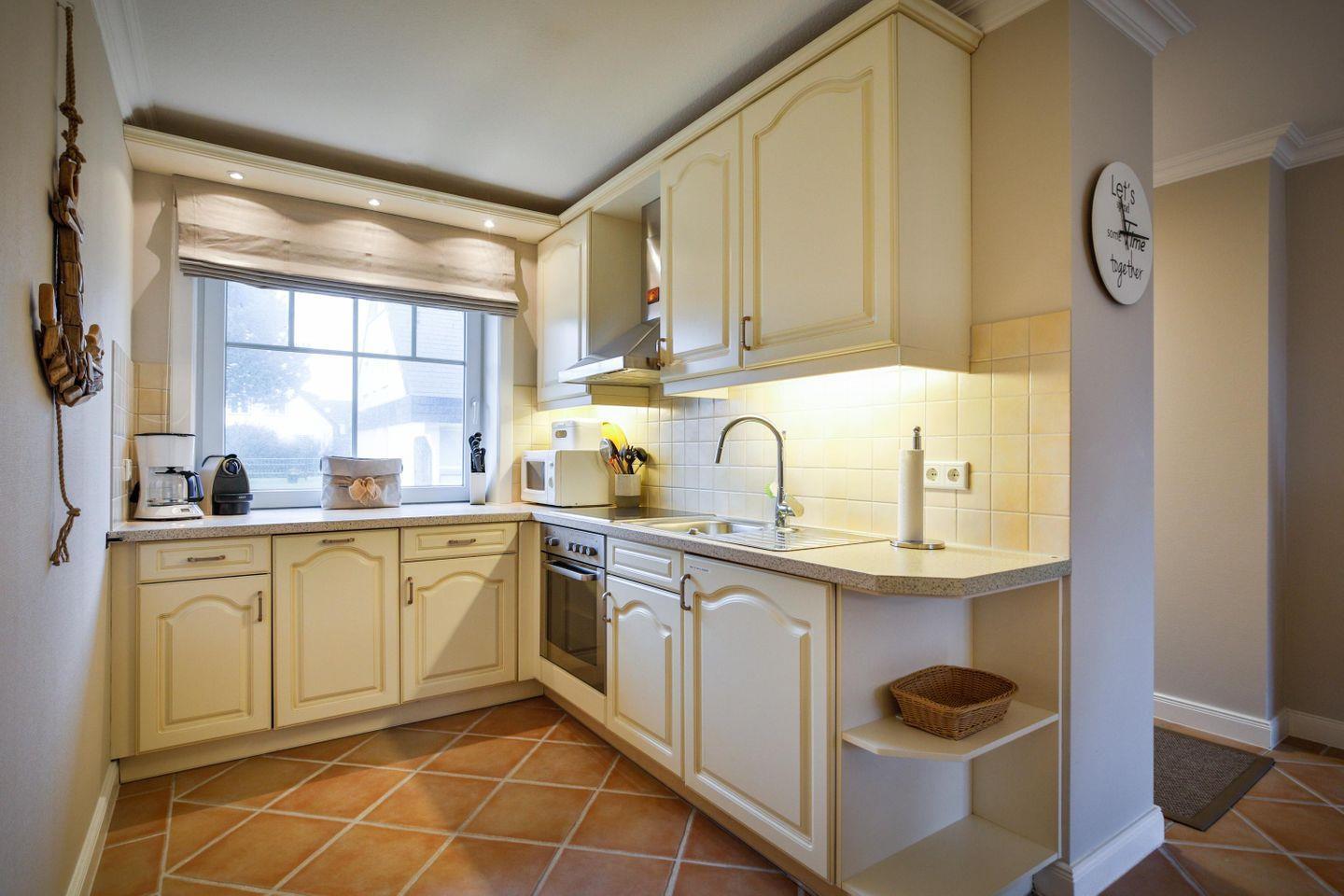 Der großzügige Flurbereich mit Garderobe und Ablagefläche geht direkt über in den Wohn-/Koch- und Essbereich: Die helle Küche im Landhausstil ist sehr gut ausgestattet und verfügt über hochwertige Küchengeräte. Der angrenzende Essbereich bietet ausreichend Platz für vier Personen und geht direkt über in eine gemütliche Sofaecke mit TV und Blick in den grünen Garten.