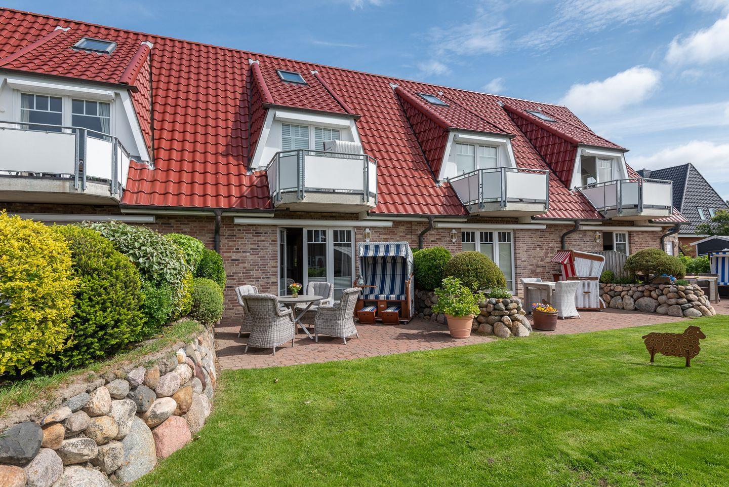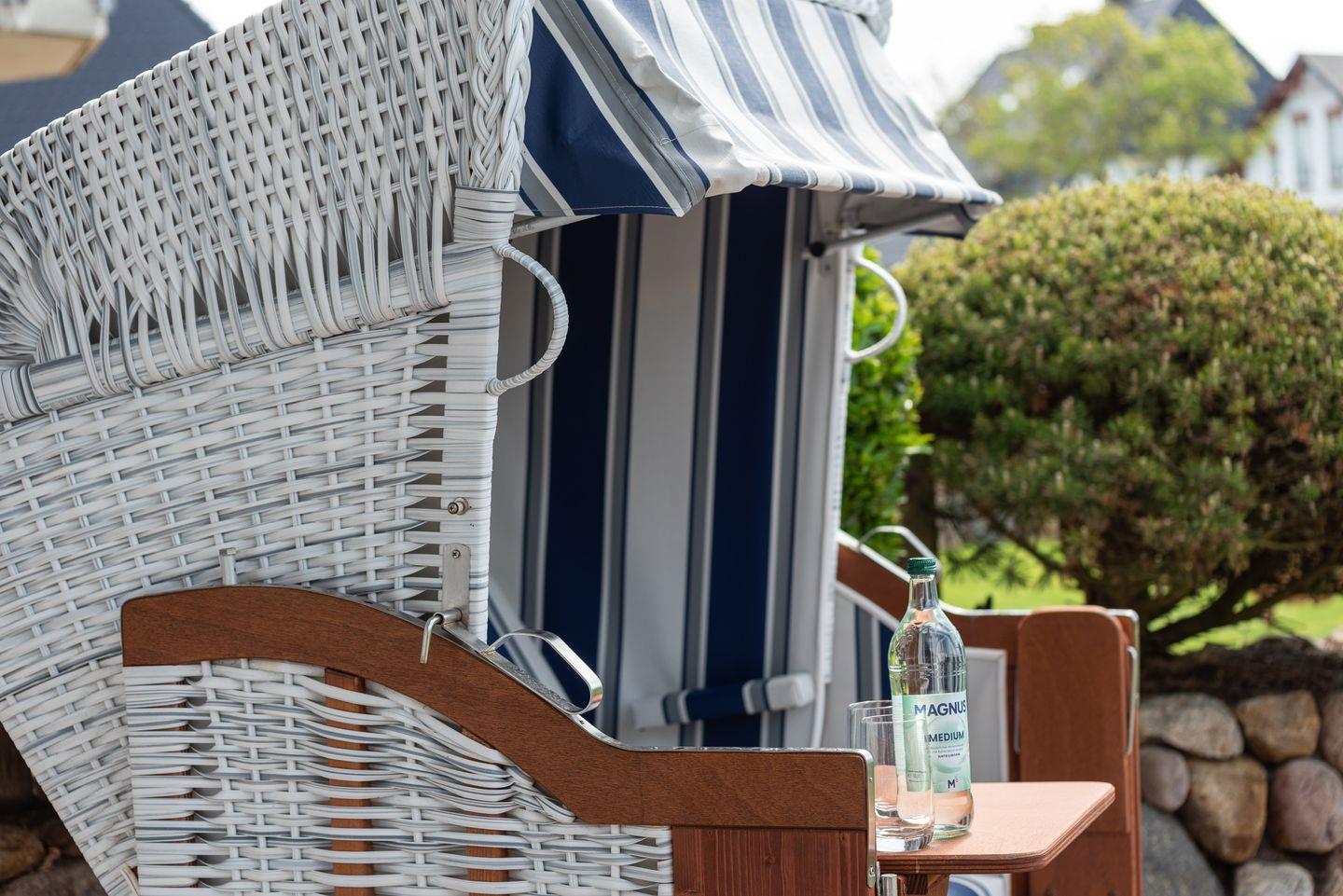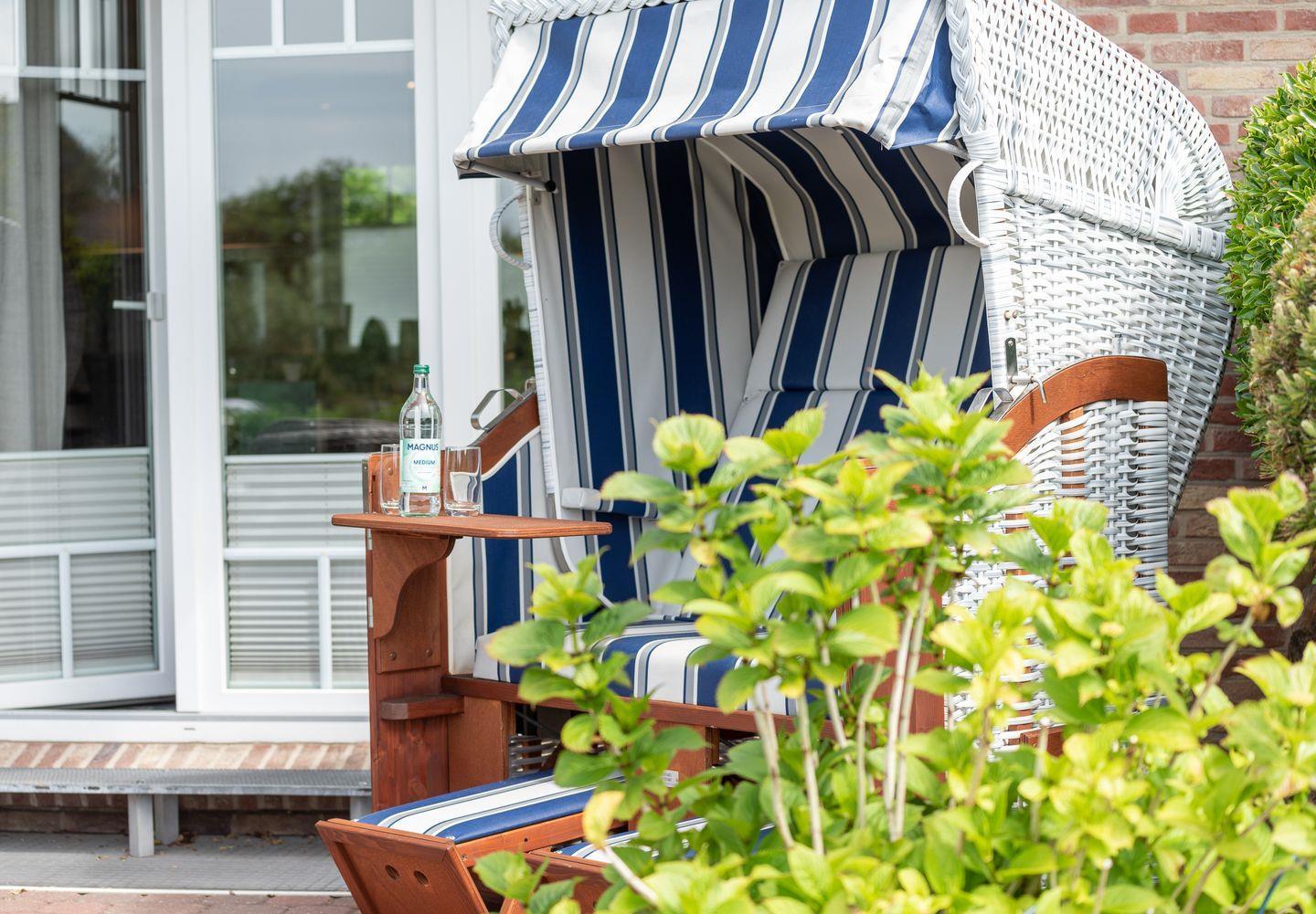 Vom Wohnbereich gelangen Sie über eine Terrassentür auf die nach Süd-West ausgerichtete Terrasse mit edlem Mobiliar und Strandkorb.