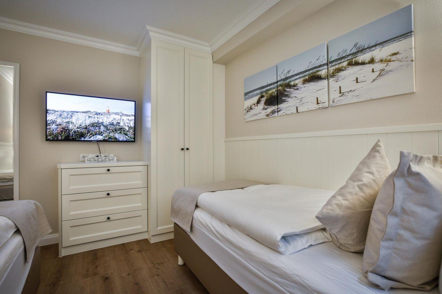 Ein weiteres Schlafzimmer mit zwei Boxspring-Einzelbetten, TV und Fenster. Beide Schlafzimmer verfügen über Kleiderschränke und Verdunkelungsmöglichkeiten.