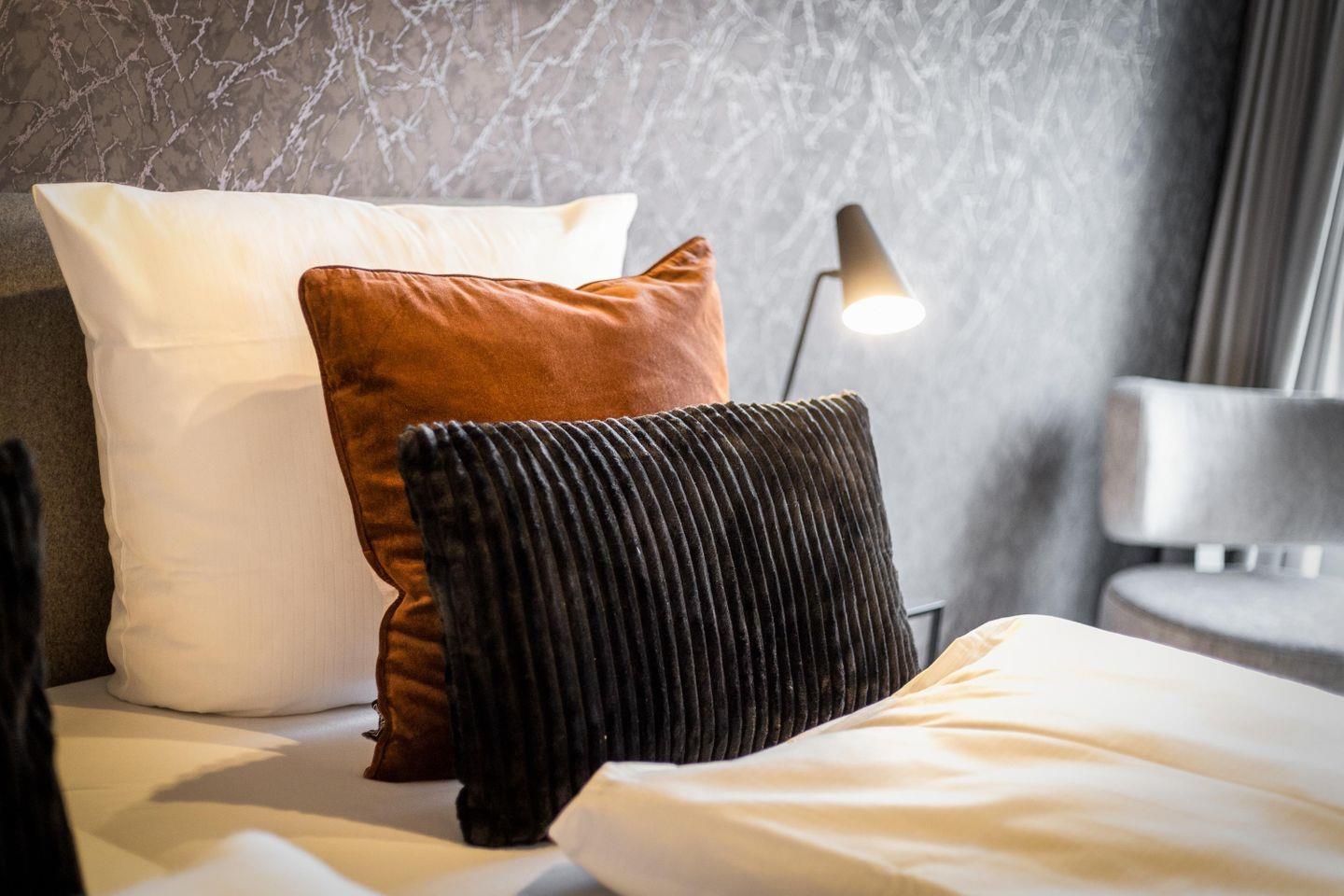 Schlafzimmer: Doppelbett, hochwertige Möbel, TV sowie ein großes Fenster.