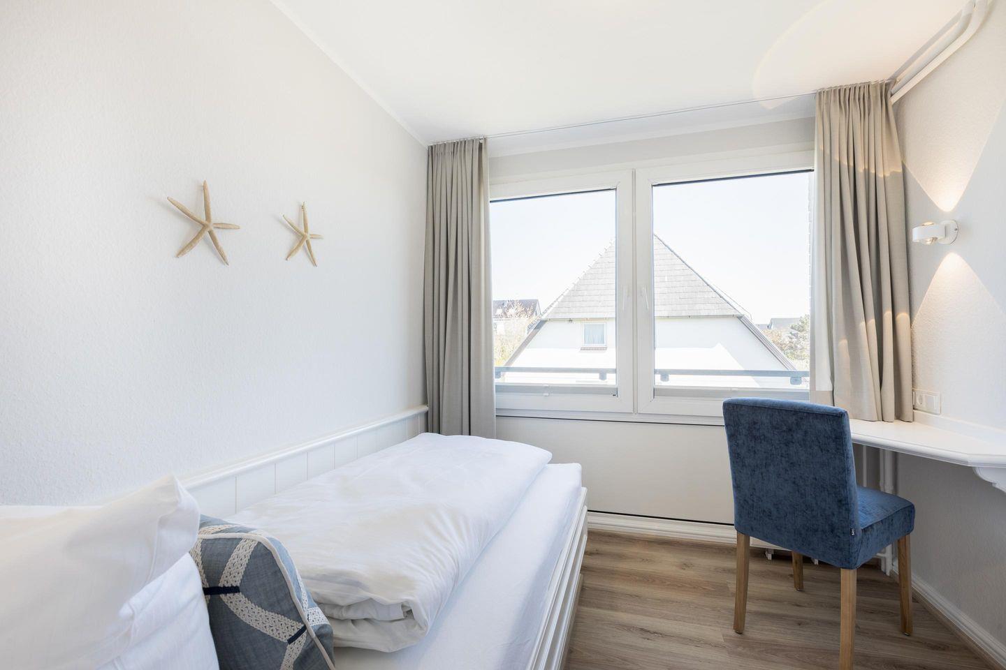 Schlafzimmer 2: Einzelschlafzimmer mit Sekretär und kleinem Einbauschrank.