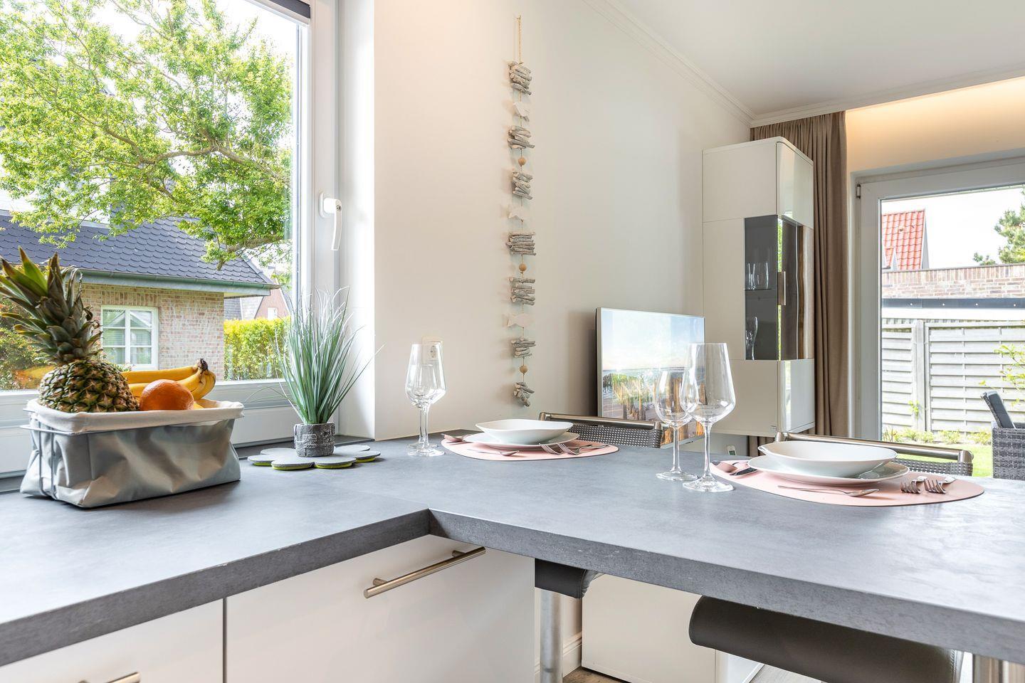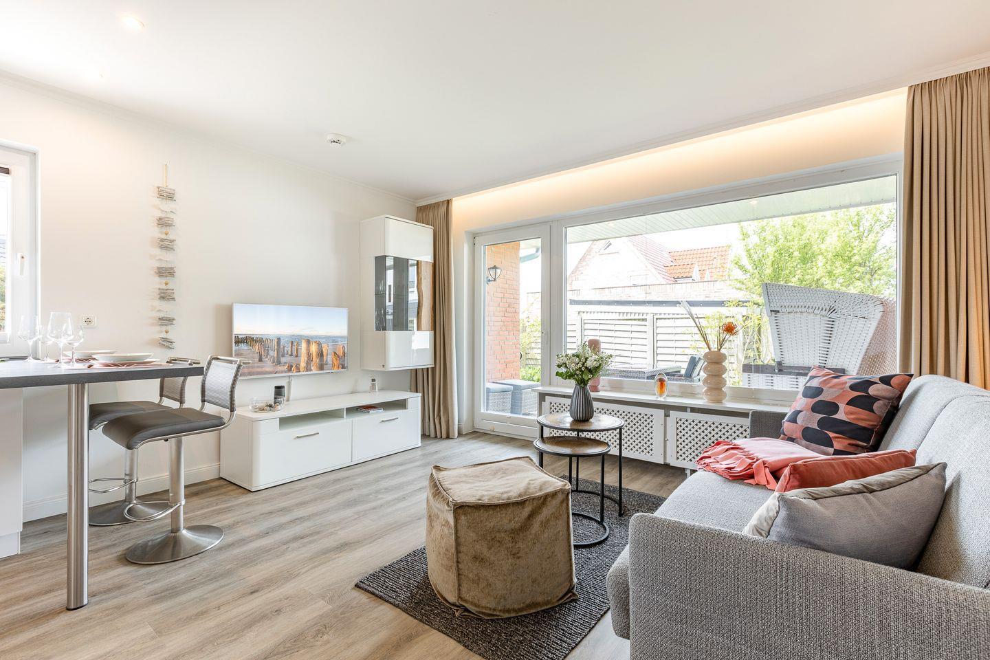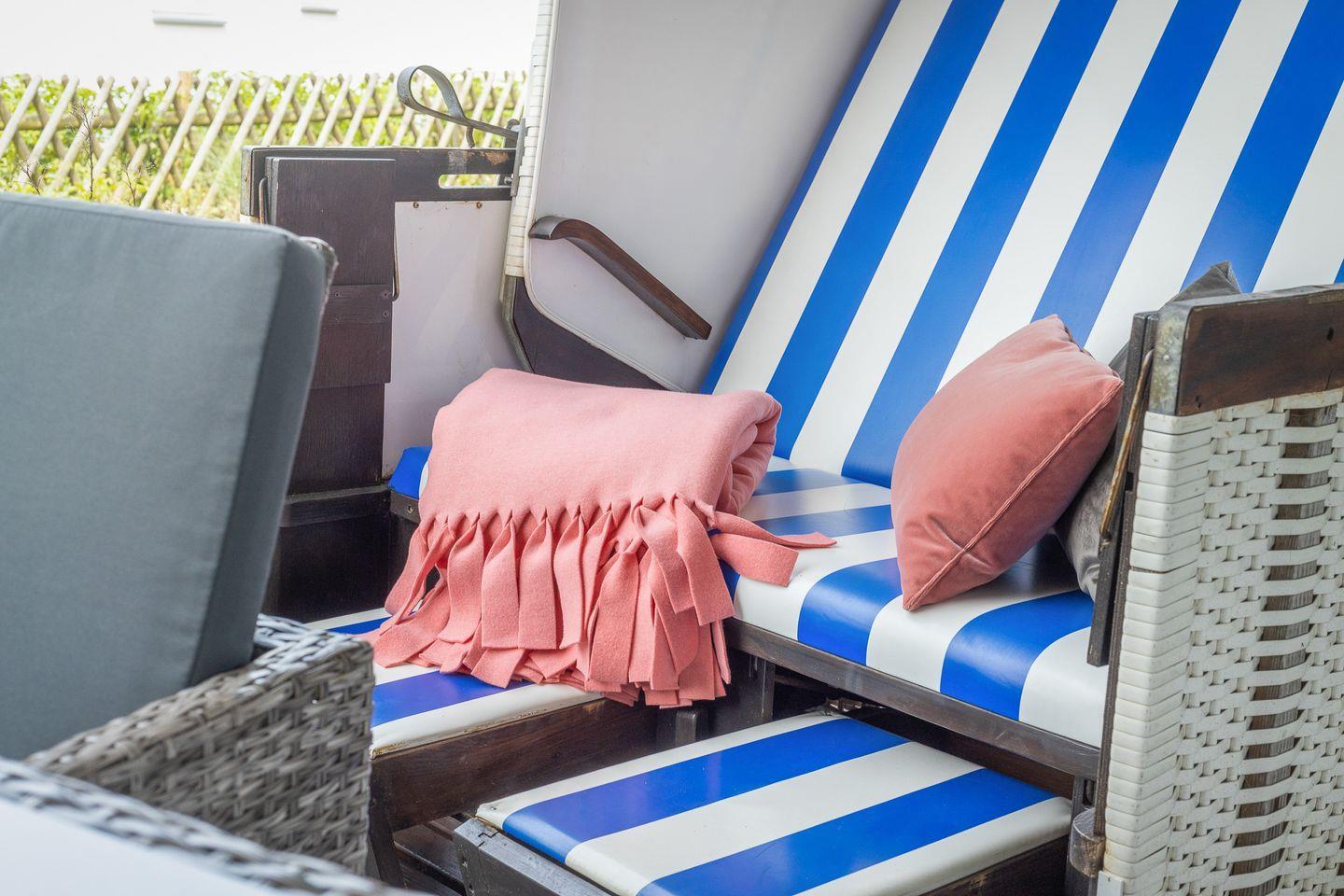 Von diesem Raum gelangen Sie auch auf die schöne, möblierte Terrasse, auf der in den Sommermonaten ein Strandkorb für Sie bereit steht.
