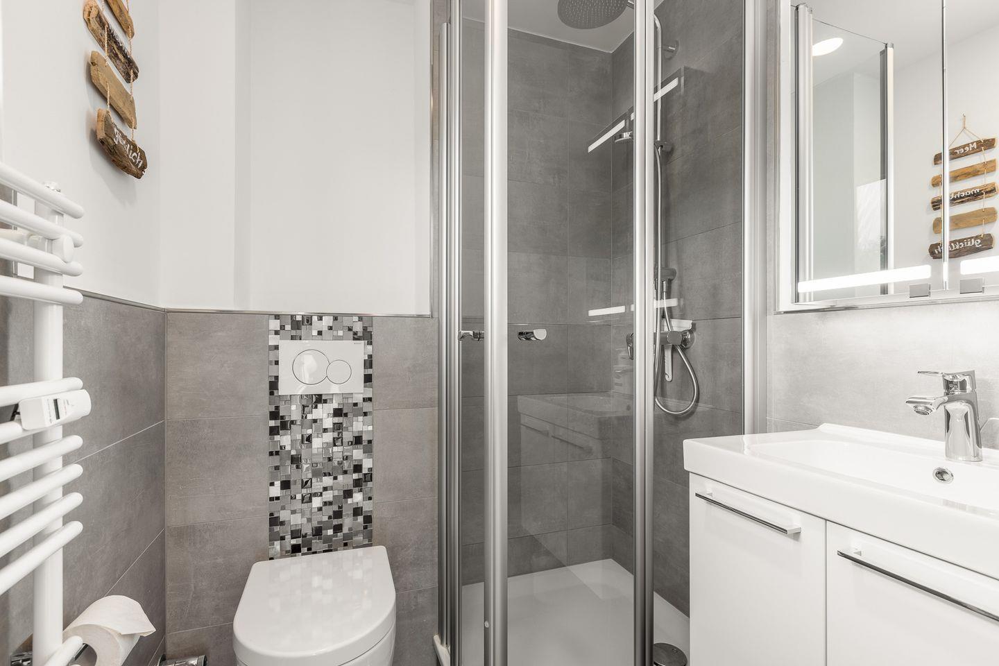 Badezimmer: Helles, modernes Duschbad mit Fenster sowie einem Handtuchtrockner und Fußbodenheizung.