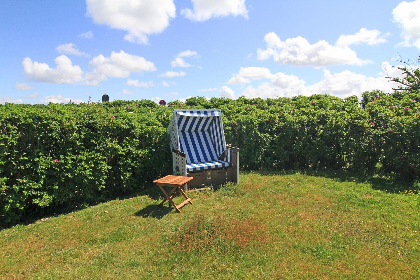 Besonderheiten: Gäste dieser Ferienwohnung dürfen den von Sylter Heckenrosen umsäumten Garten mit Saisonstrandkorb nutzen.