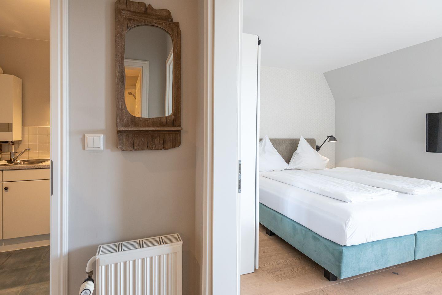 Wohn-/Schlaf-/Essbereich: Geschickt eingerichtetes Zimmer mit Panoramablick über die Wiesen und Felder. Der Schlafbereich ist mit einem Boxspringbett ausgestattet. Der kleine Essplatz vor dem Fenster und das bequeme Zweisitzer-Sofa laden zum Verweilen ein.