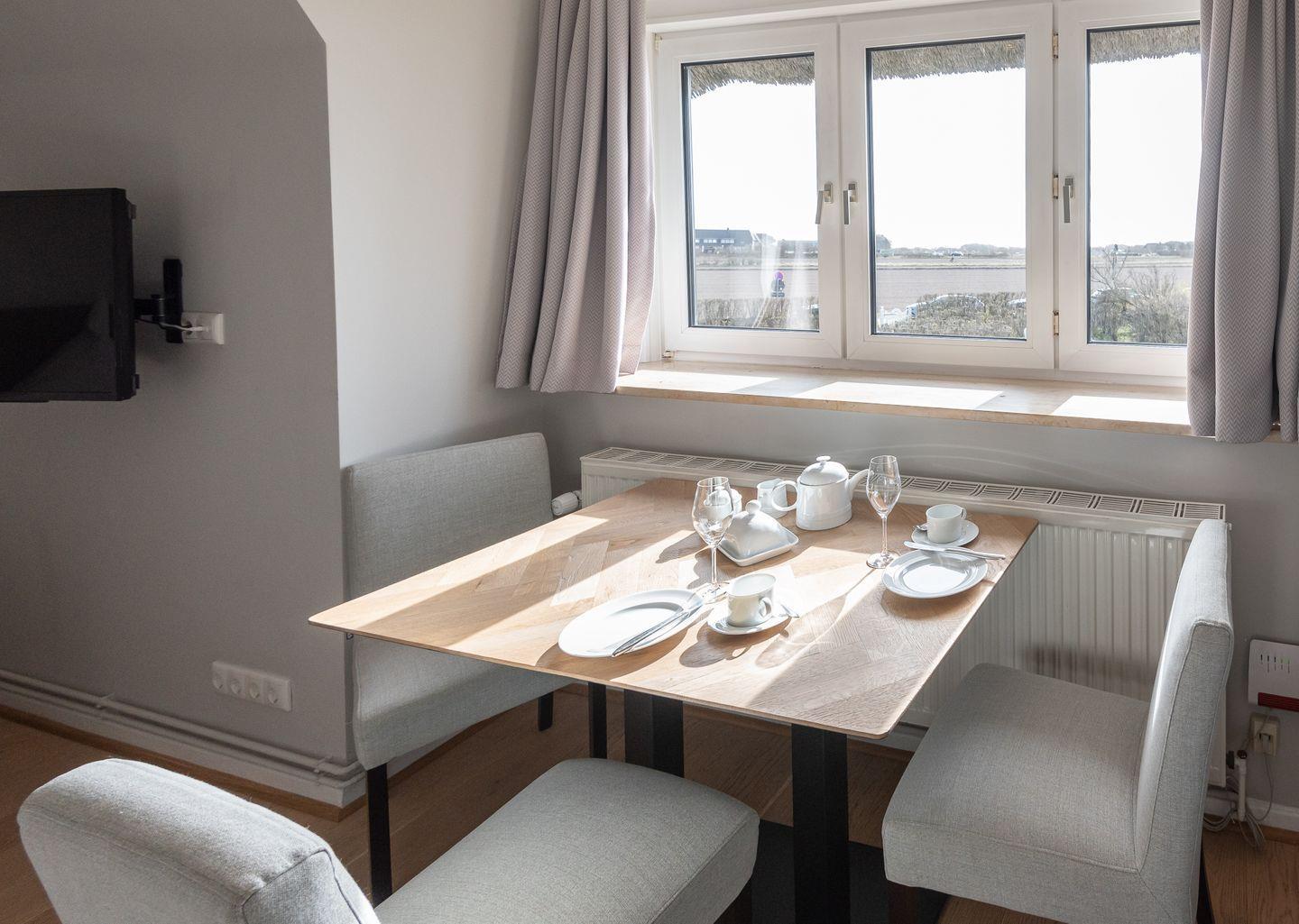 Die modern ausgestattete Einraumwohnung befindet sich im Obergeschoss des Reetdachhauses "Passat" mit mehreren Wohnparteien und weitem Wiesenblick.