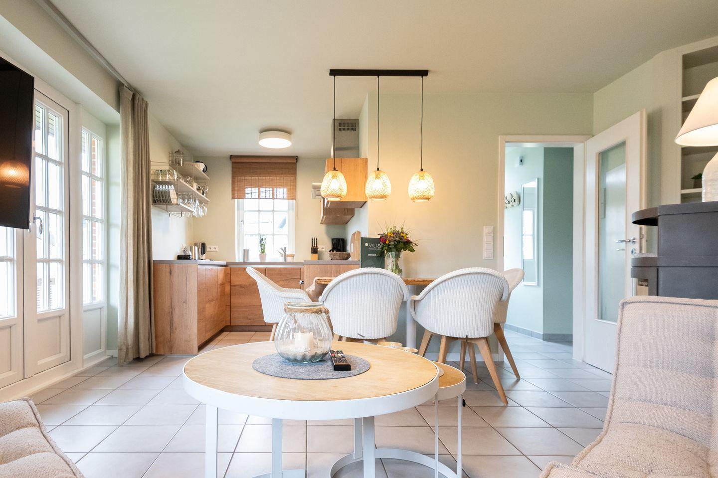 Wohn-/Koch- und Essbereich: Die offene und moderne Küche ist sehr gut ausgestattet und lässt bei Hobby-Köchen keine Wünsche offen. Eine gemütliche Sofaecke mit TV und Kaminofen verspricht gemütliche Abende. Der Wohnraum wird durch einen Essbereich abgerundet, der Platz für 4 Personen bietet. Von hier aus gelangen Sie auf die schöne West-Terrasse mit angrenzendem Garten, einem Saison-Strandkorb und Gartenmöbeln.