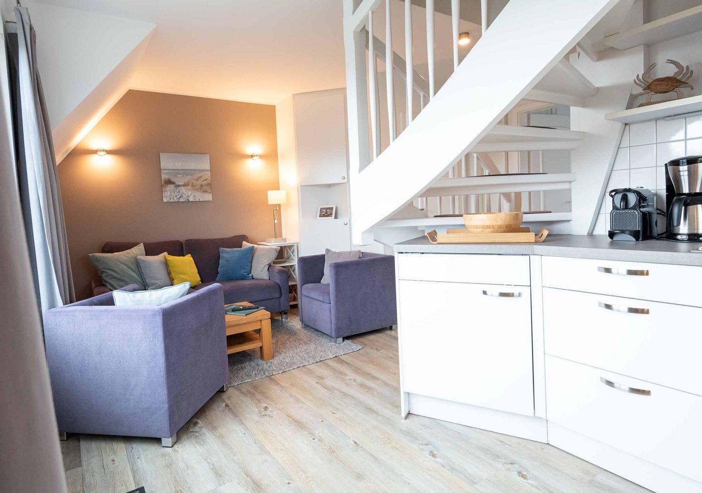 Diese geschmackvoll gestaltete Maisonette-Ferienwohnung mit einem herrlichen Sonnenbalkon liegt über zwei Ebenen im Obergeschoss des beliebten Landhaus "Dwarsloeper"