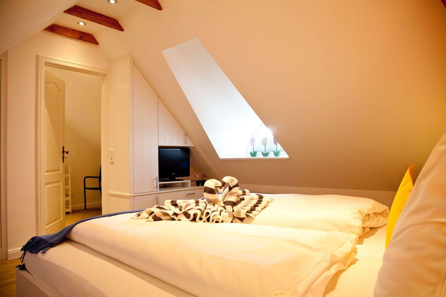 Schlafzimmer 2: Doppelbett, TV und Fenster.