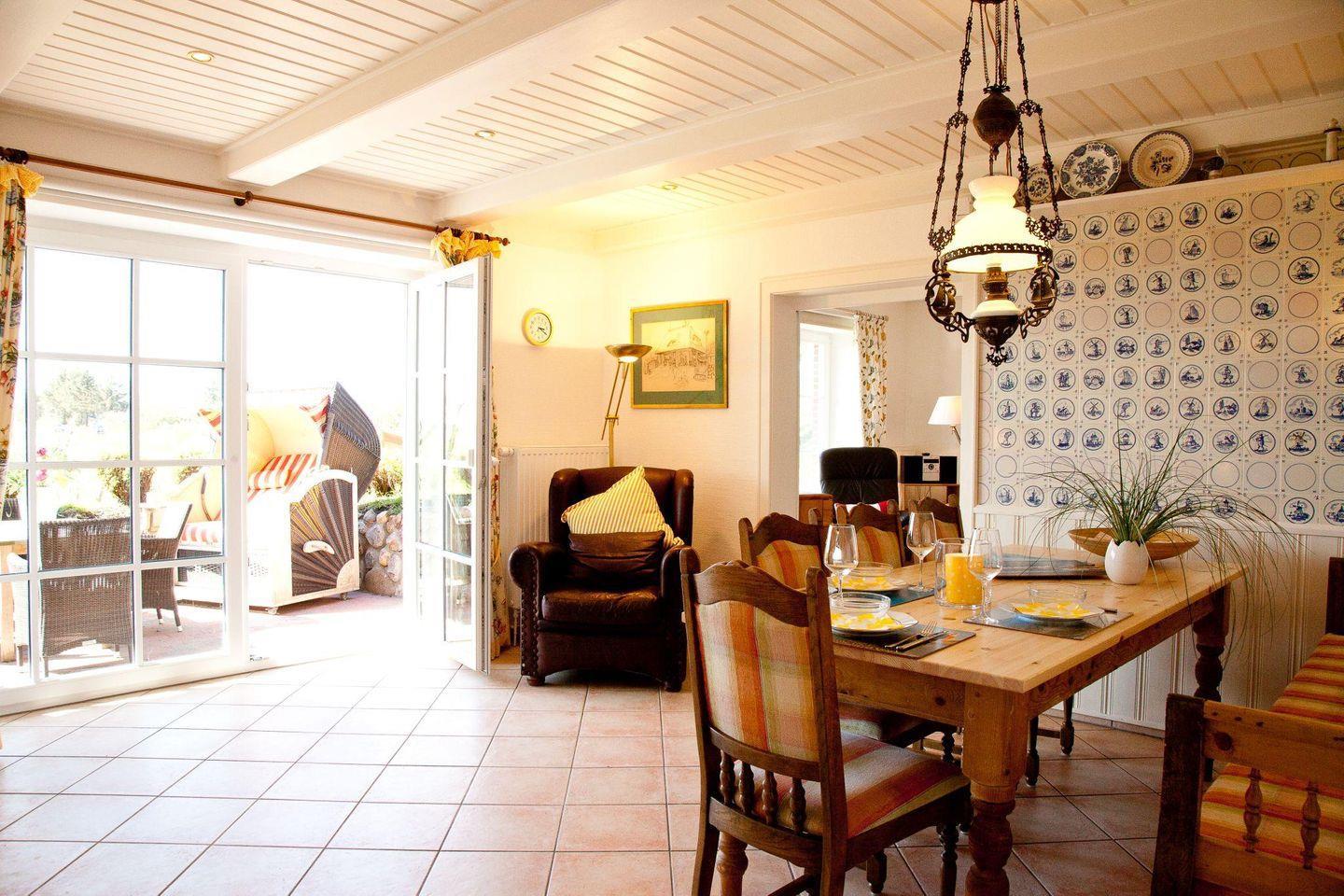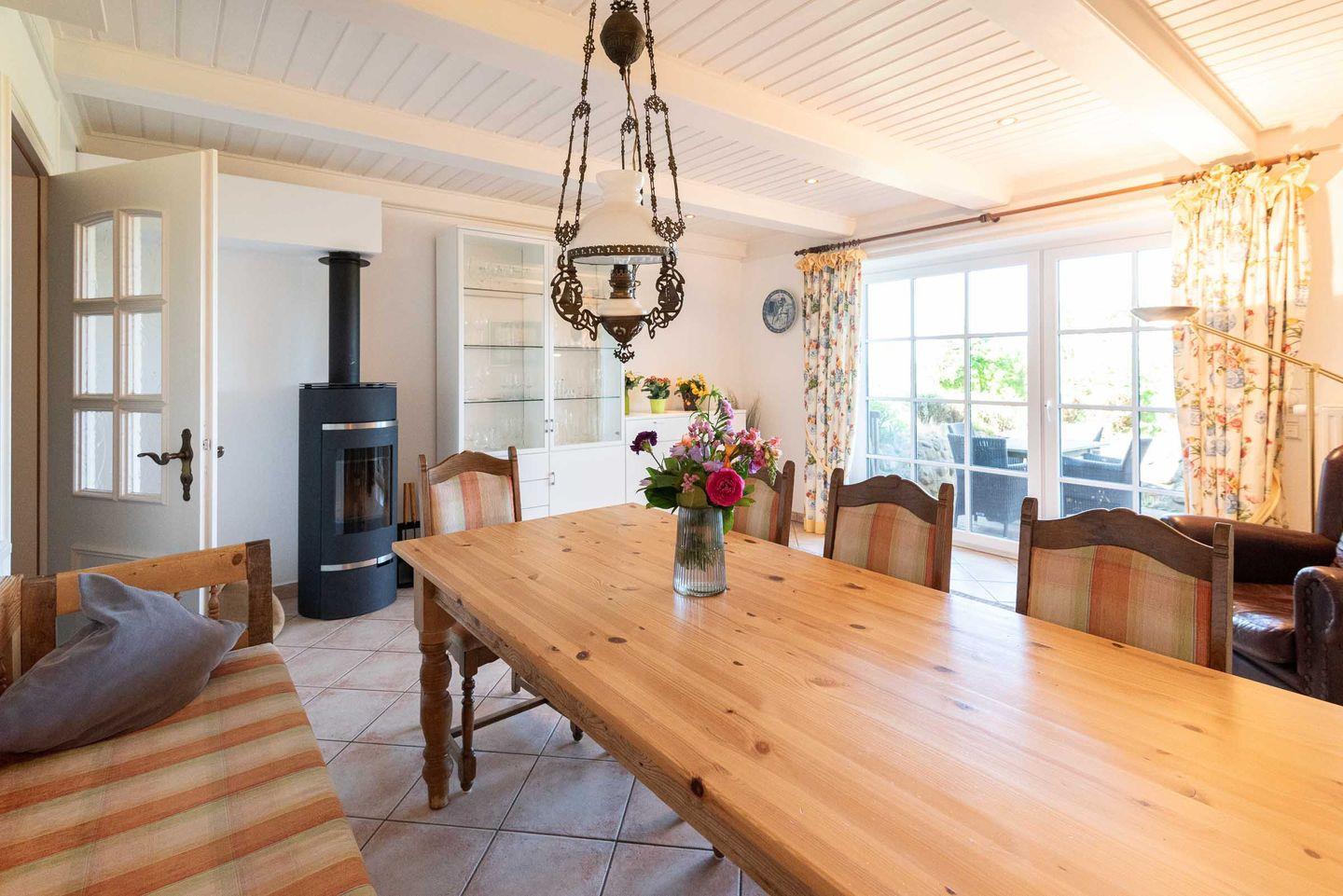 Wohn- und Essbereich: Der Essraum mit Kaminofen ist verbunden mit dem gemütlichen Wohnbereich im Friesenstil. Von hier können Sie in den Garten, sowie auf die beiden möblierten Terrassen treten.