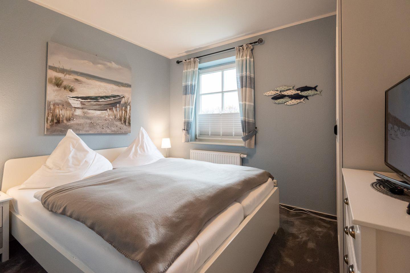 Schlafzimmer 1: Doppelbett (1,60x2,00m) mit TV und Ostfenster.