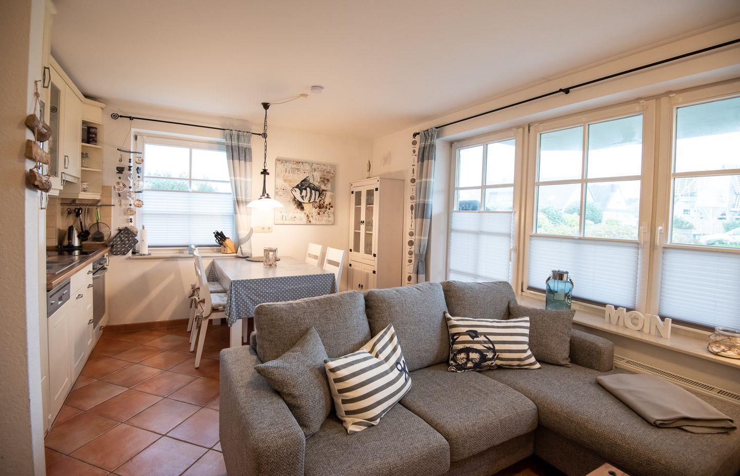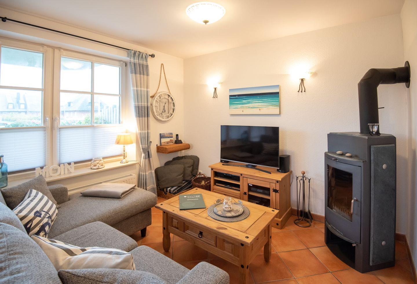 Wohn-/Koch-/Essbereich: Hier befindet sich die integrierte Küche sowie eine gemütliche Ess- und Wohnlandschaft. In der kühleren Jahreszeit genießen Sie den schönen Kaminofen. Die Terrasse mit Strandkorb und Gartenmöbeln sowie der wundervolle Garten schließen direkt an das Wohnzimmer an.