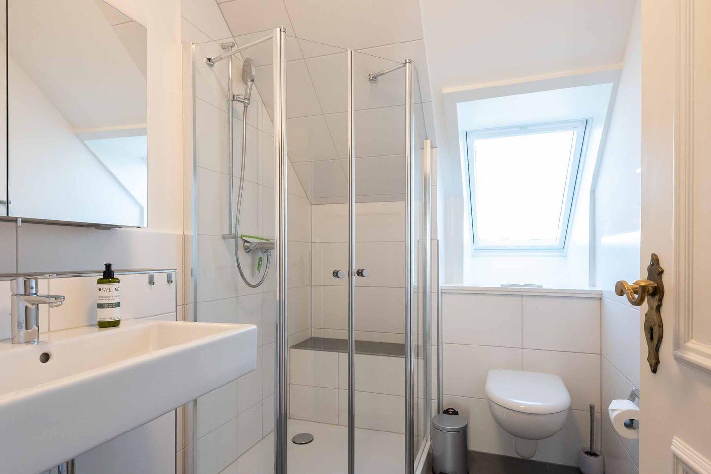 Badezimmer: Helles Duschbad mit WC und Fenster.
