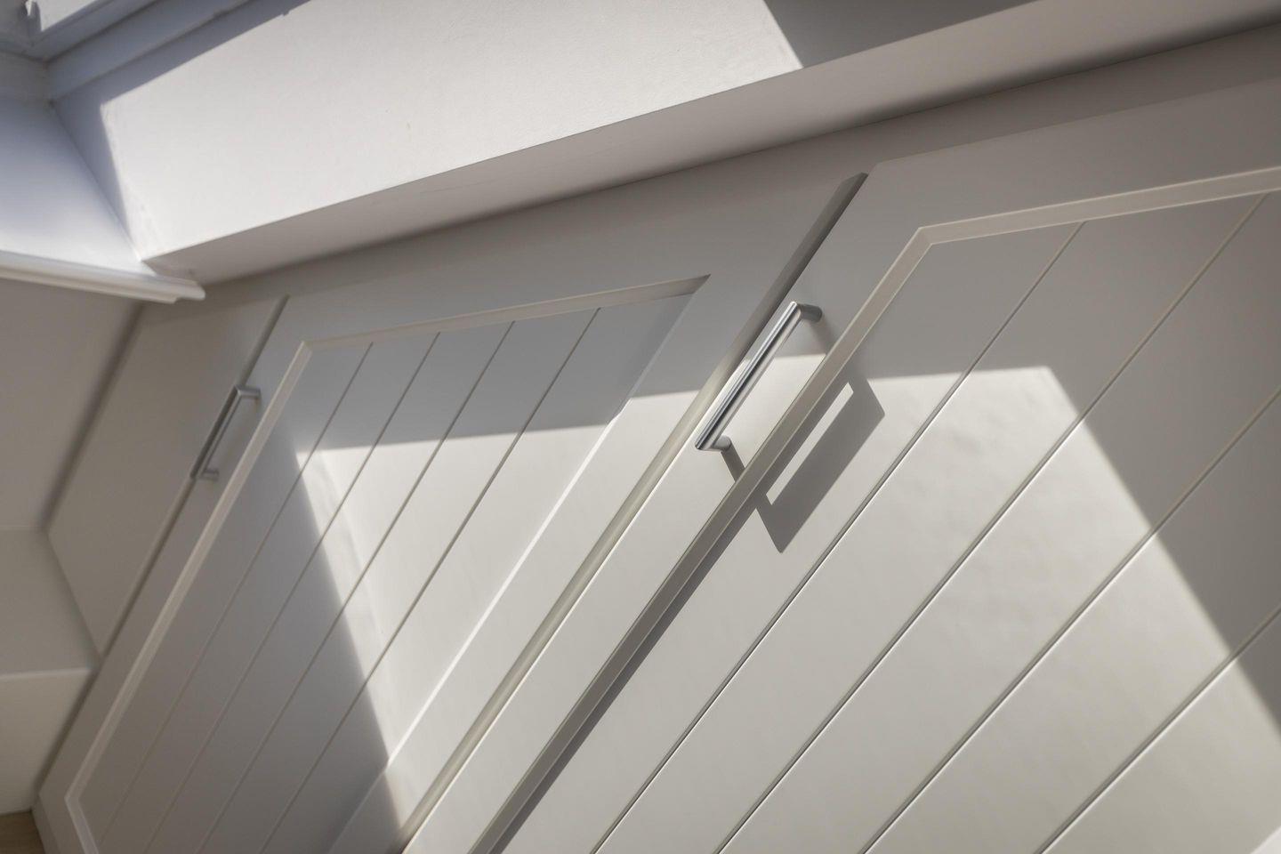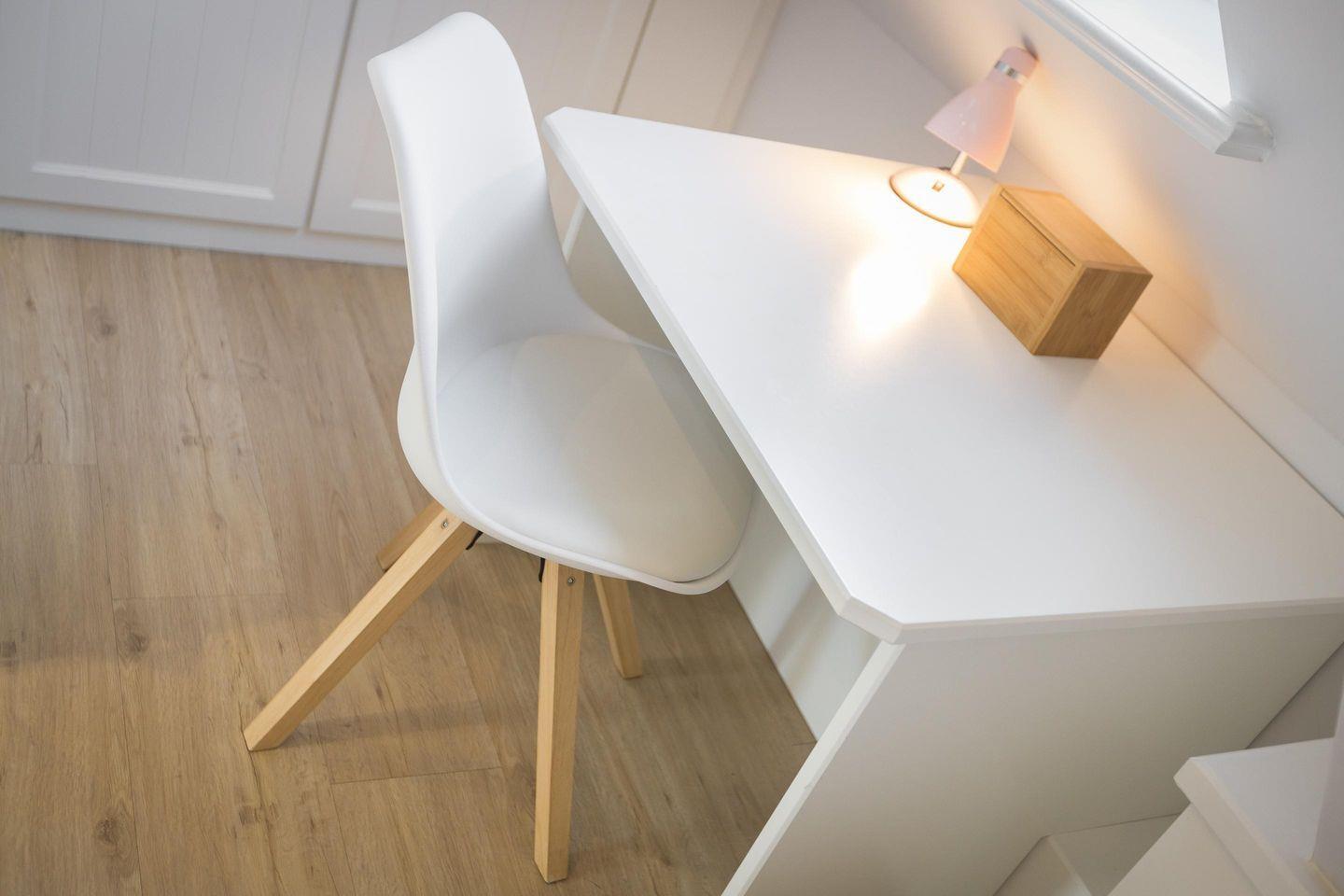 Schlafzimmer 2: Helles Schlafzimmer mit zwei Einzelbetten, einem Sekretär und Einbauschränken.