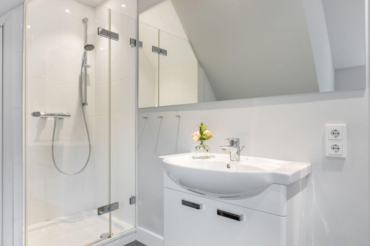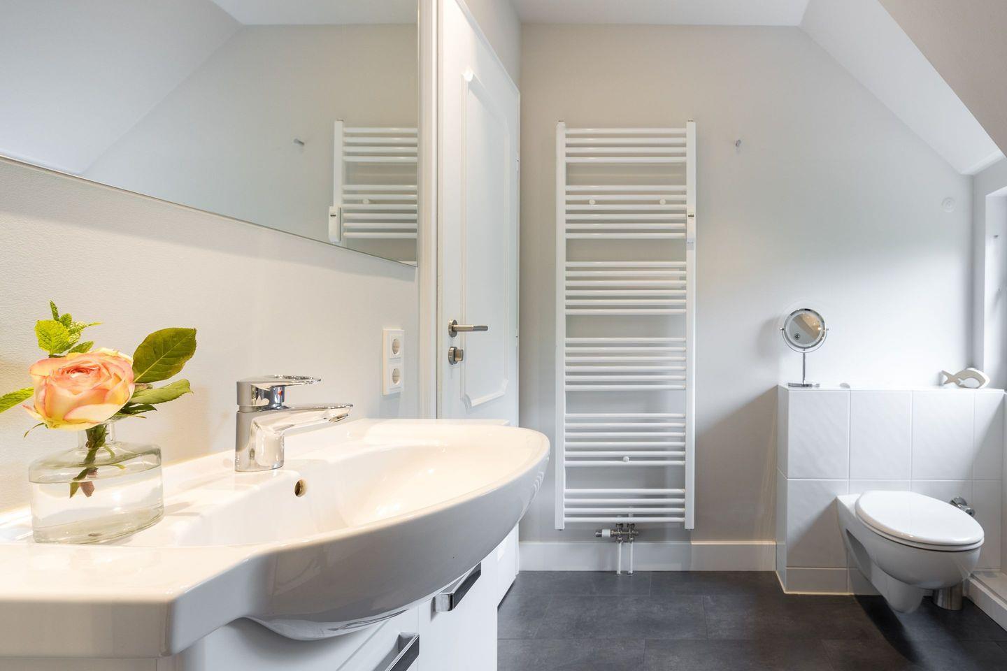 Das Badezimmer ist modern eingerichtet und verfügt über eine Dusche, WC, Föhn und Handtuchwärmer. Die hochwertige Ausstattung sorgt für einen frischen Start in den Tag.